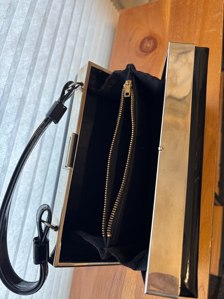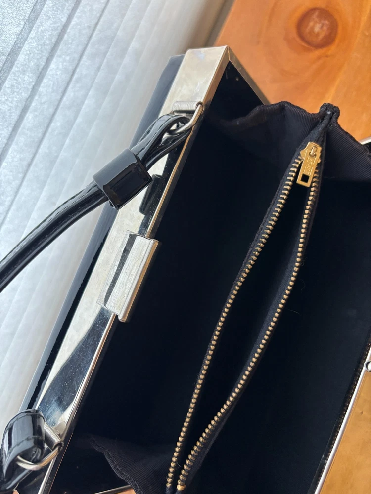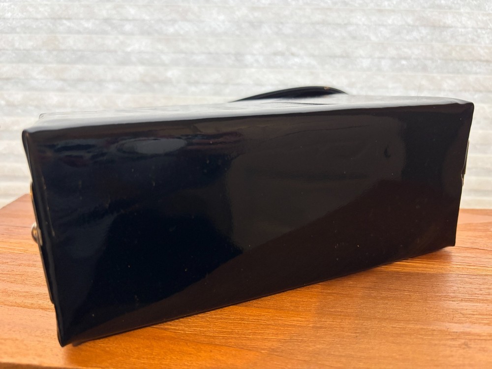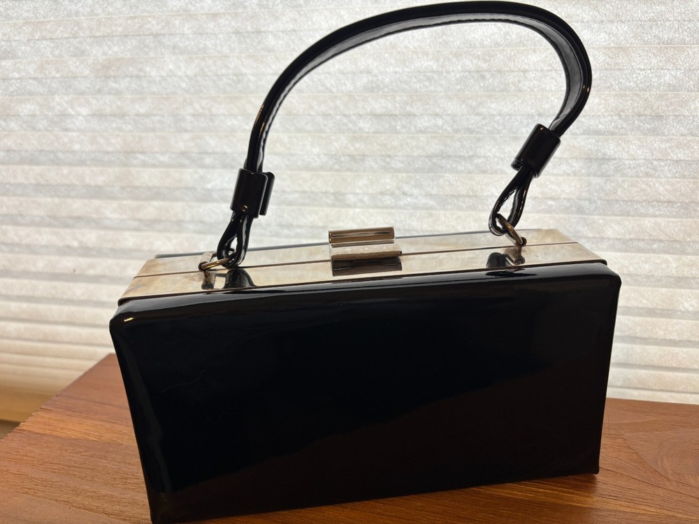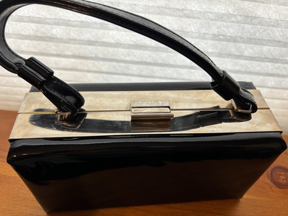 Made of faux patent leather, this original purse features silver trim and a clasp, perfect for a cocktail occasion. The sleek black color adds a touch of retro charm & sophistication to any outfit, making it a stylish accessory for any vintage enthusiast.