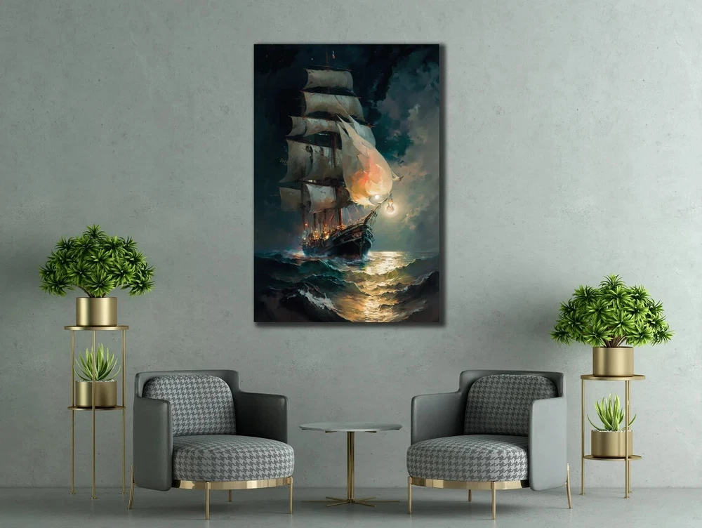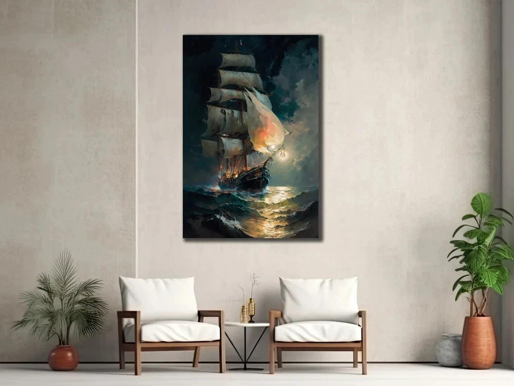 Ship In Night Sea Waves & Sky Painting Unframed Canvas Print Australian Wall Art