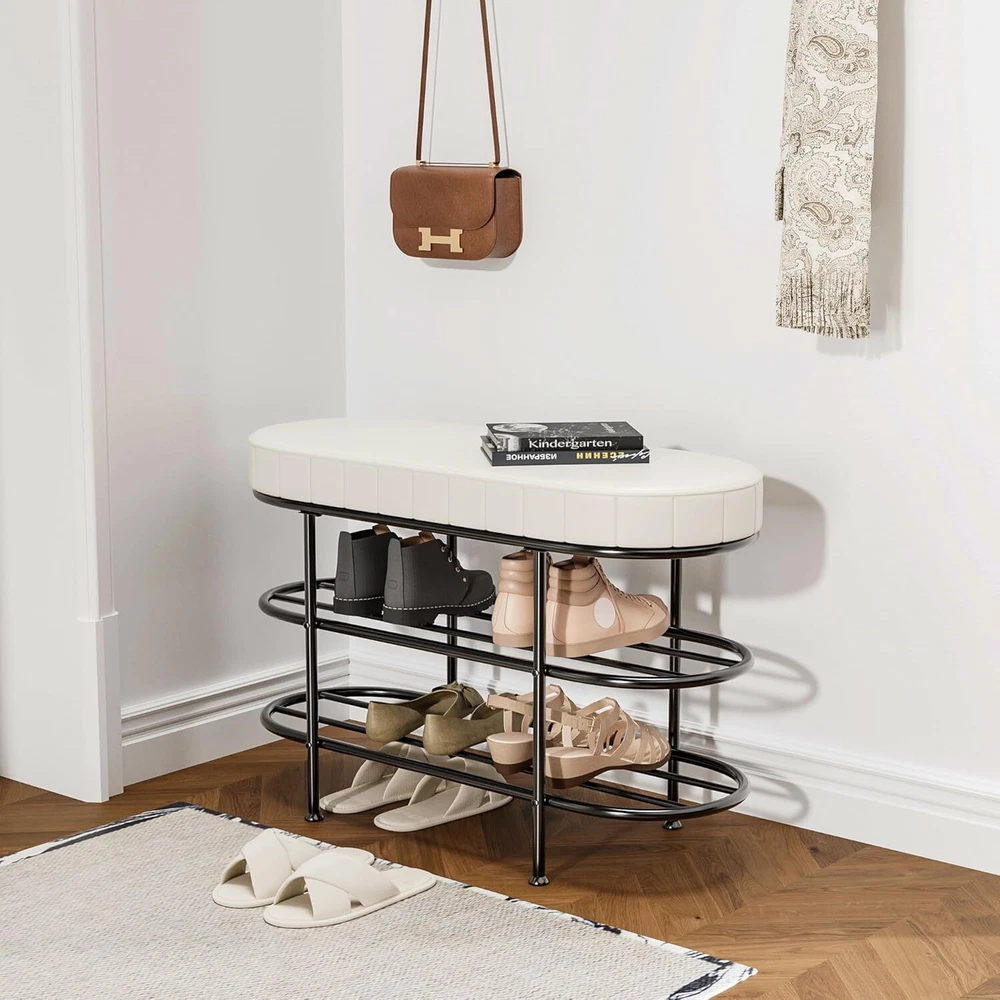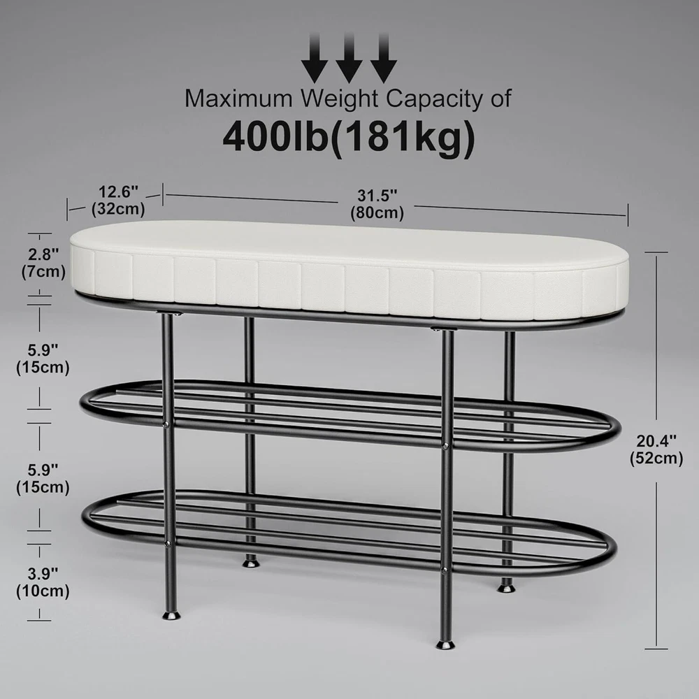 About this item Ultimate Comfort: Gently run your hands over the smooth lid of the entryway bench and sink into the 3-inch thick 25D high-rebound foam, letting you forget about the fatigue after a day of work and making every walk through the door a pleasant experience. With an overall height of 20.47", this shoe bench is ergonomically designed to make putting on shoes and getting up more comfortable. Durable Design:This storage bench is supported by a sturdy steel frame that can confidently hold up to 400 pounds. This design prevents warping. This shoe rack provides a comfortable seat that will stand the test of time, providing a reliable seating option for your hallway or living room. Ample Storage: This entryway bench features a sturdy steel frame with height-adjustable legs, and a bottom shelf that sits 3.9 inches off the ground, offering 3 tiers of shoe storage. Plus, it’s tall enough for your robot vacuum to clean underneath, helping you keep your space tidy and clean. Versatile Use: Suitable for various spaces, including your hall entrance, hallway, bedroom, living room, or terrace, this shoe rack for entryway can also be used as a bench for bedroom. Enjoy its multifunctionality in any part of your home! Easy Maintenance: This entryway bench with storage is designed with an easy-to-clean synthetic leather surface, making maintenance a breeze. Plus, with clear instructions and an assembly tool included, setting it up is straightforward and hassle-free—enjoy it right now!