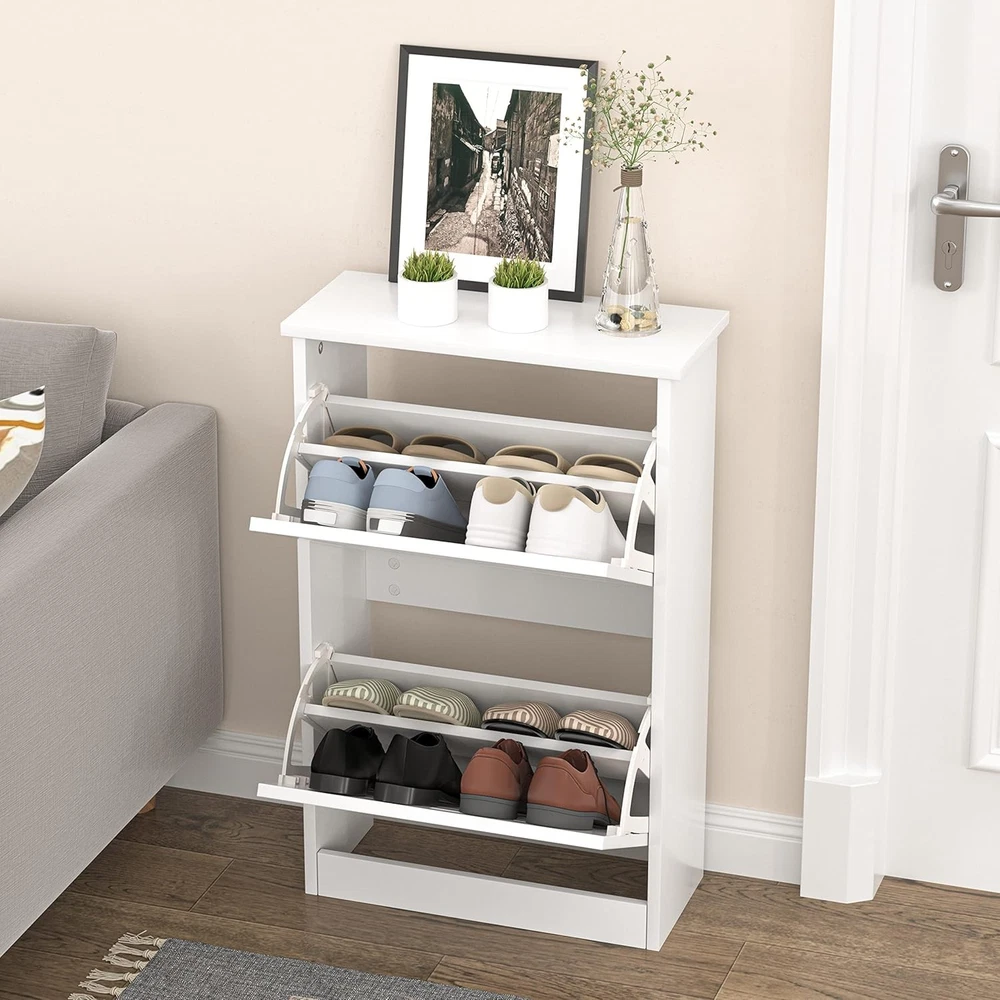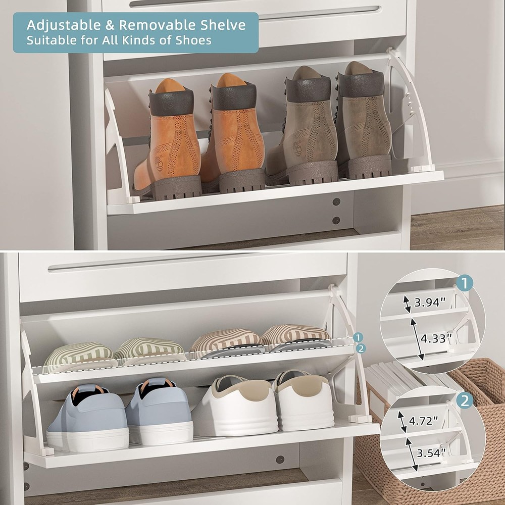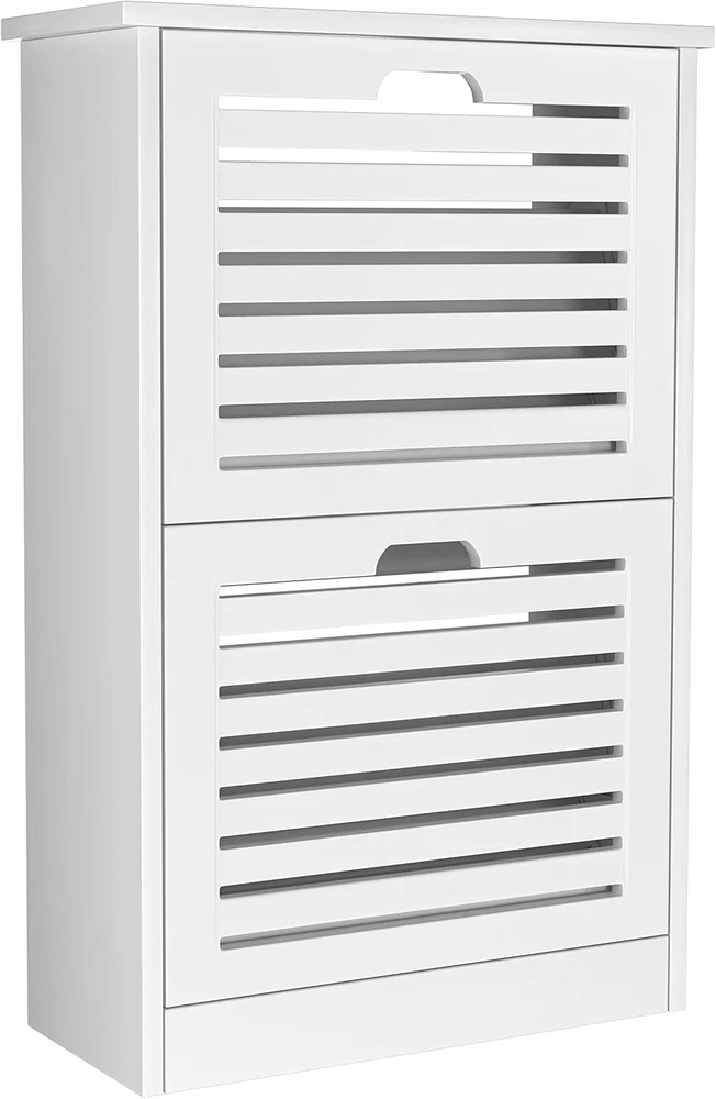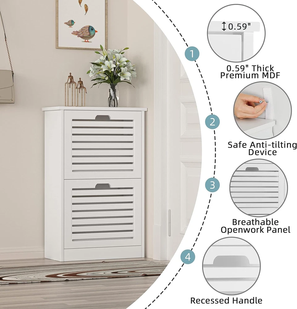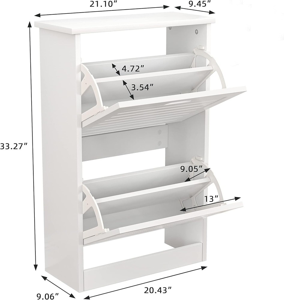 Shoe Storage Cabinet with 2 Flip Drawers, 2-Drawer, White Product Details Brand: TENNTOU Color: White Recommended Uses For Product: entryway shoe storage Product Dimensions: 9.45"D x 21.1"W x 33.27"H Special Feature: Adjustable,Removable Mounting Type: Floor Mount Room Type: Entryway, Bedroom, Hallway Door Style: Shutter Weight Limit: 66 Pounds Included Components: Wood Shoe Storage Cabinet Finish Type: Polished Size: 2-Drawer Shape: Rectangular Number of Shelves: 2 Number of Pieces: 1 Item Weight: 28 Pounds Base Type: Legs Installation Type: Free Standing Shoe Storage Cabinet Top Material Type: Engineered Wood Back Material Type: Engineered Wood Assembly Required: Yes Frame Material: Engineered Wood Number of Compartments: 4 Is Customizable: No Number of Levels: 1 Number of Racks: 2 Manufacturer: TENNTOU Item Weight: 28 pounds Item model number: Shoe Storage Cabinet MaterialStyle: Engineered WoodModern Number of DoorsNumber of Drawers: 22 Openwork Flip Drawer: Compared to those closed shoe cabinets, our shoe storage cabinet with an openwork door, which can keep the air circulation inside better. Flip drawers shoe cabinet can keep the shoes away from dust, keep the room tidy. Besides, The flip drawer ensures you can take your shoes out easily. Large Capacity Shoe Storage Cabinet: TENNTOU shoe cabinet has 2 layers of the flip bucket, each layer of the flip bucket has 2 layers of storage space, the depth of the drawer is 13'', fits for US men's shoe up to size 9.5, providing sufficient storage space, can accommodate about 8 pairs of shoes at least. Free Standing Shoe Rack with Adjustable Shelves: The 2-Tier entryway shoe cabinet can be placed in a narrow space. The interior shelves is adjustable and removable, you can choose whether to adjust or remove the shelf according to the size of your shoes. Easy to Clean & Strudy: This 2 flip drawer shoe cabinet is crafted of MDF with a smooth, easy to clean the surface. And its high-quality wood structure makes sure stability and durability. We are equipped with an anti-falling device behind the shoe rack cabinet for added security. Modern & Fashion: White shoe storage racks is enough to blend with most color palettes and modern designs. This shoe organizer unit is perfect for shoe storage in your entryway, hallway, living room, bedroom, or anywhere in your home.
