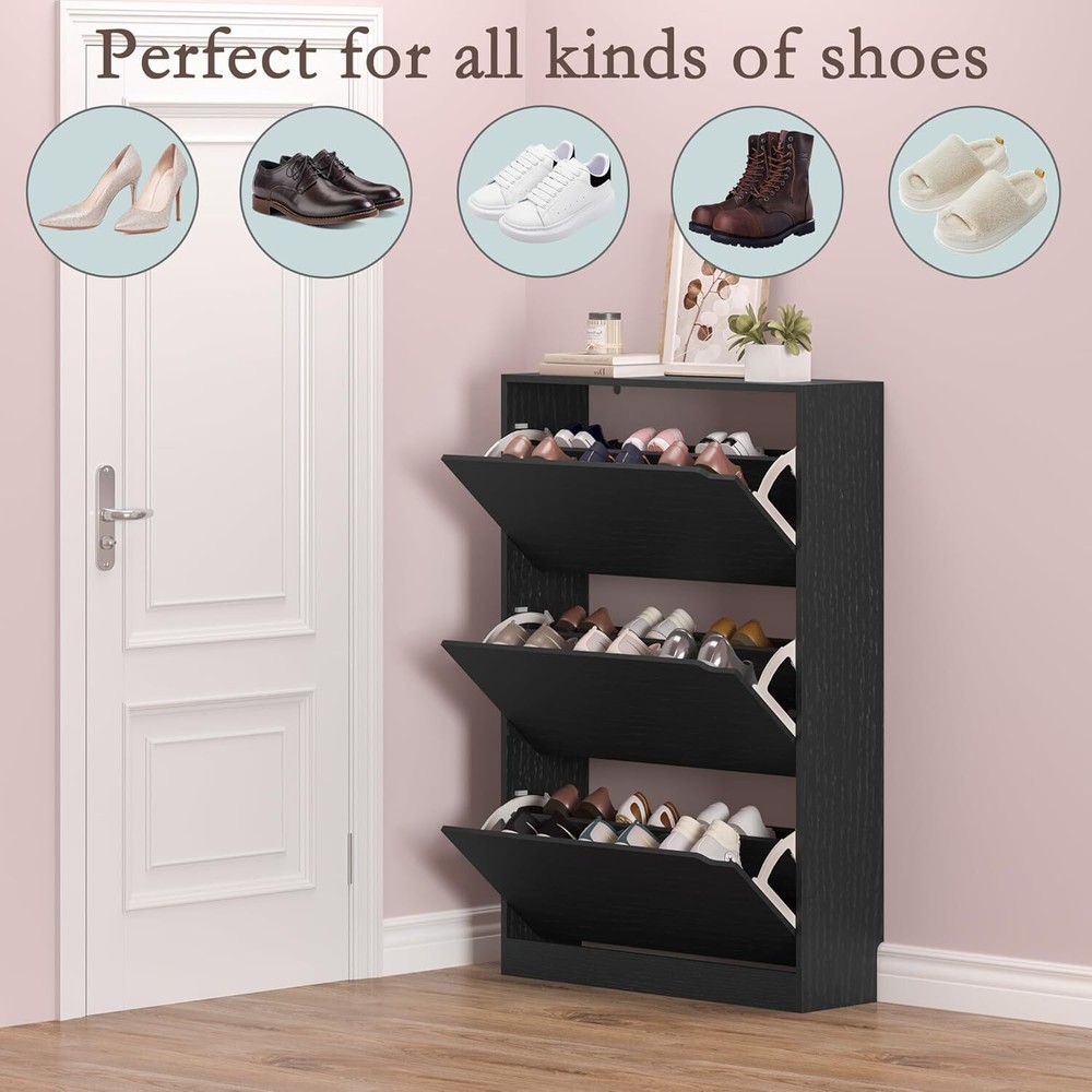 Shoe Storage Cabinet with 3 Flip Drawers,Narrow Shoe Rack Cabinet,Freestanding Organizer Storage for Entryway, Hallway, Black Item Description About this item 【Shoe Cabinet for Entryway】:The hidden shoe storage cabinet with 3 flip Drawers,Black makes it a neat and beautiful finish and looks great,Perfect for placing in the entryway, hallway, living room, or porch, space saving. 【Large Capacity Shoe Cabinet】: The shoe cabinet overall size: 47.24"H × 23.6"W × 9.25"D,The drawer shoe cabinet can store up to 30-36 Pairs,(It depends on the height and size of the shoes). 【3 Flip Drawers Shoe Cabinet】:The freestanding shoe cabinet adopts the design of space-saving flip drawers,this narrow shoe cabinet can be placed in a narrow space,Prevent the embarrassment of losing your shoes and misplacing them and forgetting where they are and cankeep the shoes away from dust. 【Adjustable panel shoe cabinet】:The 3 flip drawers,There are two upper and lower drawers, each drawer contains 2 tiers of storage space. The panel can be adjusted or removed in two grooves to accommodate different heights and sizes of flats, mid boots or heels! on the top, ideal for placing potted plants, ornaments, socks and keys. 【Safe and Easy to Clean】:This slim shoe cabinet contains an anti-tipping device, which can be fixed on the wall to prevent tipping and protect children's safety. This shoe cabinet adopts durable Chipboard with a smoot,the stable structure ensures super load-bearing capacity. Smooth surface prevents scratches due to use and is easy to clean. 【 After-Sales Service and Assembly】:Toppling preventing devices are included for added security and it is easy to assemble. Easy-to-follow instructions and assembly tools provided. A detailed instruction manual are provided. If there is any problem in logistics and transportation, even if the wood board causes 1mm damage, we are willing to replace it for you for free! Just contact us and we will give you a satisfactory answer within 24 hours. › See more product details Payment We accept payment only through PAYPAL Shipping We ship products worldwide through standard express courier service, it will reach within 7 to 10 days to abroad buyers, we ship the product after recieved clear payment and give full information about shipment to the buyer Return We accept product return within 7 to 21 days from delivery date but product should be in original position and not in damaged condition,the return shipping charges will be buyer responsibility