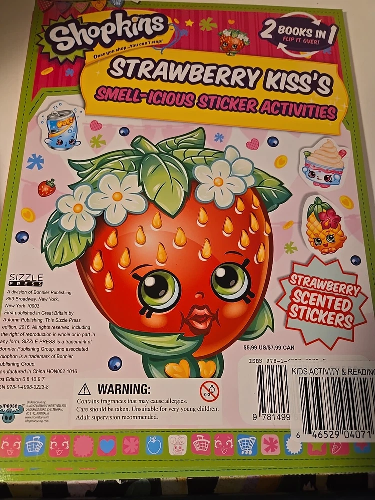 This Shopkins Strawberry Kiss's Smell ious Sticker Activities book is a must-have for any young reader who loves imaginative play and media tie-ins. With 32 pages of sticker book fun, this book is perfect for kids aged 4-12 who are looking for a fun and engaging activity. The book features stickers and activities that are sure to keep kids entertained for hours on end. The book is part of the Shopkins Ser. and was published by Little Bee Books Inc. in 2013. It is a fiction narrative type and is written in English. The book is 11 inches in length, 8.2 inches in width, and 0.2 inches in height. It weighs 5.1 ounces and has a number of pages of 32. This sticker book is perfect for kids who love activity books, imagination & play, and media tie-ins.
