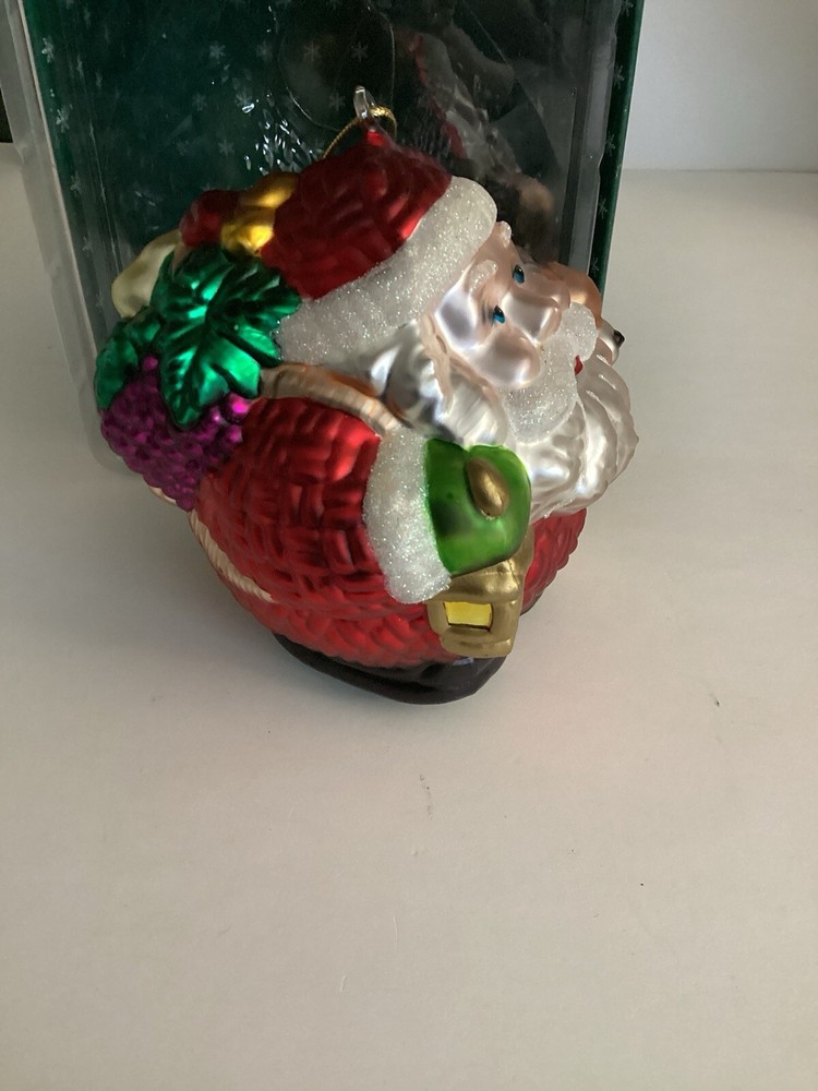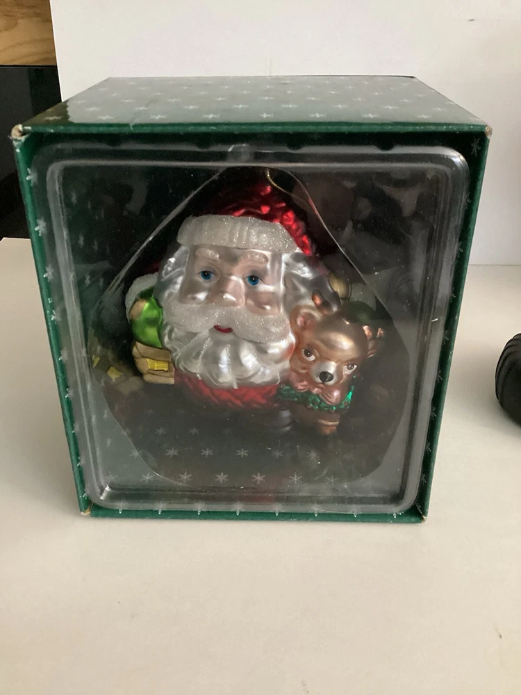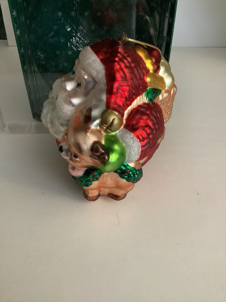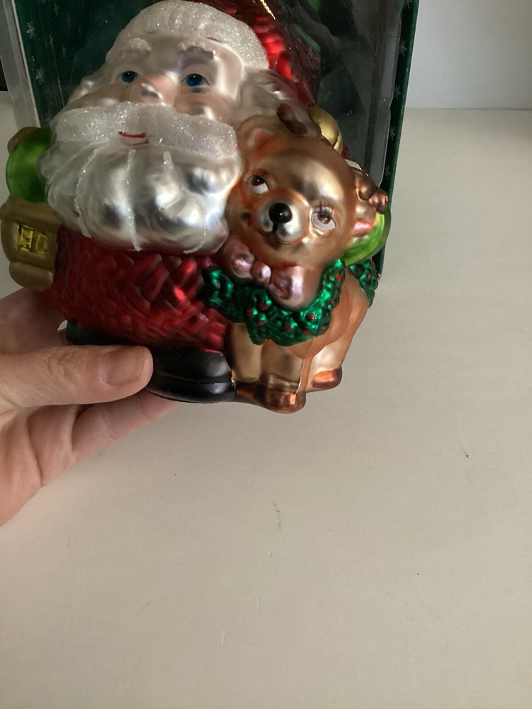 Short And Stout Glass Santa Ornament With Reindeer. This adorable glass ornament features a short and fat round Santa with a cute reindeer standing next to him. He has a basket of goodies on his back. He is approx 5” tall, 5” wide and 5” deep. Comes with the box.
