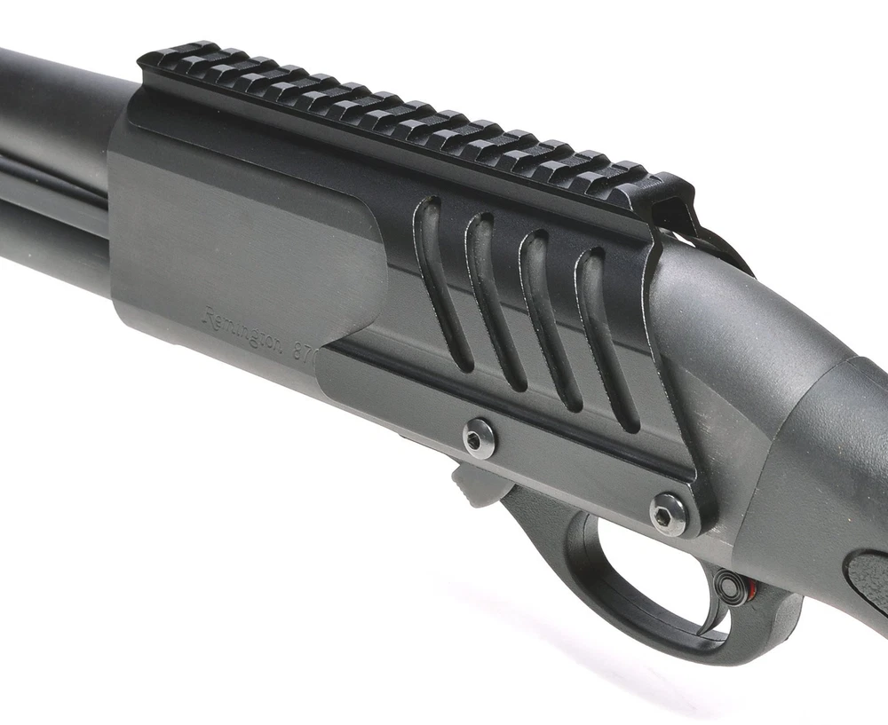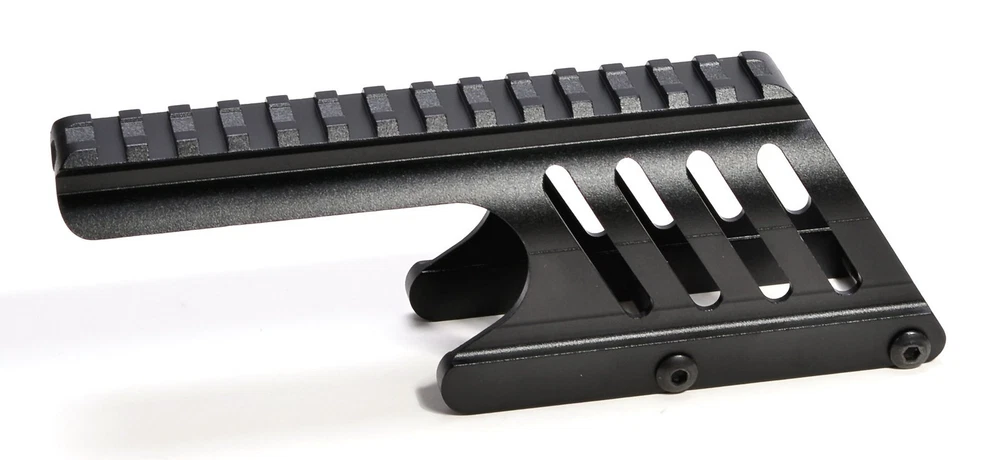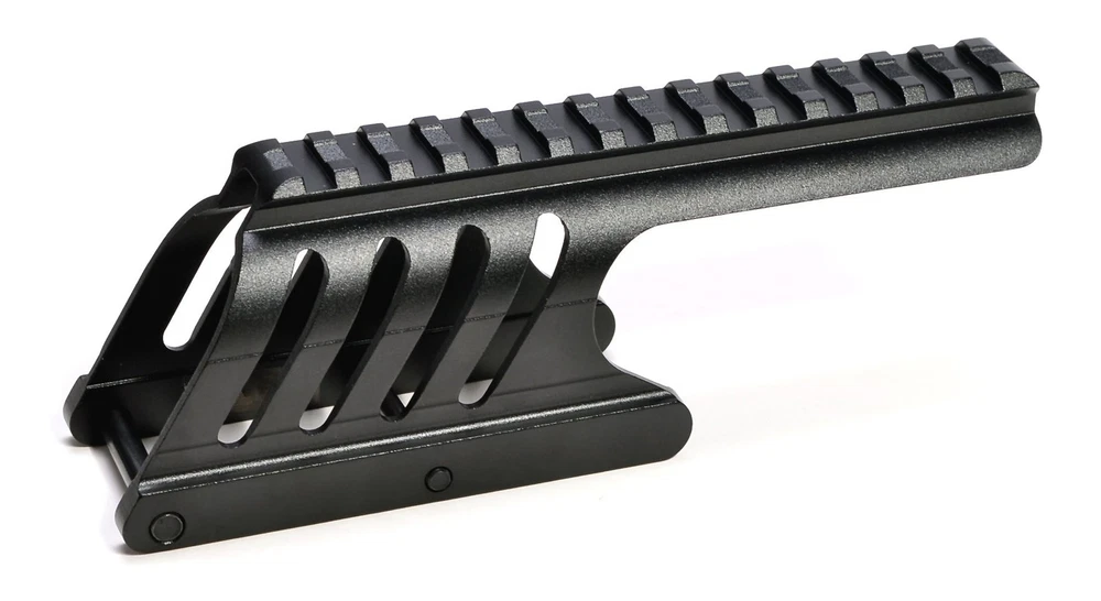 Saddle scope mount for 12GA 870 pump action shotguns. Works with full size scopes and red dot sights with standard Weaver or Picatinny rings Great for slug gun, turkey hunting or tactical shotgun use Easy to install in existing pin ports on the receiver – no gunsmithing or special tools required Solid one piece design of saddle style that straddles both sides of receiver Slotted side walls reduce weight and give attractive and unique style Top Picatinny rail is 6inch long and has 14 ring slots for proper scope or red dot sight placement Machined aluminum alloy body in anodized non-glare matte finish Skeleton slotted side walls to reduce weight One piece saddle design made of solid aluminum alloy Up-to-date top Picatinny rail allows more options of optics placement There is see-thru tunnel underneath top rail that allows use of front bead sight if available Quick and easy to install. No gunsmith needed