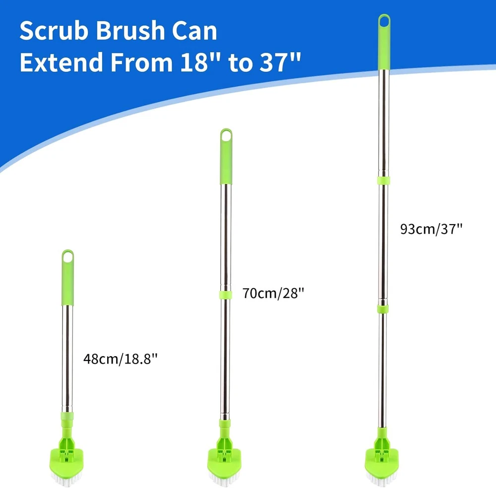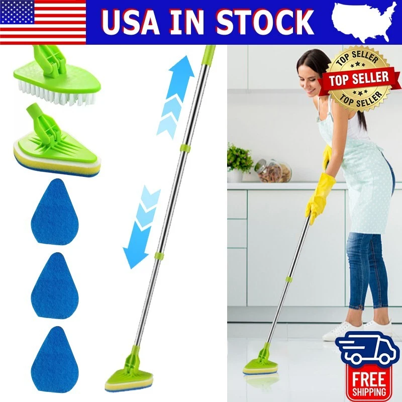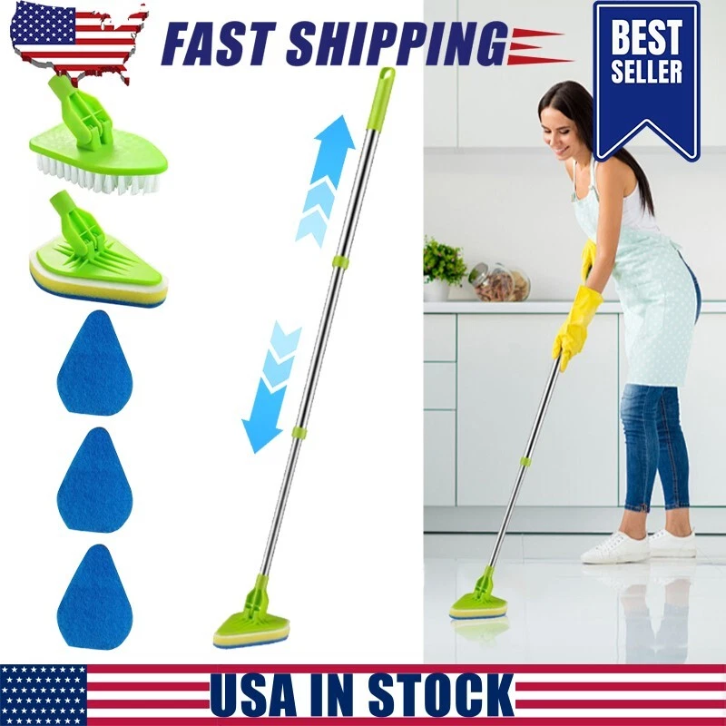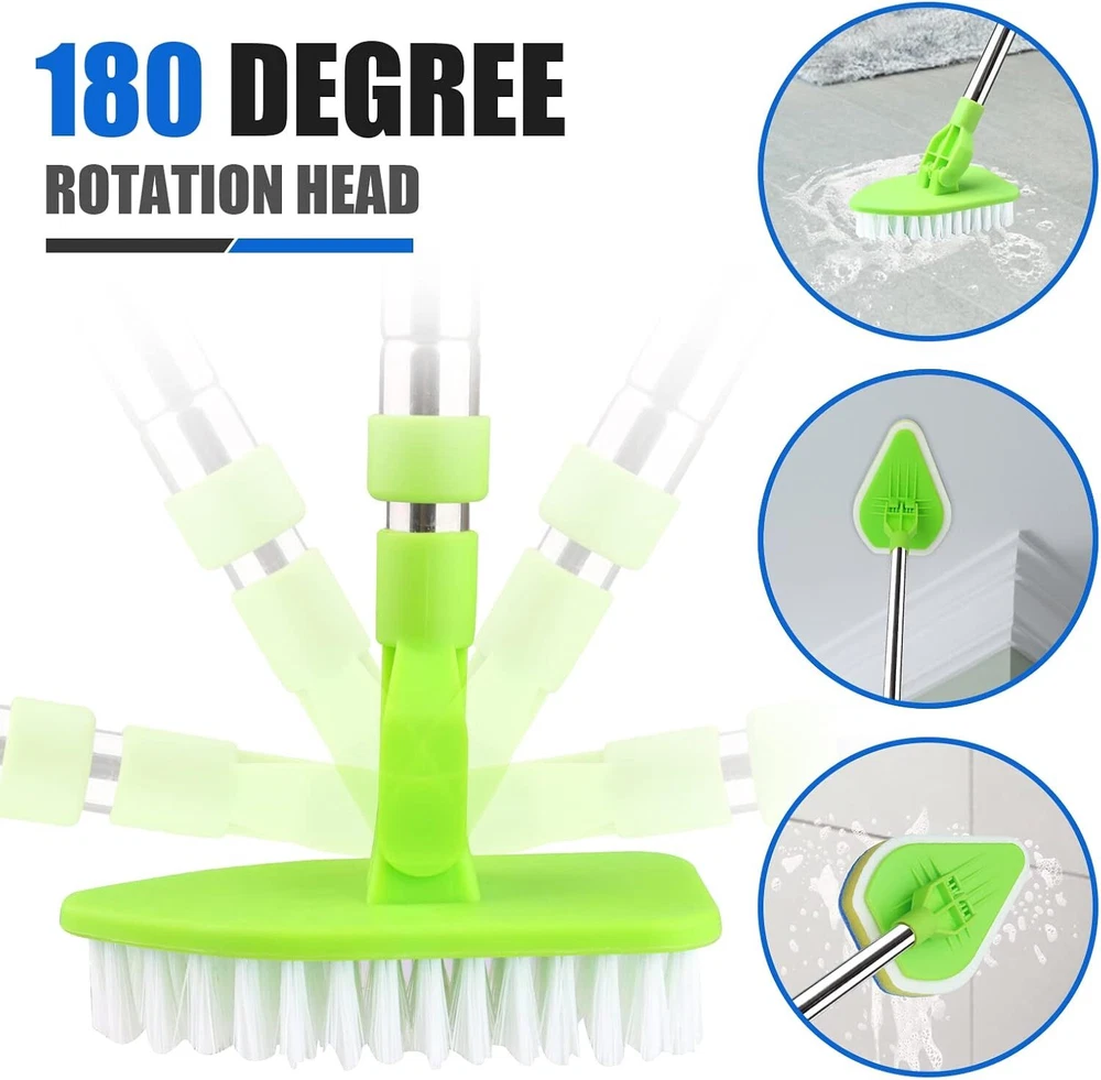 With 2 In 1 Design: Each set of shower cleaning brushes is equipped with a long handle and four brush heads, including a brush and three replacement sponges, which can adapt to your different cleaning needs. Rotatable Brush Head: This floor scrubber has a 180°rotating design, which can help you automatically rotate when cleaning corners. You can easily and quickly clean every corner and circular area without squatting down. Retractable Handle: The shower brush for cleaning has an ergonomically strong and durable steel rod, which can extend from 18" to 35", with a non-slip EVA handle and hook design. Replaceable Brush Head: The cleaning brushes are detachable, and the four brush heads can be used individually to meet your various cleaning needs. The hole on the top can help you store the cleaning brush in a closet or on the wall. Widely Application: The wall cleaner with long handle can be applied to many surfaces and fit into corners while the front bristles are shaped to get into corners, recesses and baseboard. Descriptions: We provide 1 bristle and three sponge brushes. Four cleaning brushes can be detached and replaced. The tile scrubber has an ergonomic non-slip EVA handle, which can be extended from 18" to 35".The scrub brush adopts a triangular and 180° rotating brush head design, which is convenient for you to scrub hard-to-reach corners. Features: 1. Removable Bristles: Three replacement sponge brushes can help you clean different places and make your home cleaner. 2. 180°Rotation: The floor scrubber can achieve 180°rotation, which is easier to clean up sanitary dead corners without squatting. 3. Ergonomic Design: The ergonomic alloy handle is easy to grasp, and the non-slip handle helps you better grasp and receive force. 4. Triangular Head: The triangular brush head can help you clean the corners of the kitchen and bathroom. Specifications: Name: Scrub Brush with Long Handle Material: sponge, aluminum alloy, pp, etc. Product Material: about 11.5*5.5*42.5cm/ 4.53*2.16*16.73'' Packing List: Long Handle*1 Brush*1 Sponge Brush*3