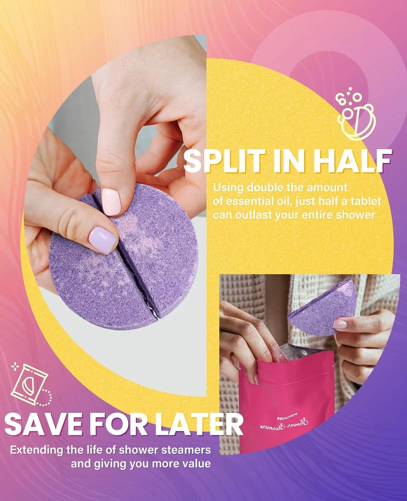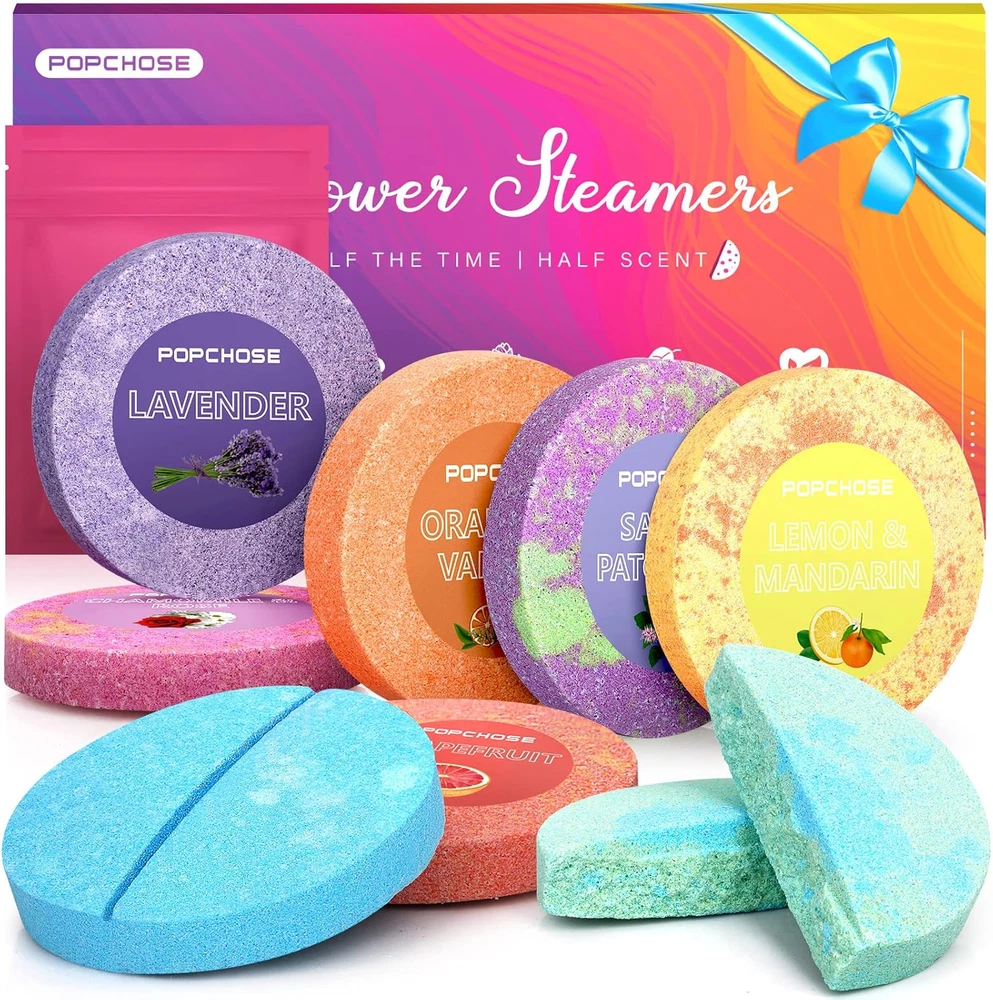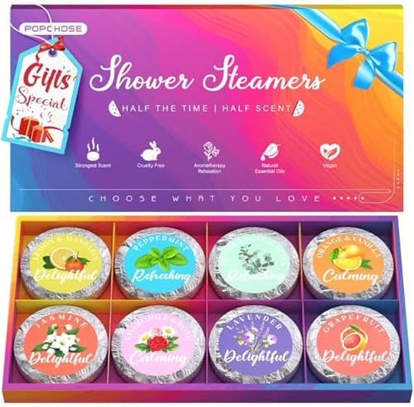 Birthday Gifts For Women -- Gifts for women, ideal for various occasions like halloween, thanksgiving day, christmas gifts, stocking stuffers, weddings, anniversary and especially as self care gifts for women, mom, dad and lover, spa gifts for women, boo basket stuffers for women, allowing you to express appreciation and offer exquisite relaxation through our thoughtfully designed gifts Shower Steamers Aromatherapy -- Discover the revolutionary convenience of splitting Line shower steamers, effortlessly splitting shower tablets for instant use while saving the rest, offering unparalleled practicality and cost-effectiveness, stocking stuffers for adults women within an eco-friendly innovation that minimizes waste. Experience 16 showers for the cost of 8 pack shower tablets, relaxing gifts for women Variety Pack Of 8 Scents Gifts -- shower steamers stocking stuffers choose from an array of 100% natural and organic aromas sourced from fresh plants and fruits, such as soothing Lavender, fragrant jasmine, zesty Lemon & Mandarin, and more. Indulge in a sensory journey with our shower steamers, experience the best of nature's scents, best self care gifts for women. Based on our user survey, our shower steamers are unique gifts for women, popular relaxing gifts for women, bath gifts for women, womens gifts for christmas Long-Lasting Shower Tablets -- Shower Steamers stocking stuffers infused with double the natural essential oils, ensuring silky fizzes and a captivating fragrance that endures, avoiding melting too quickly or residue and damage of delivery either. We absolutely outperform 80% of competitors on the market in the longevity of the aroma. when you chose women gifts, gifts for women, birthday gifts for women, christmas gifts, spa gifts for women, stocking stuffers for adults women, our shower steamers aromatherapy will be a great gift choice Home Spa Gifts for Women-- Let shower steamer aromatherapy stocking stuffers turn your bathroom into an aromatic haven for daily unwinding and rejuvenation, promoting well-being through serene relaxation. Gifts for women, birthday gifts for women, christmas gifts, spa gifts for women, boo basket stuffers for women, stocking stuffers for adults women, christmas gifts for women, gifts for mom, womens gifts for christmas, stocking stuffers for women. Shower bombs bath salt tablets can help you achieve a sense of contentment, emotional balance, and even strengthen your emotional bonds with loved ones Product Description The video showcases the product in use. The video guides you through product setup. The video compares multiple products. The video shows the product being unpacked. 1 for Her 2 for Birthday 3 for Mother 4 for Christmas POPCHOSE Shower Steamers Add to Cart Add to Cart Add to Cart Add to Cart Add to Cart Customer Reviews 4.3 out of 5 stars 1,093 4.3 out of 5 stars 1,093 4.2 out of 5 stars 1,459 4.2 out of 5 stars 1,459 4.3 out of 5 stars 1,093 Price $13.99 $ 13 . 99 $23.99 $ 23 . 99 $13.99 $ 13 . 99 $23.99 $ 23 . 99 $26.99 $ 26 . 99 Benefits Uplifting Relaxing & Holiday Cheer Uplifting Breathe Easily& Stress Relief Relieve Stress Amount included 8 Shower Steamers 16 Shower Steamers 8 Shower Steamers 15 Shower Steamers 16 Shower Steamers The main scent Sage&Patchouli, Lemon&Mandarin Eucalyptus Mint Sage&Patchouli, Lemon&Mandarin Eucalyptus Mint lavender Tablet weight 1.23oz 1.23oz 1.23oz 1.23oz 1.23oz Packaging Gift Box Gift Bag Gift Can Gift Bag Gift Bag