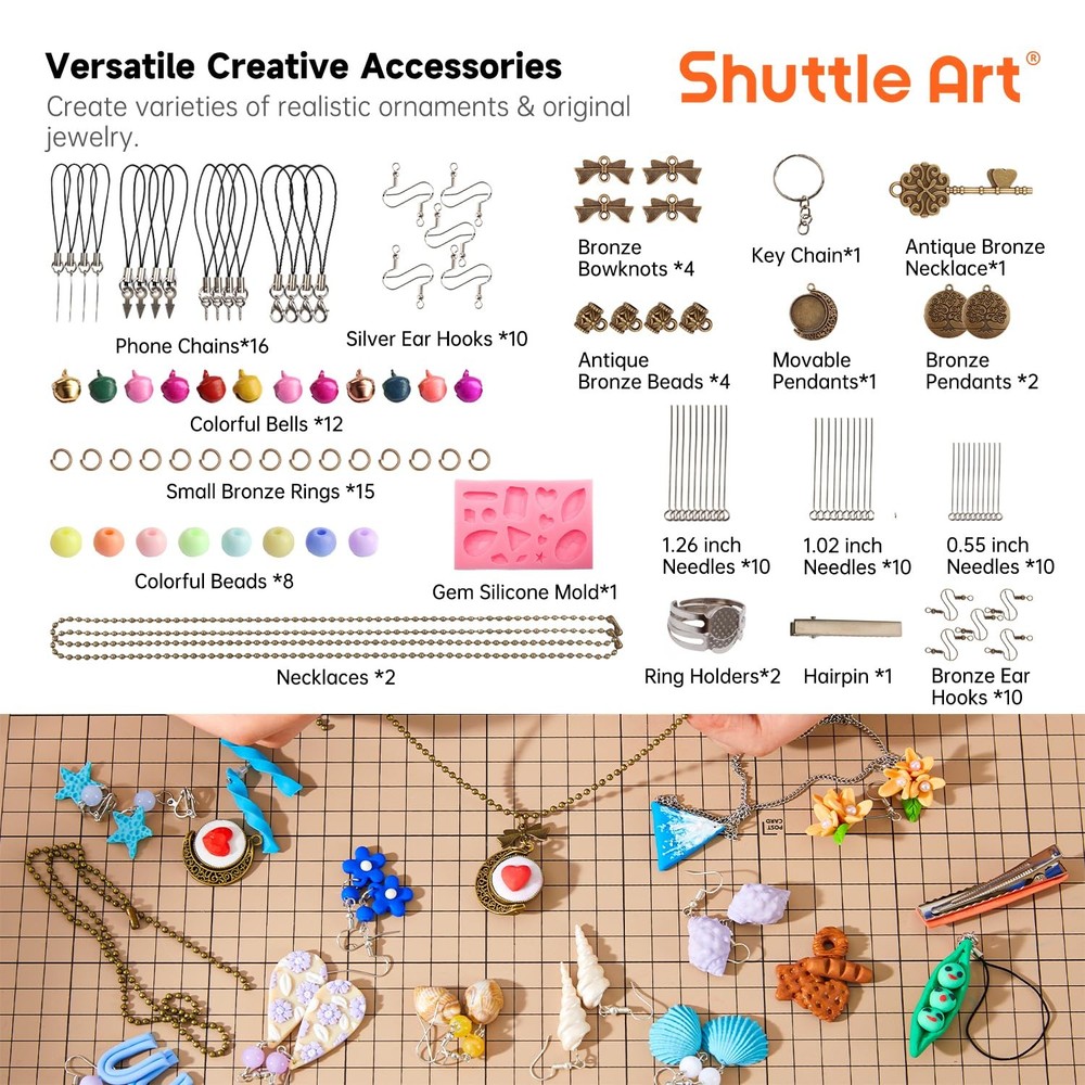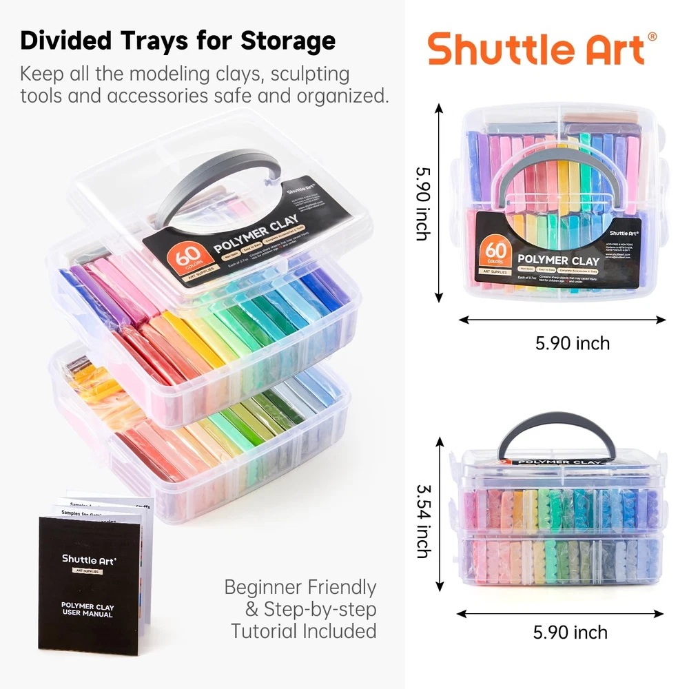 Polymer Clay, Shuttle Art 60 Colors 0.7oz/Block Oven Bake Modeling Clay Kit with 19 sculpting clay Tools and Accessories, Non-Stick, Non-Toxic, Ideal DIY Craft Gifts for Kids 60 COLORS POLYMER CLAY KIT: Shuttle Art polymer clay set contains 60 colors 0.7 oz/block oven bake clay, together with 19 useful clay tools and 16 kinds of accessories. Ideal modeling clay for kids and beginners to make small ornaments, model animals, characters, etc COMPLETE CLAY TOOLS & CREATIVE ACCESSORIES: Comes with complete clay tools, bells, beads, earring hooks, hairpin holder, ring holders, key ring, gem silicone mold, needles, mobile phone chains, user manual and more. Unleash your creativity with 19 polymer clay tools and 16 kinds of accessories to create clay earrings or a necklace with polymer clay beads, an ornament, a jewellery holder, a keychain and more SAFE & GIFTABLE: Strictly Conforms to ASTM D-4236, ASTM F2923-20 & EN71 Standards and Requirements. Non-toxic, non-fragrance, safe and suitable for children age 3+. With a fancy box, it is suitable for giving present on Christmas, birthday and any other festivals. (WARNING: CHOKING HAZARD---Small parts, not for children under 3 yrs.) BAKE METHOD: 1.Oven Bake (Recommend, oven set temperature of 130 ° C (266 ° F) and bake 10-15 minutes). 2.Boil method (suitable small works size in 1/3 inch). 3.Hair Blower Heating (Suitable small works size in 1-2 inch). Don't microwave SERVICE GUARANTEE: Your satisfaction is our top priority, please rest assured to purchase our products. If you are not satisfied with our products or have any questions, please feel free to contact us at any time