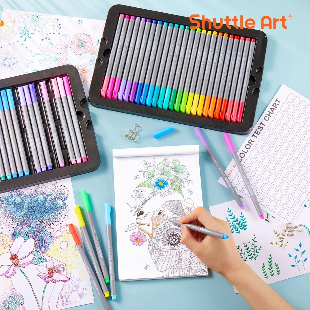 Shuttle Art Fineliner Colored Pens, 100 Colors 0.4mm Fine Point Pens with 8 Stencils & 2 Adult Coloring Books for Coloring, Drawing, Detailing, Writing Note Taking Calendar and Journal Art Projects THE GREAT FINELINER SET AVAILABLE: Shuttle Art Fineliner pack contains 100 unique, brilliant and gorgeous colors with 8 stencils and 2 adult coloring books making it the great set available on Amazon. Fineliner Pen have a 0.4mm extra fine fiber tip and great for sketching, card making, scrap booking, journaling and coloring. COMFORTABLE TO USE: Durable metal-clad tip and ergonomically round shaped barrel makes for a more comfortable grip. Artist quality ink is water-based, fast drying, odorless and blendable without bleeding. It’s safe as well, non-toxic. AMAZING CONVENIENT BOX PACKAGE: Fineliner Pens are organized in 4 individual black trays and stored in an exquisite cardboard box making them convenient to use and portable. Our Fineliner Pen Set is perfect for gift giving. BONUS COLORING BOOKS AND STENCILS: Includes a adult coloring book with stress relieving designs animals, flowers, paisley patterns and so much more. A DIY coloring book to locate colors for your project and free your art creation. 8 Different Stencils help to transform your boring pages into beautiful surprise SERVICE GUARANTEE: Your satisfaction is our top priority, please rest assured to purchase our products. If you are not satisfied with our products or have any questions, please feel free to contact us at any time.