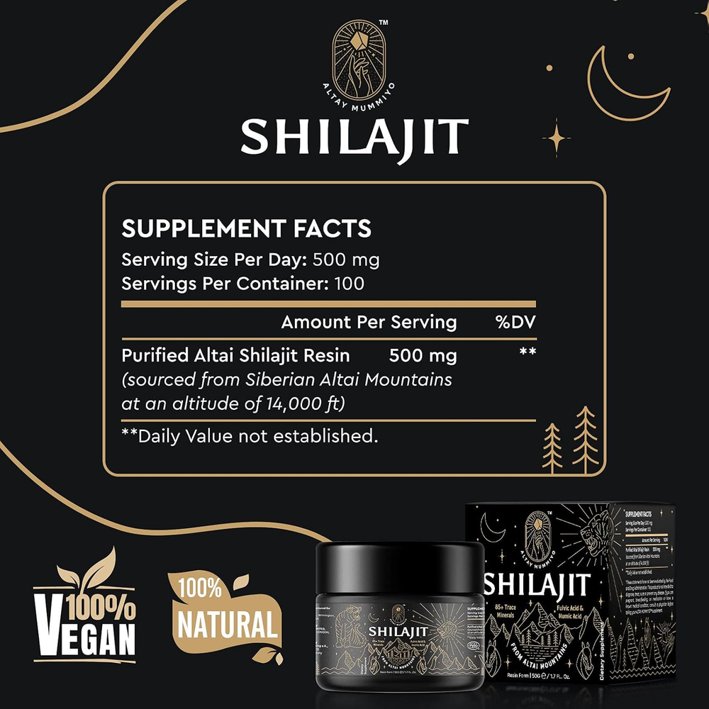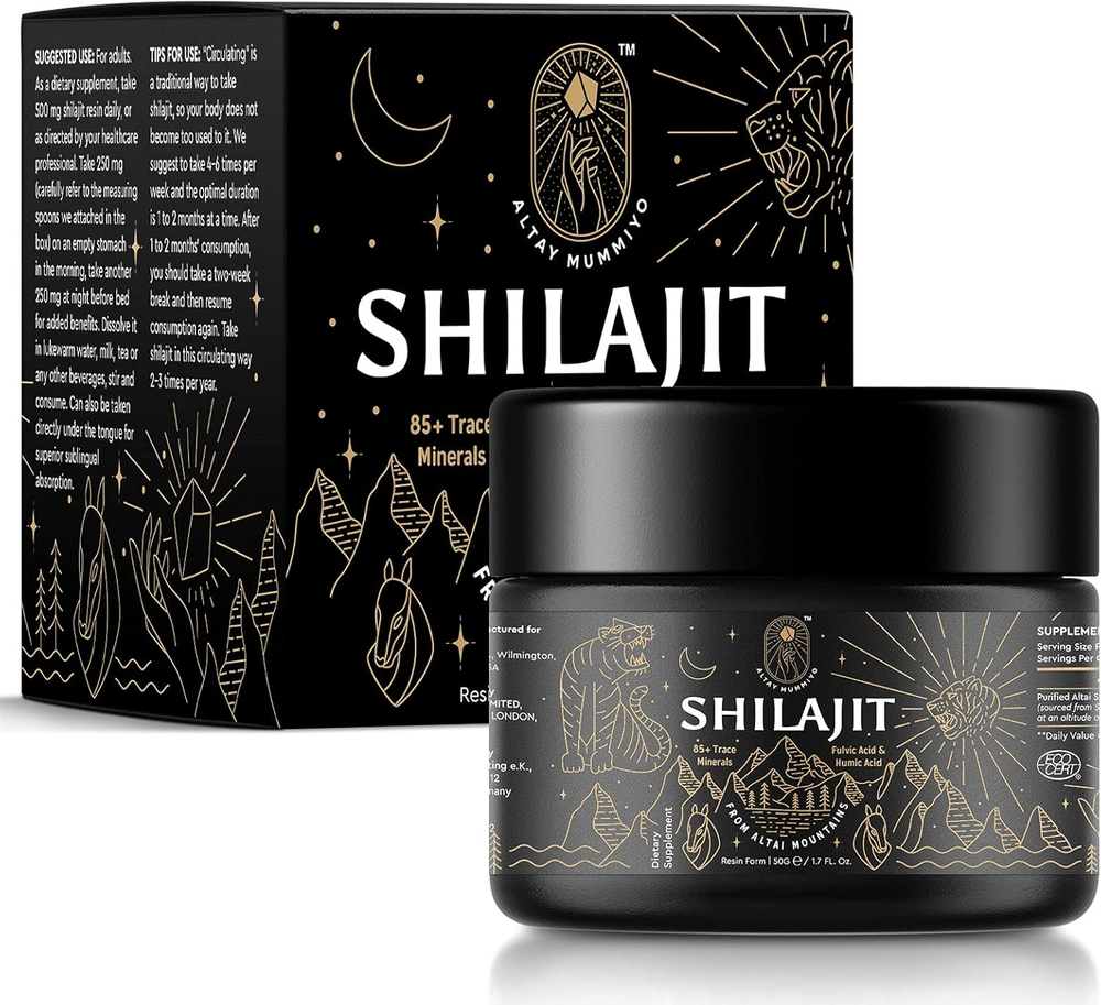 100% PURE GOLD LEVEL SHILAJIT : ALTAY MUMMIYO 100% pure Siberian Altai Gold Grade Shilajit resin directly sourced from Siberian Altai Mountains at an altitude of 14,000 feet. The Shilajit resin wild harvested at this altitude is the premium gold level which has higher content of nutrients and purer than other shilajit products. We are committed to offer the most cost-effective premium Shilajit product for our customers 85+ TRACE MINERALS WITH FULVIC ACID & HUMIC ACID : Providing over 85 types of trace minerals, vitamins, and macro-nutrients as well as being abundant in Fulvic Acid and Humic Acid which are ideal dietary supplements for men and women. Studies shown that these nutrients benefits for daily energy, the immune system and general wellness OVERALL WELLNESS BENEFITS : Shilajit is the world's best source of natural trace minerals and Fulvic Acid. Shilajit is known for avoid chronic fatigue, recovery after a training session, endurance and more focus. Fulvic acid found in Shilajit is good for cell *regeneration EASY TO USE & MAXIMUM POTENCY PROTECTION : We provide measuring spoons and control the Shilajit resin at a 15% moisture capacity to ensure each perfect serving dose. It will effectively make your pure Shilajit resin without drying out. Packaged in security-sealed dark glass jars, which offer maximum protection away from light effect, so that prolong the potency of your Shilajit resin TRADITIONAL PURIFICATION PROCESS : ALTAY MUMMIYO Shilajit is purified at low temperatures using only spring water. That will retain the original minerals and nutritional value of Shilajit to the greatest extent. What you get from us is 100% Pure & Authentic Premium Shilajit resin Product Description ALTAY MUMMIYO Pure Shilajit Resin Many people experience fatigue, anxiety, frequent colds and aches and hormone imbalance. Our bodies endure much stress and unhealthy lifestyle. These will weaken our body's immune system and cause all kinds of health issues. However, a natural way to boost your body has its roots in a tapestry of holistic and traditional history. If you have not heard of Shilajit, it is time to know more about this powerful substance with thousands of years of Ayurvedic tradition behind it. Shilajit is rich in Fulvic Acid & Humic Acid and has more than 85 types of trace minerals, which is why the body can absorb them quickly. They will also transport to the specific areas where the body needs them so that the cells can grow and maintain their health. The primary form of all Shilajit after extraction is liquid. Making it solid requires additional processes through drying. Therefore, the soft resin form of Shilajit that we pack fresh after the extraction is the freshest Shilajit which preserves most of its original properties. 100% Pure, Directly From Siberian Siberian Altai Mountain Shilajit was formed over centuries by the gradual decomposition of plants and micro-organisms due to biological and geological processes. We make sure we source out Shilajit directly sourced from the pristine Altai mountains. Some of the best Altai Shilajit is collected in Siberia where large portions of the mountain range on this site have been untouched by man. ALTAY MUMMIYO Shilajit resin wild-harvested from Siberian Altai Mountains at an altitude of 14,000 feet, which make it a golden level potent. ALTAY MUMMIYO-Quality First ALTAY MUMMIYO Shilajit resin is purified at low temperatures using only spring water with an unique upgraded extraction process. That will retain the original minerals and nutritional value of Shilajit to the greatest extent. DID NOT CONTAINS ANY SUGAR OR MOLASSES. *9 of 10 buyers feels more easier to accpect this taste as their FIRST Shilajit supplement. What you get from us is 100% Pure & Authentic Premium Shilajit resin. No matter what problem you met with our product, please do not hesitate to reach us for best solution. 100% Customers service available within 12 hours for you :) Why We Need Shilajit ? Shilajit contains practically all the elements (including fulvic acid / humic acid & trace minerals) from the periodic table. It is empowered by antioxidants & rejuvenating properties. Unlike an ordinary mineral supplement, Shilajit supplies you with additional nutrients, the fulvic acid component of Shilajit improves mineral absorption and gives you a overall well-being. High absorption and digestion Wound healing and restore skin vitality Metabolism and energy recovery Reduce fatigue and weakness Immune system Antioxidant How to Use Shilajit Resin? Take Shilajit Resin with Measuring Spoon To ensure precise serving, please use our measuring spoon to take 250mg on an empty stomach in the morning, take another 250mg at night before bed for additional benefits. PS: After using the measuring spoon to take shilajit resin, wash and keep it clean and dry. Store shilajit resin and measuring spoon in a cool, dry place. Change the measuring spoon regularly. Methods of Taking Shilajit Resin There are two methods for you to take the daily shilajit. If you prefer simple and effective way of taking shilajit, please directly place it straight under your tongue to achieve better sublingual absorption. Alternatively, you could max it with water (up to 40°C) or other beverages (such as milk, tea, honey, etc.) . The resin will naturally dissolved in water without stirring. Frequency of Taking Shilajit Resin We suggest taking 4-6 times per week and the optimal duration is 1 to 2 months as a period time. After 1 to 2 months’ consumption, you could take a two-week break and then repeat the consumption period again. Take Shilajit in this circulating way 2-3 times per year. TIPS FOR USE: 1. For the first use, if the Shilajit jar is difficult to open, please pour the jar with warm water, then the jar can be open easily. 2. In order to avoid exposing shilajit resin to the air for a long time and keep it in best condition, please cover and seal the product as soon as possible after use and store it at
