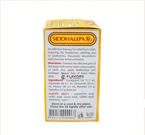 Siddhalepa 50g x 3 Ayurvedic Herbal Balm for Cold, Flu, Headache Reliefer Description :- An effective therapy for relief from colds, sneezing, flu, headaches, swelling due to toothaches, rheumatic discomforts and muscular aches and pains Benefits :- Soothes sports related soreness such as muscle and bone aches. Provides temporary relief from colds and flu. Relieves common pains such as toothaches and headaches. Aids in relieving rheumatic discomfort. Directions :- Foment the affected part of the body with warm water using a piece of cloth. Dry, apply Sidhdhalepa and bandage. Repeat two of three times daily. SHIPPING POLICY:- Items will be shipped within 1 days from Singapore Post after clearance of payment International tracking number will provided. (USA) The item will be shipped to your ebay registration address. Therefore please make sure your 'Ship to' address on ebay is correct. Arrival time depends on your location. (USA - 15 - 30 Days) Other Countries (15 - 35 Days) For the delivery to you take more days. It's may be too longer according to postal service process, custom process, Holiday, Weather, or any other unexpected reason. If you don't received your package according to this schedule, please do not hesitate to communicate with us. Import duties, taxes and charges are not included in the item price or shipping charge. These charges are the buyer?s responsibility. Therefore please check with your country's customs office to determine what these additional costs will be prior to bidding/buying. Also, before buying please check your country import restrictions. PAYMENT POLICY:- We accept Payoneer, Visa, MasterCard, American Express RETURN POLICY:- Domestic and International returns are accepted within 30 days. We will try our best to resolve any dispute. Also if you?re not satisfied with our product, please contact us through ebay "Ask Seller Questions" We consider any offer and full refund for any item excluding shipping cost (if you have asked fast shipping method) ABOUT US:- Our goal is provide high quality product & excellent service for our buyers with competitive prices. Your satisfaction is our pleasure. Your positive feedback will encourage us.
