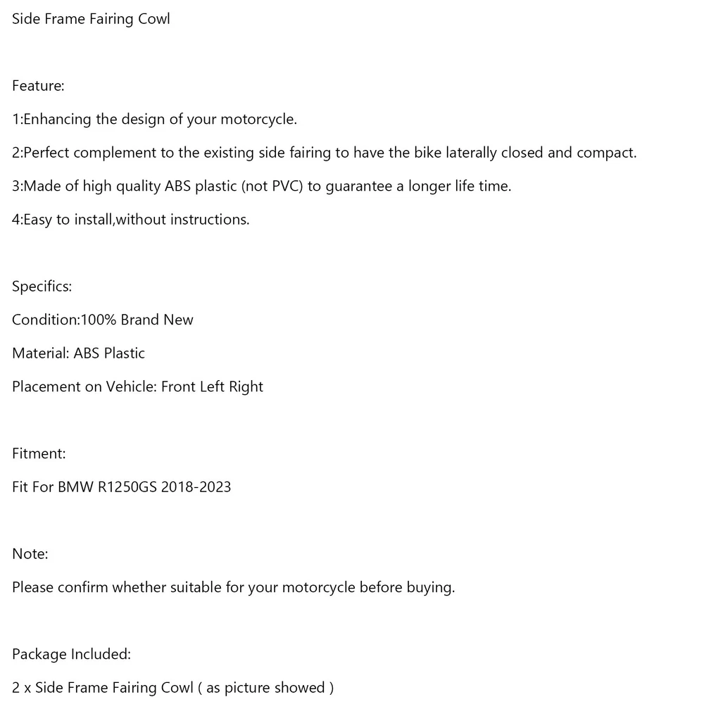 You may also like Gas Tank Cover Trim Fairing Cowl For Yamaha MT-09 MT09 FZ09 2017-2020 Carbon 165.85 USD Free shipping Fairing Kit Bodywork ABS fit For Ducati 1098 1198 848 2007-2011 429.0 USD Free shipping Fairing Windshield Side Wing Wind Deflector For Touring Road Glide 2015-2021 BLK 25.85 USD Free shipping Injection Fairing Kit Bodywork Plastic ABS fit For BMW S1000RR 2019-2022 739.0 USD Free shipping ABS Injection Plastic ABS Fairing Fit for Yamaha YZF R1 2012-2014 Grey Black 479.0 USD Free shipping Windshield Headlight Bezel Upper Fairing fit For Indian Scout 2015-2022 193.85 USD Free shipping Fairing Kit Bodywork ABS fit for Honda CBR600RR 2007 2008 Orange black 488.0 USD Free shipping Fairing Injection Plastic Kit Matt Black Fit For Suzuki GSXR600/750 2006-2007 UE 449.0 USD Free shipping ABS Injection Plastic Kit Fairing Fit for Yamaha YZF R1 2007-2008 Black Red UE 509.0 USD Free shipping Injection Fairing Kit Bodywork ABS fit For Honda CBR600 RR 2007 2008 Black 489.0 USD Free shipping Engine Guard Frame Slider Crash Pad Protector Black For Honda Cbr1000Rr 08-2017 21.85 USD Free shipping Fairing Injection Plastic Body Kit Fit For YAMAHA YZF-R6 2006 2007 Blue Black 509.0 USD Free shipping Side Frame Fairing Cowl Feature: 1:Enhancing the design of your motorcycle. 2:Perfect complement to the existing side fairing to have the bike laterally closed and compact. 3:Made of high quality ABS plastic (not PVC) to guarantee a longer life time. 4:Easy to install,without instructions. Specifics: Condition:100% Brand New Material: ABS Plastic Placement on Vehicle: Front Left Right Fitment: Fit For BMW R1250GS 2018-2023 Not suitable R1250GS ADV Note: Please confirm whether suitable for your motorcycle before buying. Package Included: 2 x Side Frame Fairing Cowl ( as picture showed ) -About US Founded in 2012, VIPJQ have professional development and sales, and are involved in various products, providing customers with various high-quality products. Since its establishment, VIPJQ has always adhered to the service concept of "customer first" and the management concept of "pursuit of quality", and is committed to providing customers with high-quality original designs. We commit to provide you the best innovative, quality products & professional services with competitive prices. We value every customer, and we look forward to providing solutions for your business needs to help your business achieve its goals, please contact us immediately! We are all about you! We are a Japanese seller,but with large warehouse in USA. We are profesional on Auto Parts,Car Parts,Motorcycle Parts,3C,other hot sale items and so on. We aim to provide to customers high quality product and best service. -About Shipment&Returns The item usually will be dispatched within 3 days after you ordered.All are free shipping. And it usually takes 3-10 working days to delivery depends on buyers' address or other majeure on the way. If you are not satisfied with the items and want to return the item,we hope you could message us first,we will give you the return details, we think we could give you the best service to save your time and money.Thank you. -About Feedback&Customer Service If you are enjoy your shopping here,not only enjoy the items but also the service,we are appreciate you could give us a 5-star feedback. If you are not satisfied with the item,before you give us the negative feedback,we hope we could give you the best solution through our commutication. We think we could do it if you give us the chance.Thank you.