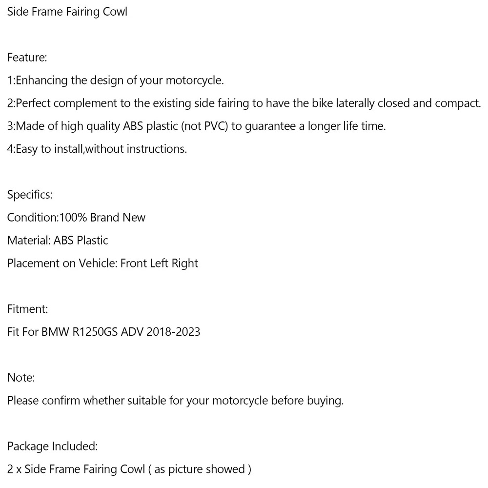 You may also like Pair CNC Alu Frame Plug Cap for Ducati Scrambler 400/800/1100 Hypermotard 15-20 17.85 USD Free shipping Universal Motorcycle CNC Carbon Fiber 8mm Swingarm Sliders Spools US 19.85 USD Free shipping Goldwing Chrome Fairing Control Accent Fit Honda GL1800 GL 1800 2001-2011 17.91 USD 18.85 USD Free shipping 5% off Black Engine Guard Bracket Fixed Fastening for Honda MSX125/SF Grom 2013-2019 ↪ 29.85 USD Free shipping Aluminum Motorcycle Motorbike 20mm Funnel Engine Oil Filler Universal - Black US 16.96 USD 17.85 USD Free shipping 5% off Brake Clutch Reservoir Cover Cap For BMW R Nine T/Scrambler/Urban/Racer 17-21 GD 23.85 USD Free shipping 158x Motorbike Purple Fastener Clip Screw Kit Windscreen Fairing Bolt Universal 18.86 USD 19.85 USD Free shipping 5% off 20 Pack Motorcycle Rubber Grommets Assortment Fit for Honda Fairing Universal 16.85 USD Free shipping CNC Billet Rear Chain Guard Protector Cover For Suzuki DRZ125/400S/400SM US 21.85 USD Free shipping 2 pieces Battery Left Side Cover ABS Clips Fits Sportster 04-18 XL883 XL1200 US 9.36 USD 9.85 USD Free shipping 5% off Gold Oil Filler Plug Cap For BMW R nine T/Pure/Scrambler/Urban 2014-2021 14.85 USD Free shipping Front Chrome Headlight Cover Trims For Honda Goldwing Gold Wing GL1800 06-14 UE 35.85 USD Free shipping Side Frame Fairing Cowl Feature: 1:Enhancing the design of your motorcycle. 2:Perfect complement to the existing side fairing to have the bike laterally closed and compact. 3:Made of high quality ABS plastic (not PVC) to guarantee a longer life time. 4:Easy to install,without instructions. Specifics: Condition:100% Brand New Material: ABS Plastic Placement on Vehicle: Front Left Right Fitment: Fit For BMW R1250GS ADV 2018-2023 Note: Please confirm whether suitable for your motorcycle before buying. Package Included: 2 x Side Frame Fairing Cowl ( as picture showed ) -About US Founded in 2012, VIPJQ have professional development and sales, and are involved in various products, providing customers with various high-quality products. Since its establishment, VIPJQ has always adhered to the service concept of "customer first" and the management concept of "pursuit of quality", and is committed to providing customers with high-quality original designs. We commit to provide you the best innovative, quality products & professional services with competitive prices. We value every customer, and we look forward to providing solutions for your business needs to help your business achieve its goals, please contact us immediately! We are all about you! We are a Japanese seller,but with large warehouse in USA. We are profesional on Auto Parts,Car Parts,Motorcycle Parts,3C,other hot sale items and so on. We aim to provide to customers high quality product and best service. -About Shipment&Returns The item usually will be dispatched within 3 days after you ordered.All are free shipping. And it usually takes 3-10 working days to delivery depends on buyers' address or other majeure on the way. If you are not satisfied with the items and want to return the item,we hope you could message us first,we will give you the return details, we think we could give you the best service to save your time and money.Thank you. -About Feedback&Customer Service If you are enjoy your shopping here,not only enjoy the items but also the service,we are appreciate you could give us a 5-star feedback. If you are not satisfied with the item,before you give us the negative feedback,we hope we could give you the best solution through our commutication. We think we could do it if you give us the chance.Thank you.