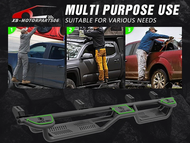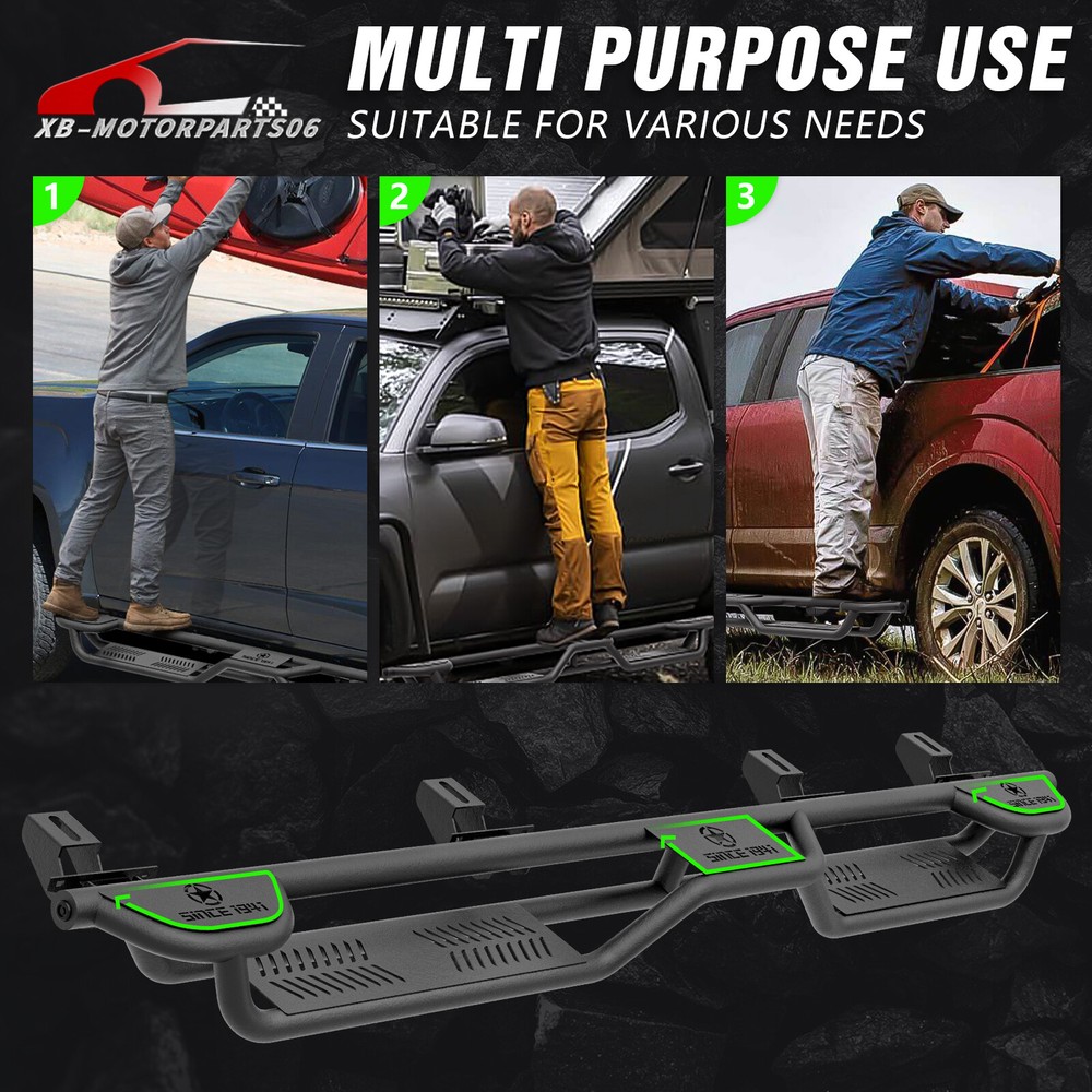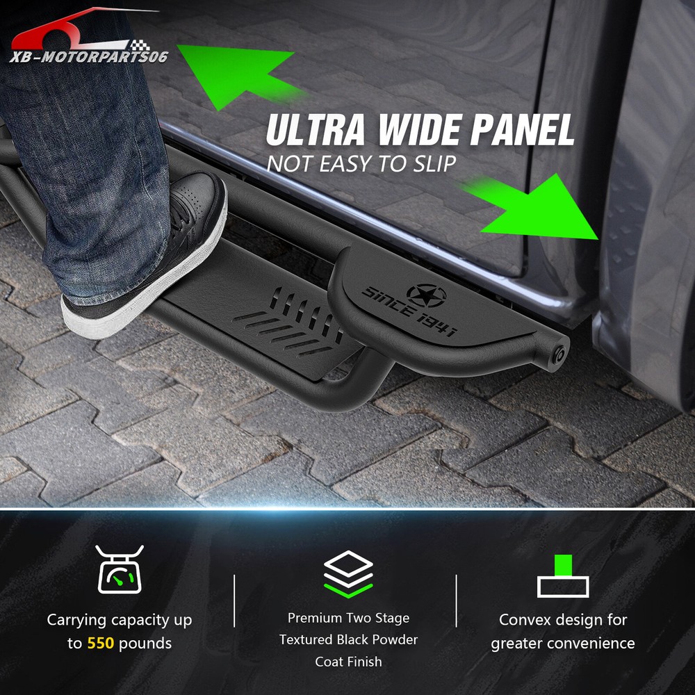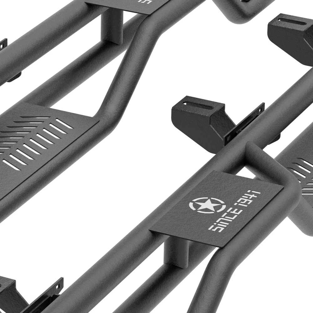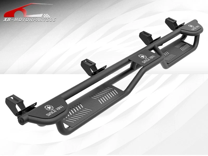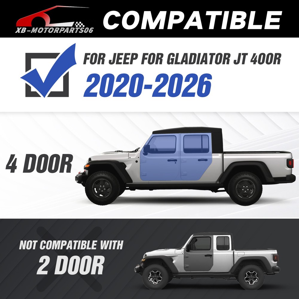 Side Running Boards For 2020-2026 Jeep Gladiator JT 4 Doors Three Raised Steps Suitable Models : Compatible with 2020-2026 Jeep Gladiator JT 4 Doors Package Includes : 2 x Running Boards Side Steps, brackets, instructions, and all necessary hardware Product Information : Product Dimensions: 81 x 13 x 6 inches Installation mode: Bolt-On Weight Limit: 550LBS Placement on Vehicle: Left and Right Item Weight: 74.14 pounds Material: Carbon Steel Color: Black (hand measurements may have an error of 2-3 mm/0.078-0.118 in) Feature: ① The unique "Since 1941" logo gives your nerf bars a distinctive look. The cutout design helps reduce the chances of dust, sand, or snow being brought into the cabin by your shoes, helping to keep your vehicle clean. It also provides extra grip when entering and exiting the truck; ② These truck running boards extend from the rear of the front fender to the front of the rear fender, providing a longer step surface. Ideal for easy access to the truck and bed, especially for frequent loading and unloading without climbing deep into the truck bed. The drop-down step makes it easier for children or those with mobility issues to enter the truck; ③ No cutting or drilling is required for easy installation. Note: Installation bolts are not included as they are already in the original vehicle . Simply locate them during installation. Ensure secure installation before driving; ④ Made from heavy-duty 2.0-inch tubular steel with a dual-beam system for maximum underbody protection. Supports up to 550 pounds. The textured powder coating offers excellent rust and corrosion resistance; Warranty Period : 2 year Standard Shipping (FedEx Ground or FedEx Home Delivery) Will usually ship within 3 business days of receiving cleared payment Suitable Models : Compatible with 2020-2026 Jeep Gladiator JT 4 Doors Package Includes : 2 x Running Boards Side Steps, brackets, instructions, and all necessary hardware Product Information : Product Dimensions: 81 x 13 x 6 inches Installation mode: Bolt-On Weight Limit: 550LBS Placement on Vehicle: Left and Right Item Weight: 74.14 pounds Material: Carbon Steel Color: Black (hand measurements may have an error of 2-3 mm/0.078-0.118 in) Feature: ① The unique "Since 1941" logo gives your nerf bars a distinctive look. The cutout design helps reduce the chances of dust, sand, or snow being brought into the cabin by your shoes, helping to keep your vehicle clean. It also provides extra grip when entering and exiting the truck; ② These truck running boards extend from the rear of the front fender to the front of the rear fender, providing a longer step surface. Ideal for easy access to the truck and bed, especially for frequent loading and unloading without climbing deep into the truck bed. The drop-down step makes it easier for children or those with mobility issues to enter the truck; ③ No cutting or drilling is required for easy installation. Note: Installation bolts are not included as they are already in the original vehicle . Simply locate them during installation. Ensure secure installation before driving; ④ Made from heavy-duty 2.0-inch tubular steel with a dual-beam system for maximum underbody protection. Supports up to 550 pounds. The textured powder coating offers excellent rust and corrosion resistance; Warranty Period : 2 year