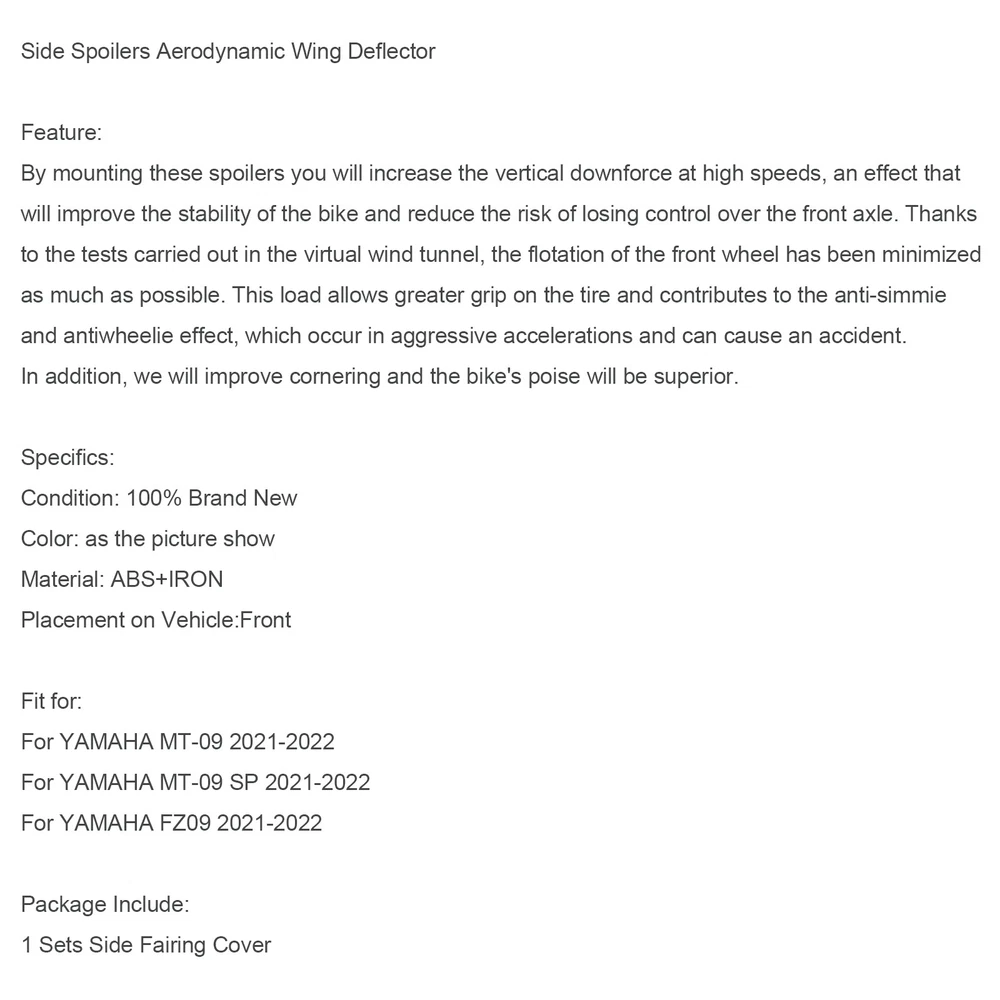 Parts for Yamaha 10" ATV Light Bar Bracket Mount Fits Yamaha YFZ450 YFZ Raptor 660/350/250/125 ⏳ 37.69 USD Free shipping 94580-41104 TTR230 TTR225 Cam 25H-104L Timing Yamaha For Xt225 Tw200 A1 Chain US 14.69 USD Free shipping Cylinder Piston Rings Top End Kit Set for Yamaha TTR 125 TT-R 125 LE 2000-2005、 23.69 USD Free shipping CNC Aluminum Lowering Link Kit For Yamaha MT-09 FZ-09 XSR900 2021-2022 US 28.69 USD Free shipping Magneto Stator+Voltage Rectifier+Gasket For Yamaha YZF R1 R1S YZF-R1 2002 03 79.69 USD Free shipping 16Mm Kickstart Kick Start Lever For Yamaha Dt125 175 It175 Yz100 It125 Yz125 H3 30.69 USD Free shipping Stator For Yamaha Wave Runner Blaster Raider Venture WB760 GP760 XL760 96-01 45.69 USD Free shipping Rear Motorcycle Rack Luggage Carrier Fits Yamaha XT250 Serow 250 2005-2022 US 59.69 USD Free shipping Unpainted ABS Headlight Guard Bracket Fairing For YAMAHA MT09 FZ09 2017-2020 #6 44.69 USD Free shipping Headlight Fairing Windshield Cover For Yamaha XVS 950 SPEC BOLT 950 2014-2020 55.69 USD Free shipping Fairing Injection Plastic Body Kit Fit For YAMAHA YZF-R6 2008-2016 Matt Black US 379.0 USD Free shipping Flywheel Rotor+Stator+ Regulator+Gasket For Yamaha R1 04-08 FZ8N/FZ8S/FZ1 06-15 289.69 USD Free shipping All Models For Honda For Suzuki For Kawasaki For Yamaha For BMW For Polaris For CFmoto For Ducati For Benelli For Trident For Triumph For Aprilia Other part You may also like Injection Fairing Kit Bodywork Plastic ABS fit For Kawasaki ZX6R 2019~2023 549.0 USD Free shipping Front Brake Caliper Insert Set Cover Fit Touring V-Rod Street Glide 42054-05 USA 19.69 USD Free shipping Fairing Yellow White Injection Plastic Kit Fit For YAMAHA YZF-R6 2006 2007 #3 369.0 USD Free shipping Upper Fairing Stay Bracket Cowling Headlight Fit for Yamaha YZF-R1 2007 - 2008 63.69 USD Free shipping Black Engine Guard Bracket Fixed Fastening for Honda MSX125/SF Grom 13-19 UE 29.69 USD Free shipping PRODUCT DESCRIPTION Side Spoilers Aerodynamic Wing Deflector Feature: By mounting these spoilers you will increase the vertical downforce at high speeds, an effect that will improve the stability of the bike and reduce the risk of losing control over the front axle. Thanks to the tests carried out in the virtual wind tunnel, the flotation of the front wheel has been minimized as much as possible. This load allows greater grip on the tire and contributes to the anti-simmie and antiwheelie effect, which occur in aggressive accelerations and can cause an accident. In addition, we will improve cornering and the bike's poise will be superior. Specifics: Condition: 100% Brand New Color: as the picture show Material: ABS+IRON Placement on Vehicle:Front Fit for: For YAMAHA MT-09 2021-2022 For YAMAHA MT-09 SP 2021-2022 For YAMAHA FZ09 2021-2022 Package Include: 1 Sets Side Fairing Cover About Us Payment Shipping Returns Contact Us About VIPIH VIPIH is one of the international leading distributors specialized in distribution of motor parts of the world's prime motorcycle part suppliers on a global scale with the full responsibility in procurement, shipping, sales and marketing and after sales service. VIPIH fulfills all needs of its clients completely and on a timely basis with the know-how it has built up since it was established and the comprehension knowledge of the sectors standards. The perfectionist approach in product quality, high service availability, strict principle of business follow-up, reliability and the good reputation which has gained strength as a result of customer satisfaction are the most striking components of VIPIH's success. VIPIH is presently capable of supplying all demands for motor parts from the petrol pump to rectifier in a wide range. Free delivery with worldwide shipping options available. If you need any further information before ordering,please get in touch with expert advice. About Item All items sold by us are being described to the best of our abilities, as accurate as possible, and with utmost conscientiousness on our part. However, to avoid any potential oversights, I respectfully request your assistance in helping us to make this a mutually satisfactory transaction by THOROUGHLY reviewing item description and photos, and asking all questions PRIOR TO BIDDING. Customer Satisfactory 1.We back our commitment with superb service, 100% full money back and a customer satisfaction guarantee. 2.I am here and ready to assist you with any questions or concerns you might have before or after the purchase. 3.My goal is to make sure you are a happy customer and pleasant shopping with us. Feedback If you are satisfied with the purchase and our total service, your comment is very important in our business success. Please take a minute to leave us a positive feedback with an overall Detailed Selling Rating (DSR) of 5. Our eBay account setup auto feedback, so eBay system gives you automatically Positive feedback back after your positive feedback left. If you plan to give us a neutral/negative feedback Or open ebay/paypal case, please write to us immediately so that we can do our best to resolve your problem. 1.We only accept PayPal. 2.PayPal is the only online payment method we accept. Please make sure you have a valid/confirmed PayPal account prior bidding. 3.Payment must be made within 3 days of the auction end time. Non-Paying bidders will be reported. 4.Our eBay account automatically open a dispute for a unpaid item, when we don't receive your payment after 4 days. United States Buyers Parcel will via USPS or UPS from us United States warehouse Shipping Time Usually ,Parcel will be delivered 2-10 working day include Handling time. Sometimes shiping time may has a little delay, such as Bad wether,Holidays We stand behind everything that we sell and will do everything possible to assure you are satisfied. When you receive your purchase if you are not 100% satisfied, please sent me ebay message and we will do our best to make you happy. If you still want to return your 