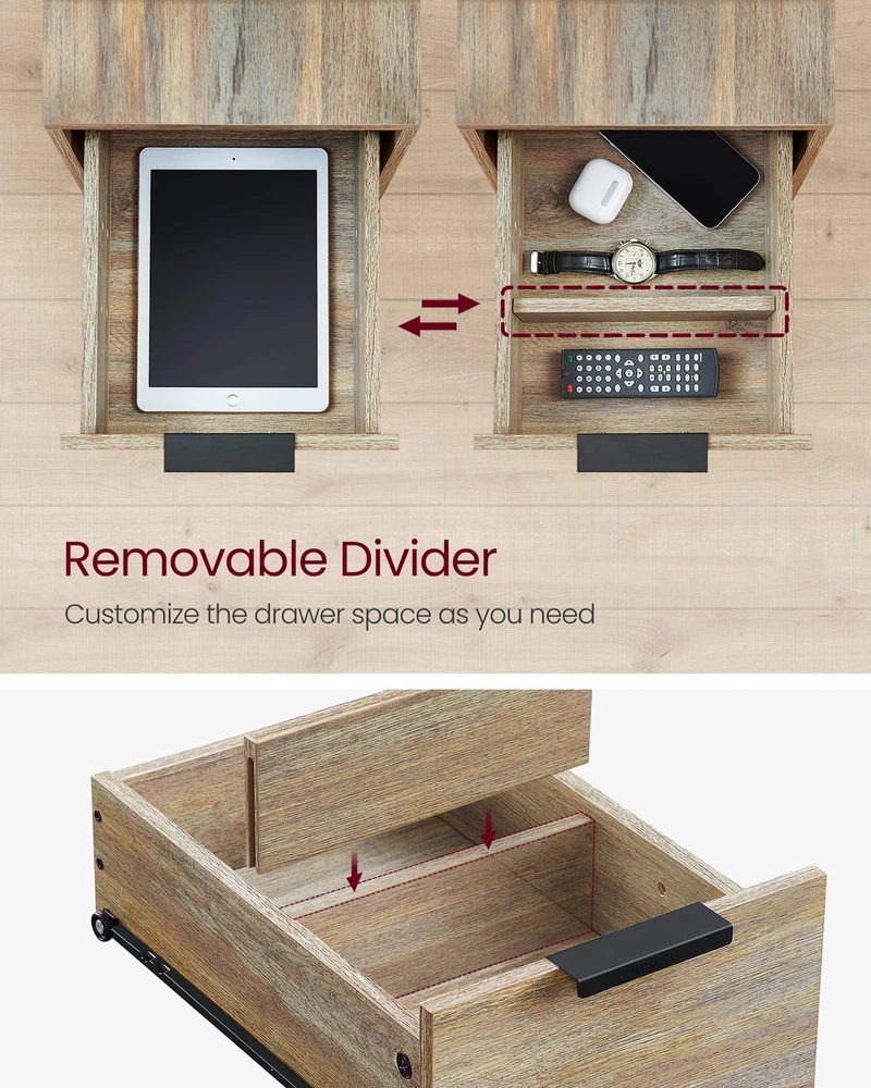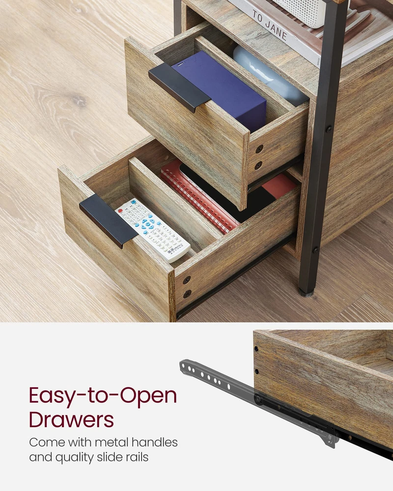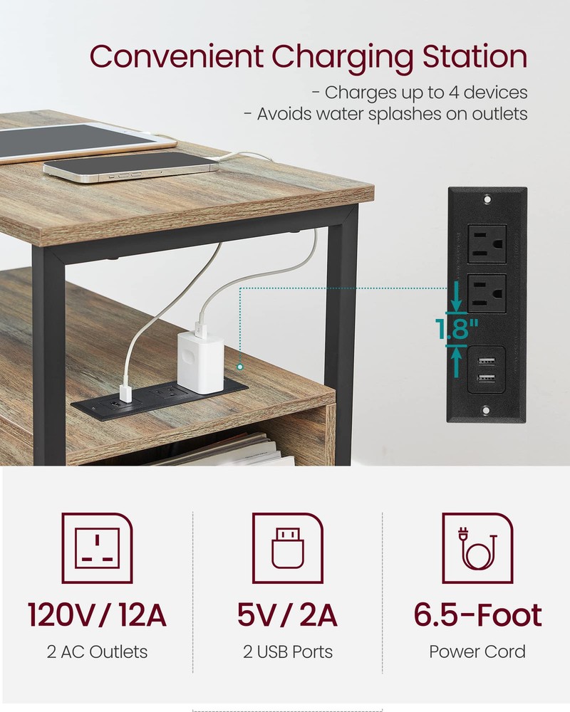 [Attached Power Strip] Power up your devices with our side table featuring a built-in charging station with 2 AC outlets, 2 USB ports, and a 6.5 ft cable, keeping your space organized and free from messy cords [Plenty of Storage] This narrow side table features 2 drawers with removable inner dividers, 2 open shelves for easy access, and a convenient magazine holder on the back, providing ample storage space for your books and electronics [Stable and Durable] Constructed with steel and particleboard, this slim nightstand will provide sturdy and reliable support (max. static load 200 lb) for your bedside essentials in the coming years [Thoughtful Additions] Designed with thoughtful details such as stylish easy-to-grab handles and smooth drawer slide rails, this end table brings convenient utility right by your bedside [Bring Rustic Charm to Any Room] This narrow bedside table can serve as a sofa side table, nightstand, or accent table. Its rustic design will add a touch of charm to your living room, bedroom, or wherever you need it