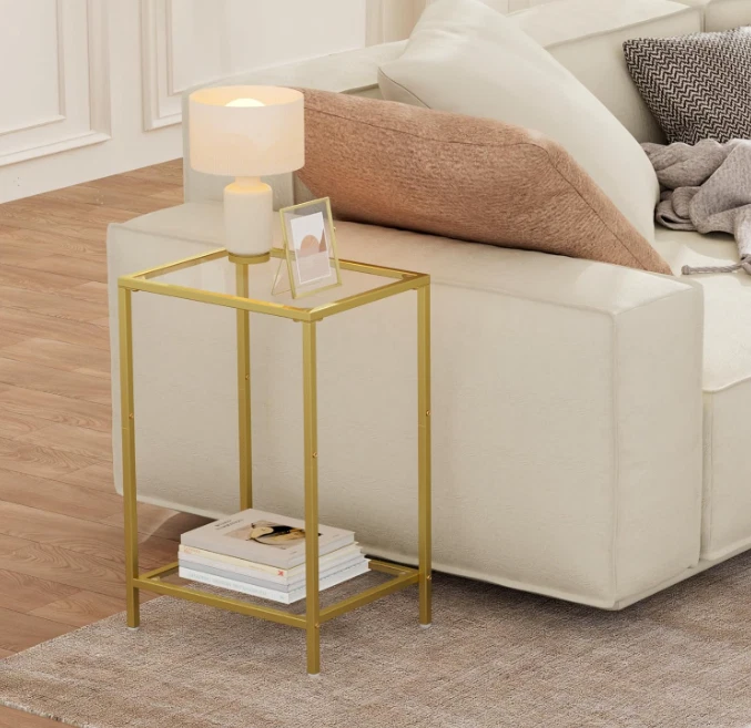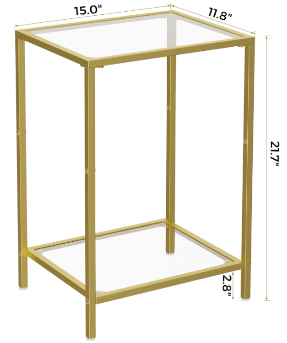 Side Tables Set of 2, End Tables with Tempered Glass, 2-Tier Nightstands, Golden Modern Design: Modern style minimalist design, made of gold colored metal and clear tempered glass, suitable for your home. Two-layer storage can hold more items; small size makes it easy to move around without taking up too much space Practical and Multi-functional: Product dimensions 11.8"D x 15"W x 21.7"H, it is suitable for placing beside sofas and leisure chairs with magazines, coffee, small table lamps, etc. You can also put it in the bedroom as a nightstand with books and a small lamp on it. Easy to Assemble: With detailed instructions, numbered parts, simple structural design, you can easily assemble it in 20 minutes Also great for gardens, it can be placed on the sides of camping chairs and outdoor sofas Safety Design: Polished edge treatment will ensure your safety. The narrow end table has four plastic adjustable feet, which can keep balance even on uneven floor and protect the floor from scraping Strong and long-lasting: The small side table is made of tempered glass and strong metal frame, which is sturdy and easy to clean. A single shelf can bear up to 20 lbs and you can use it both indoors and outdoors Terms of Sale and Feedback: Feedback is very important to us and eBay. If you are satisfied with our transaction, please take a moment to leave positive feedback. YOUR satisfaction is our number one priority! If there are any problems, PLEASE contact us BEFORE leaving a neutral or negative rating so we can resolve any concerns. We PROMISE that we can make you happy if you give us a fair chance.