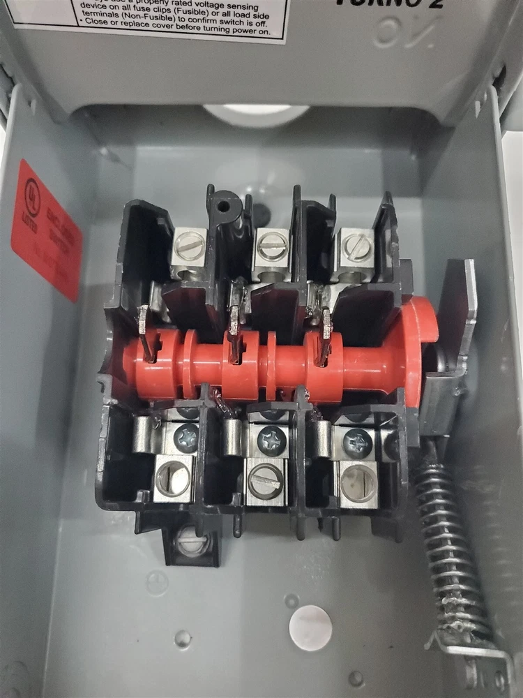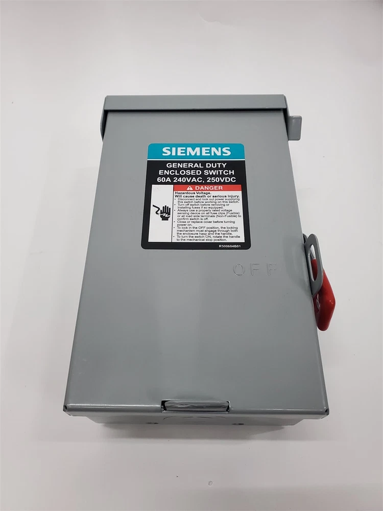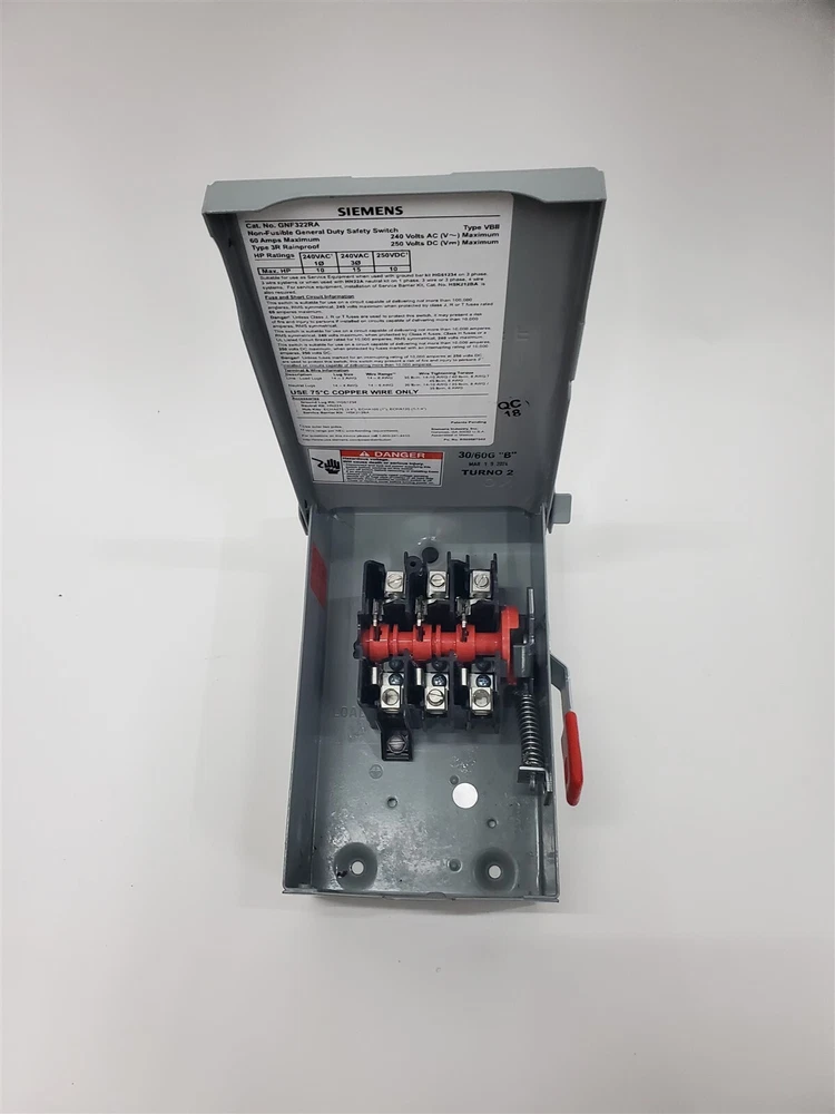 Siemens GNF322RA 60-Amp 3-Pole 240V General Duty Safety Switch Non-Fusible *Flaw* Condition: Item is Missing 2 Inside Screws - Brand New, Never Used - Damaged Box - No Damage to Item Description: 240-Volt rated, 3-Pole 3-Wire Quick make-break action Metal handle Provision for ECHA type hub Compact size for reduced space requirements Powered by SixBit's eCommerce Solution Powered by SixBit's eCommerce Solution