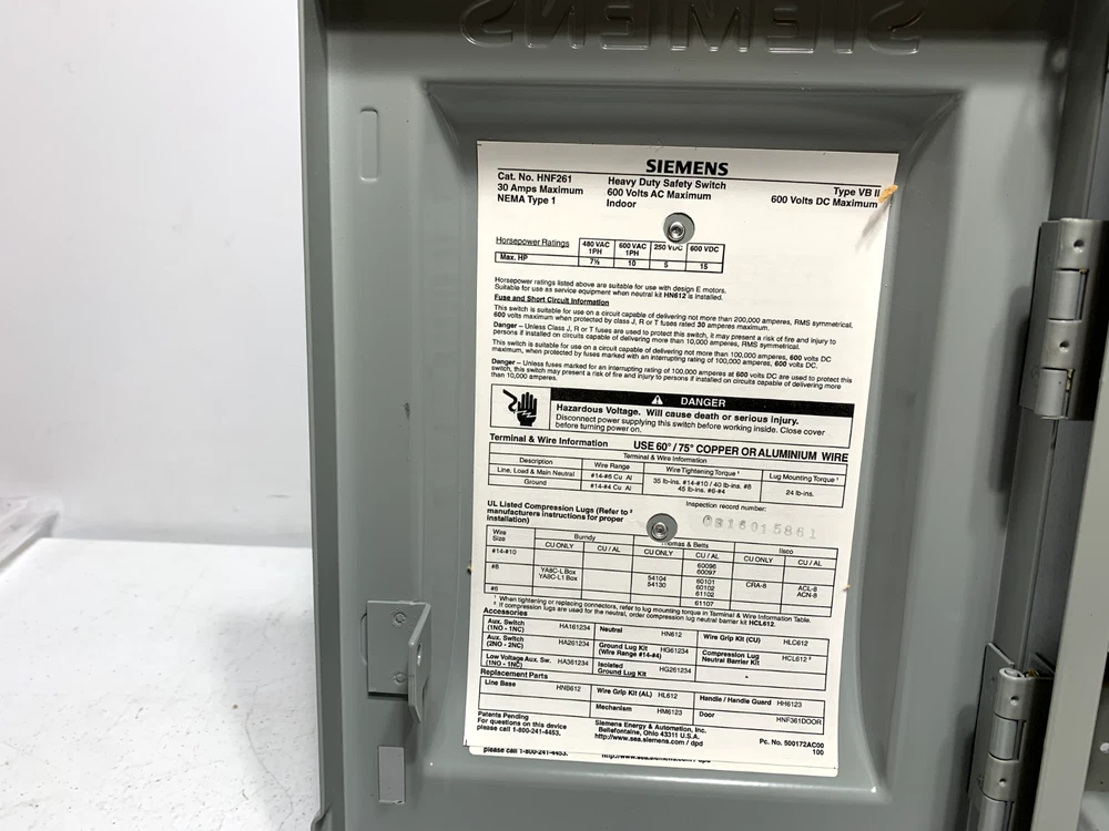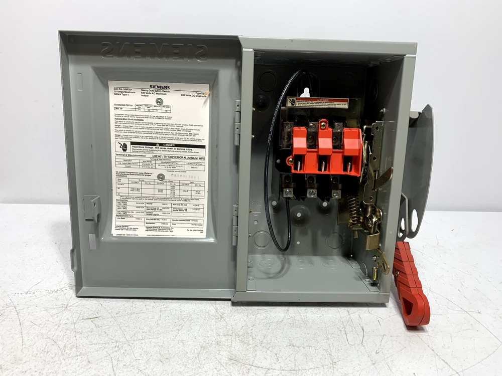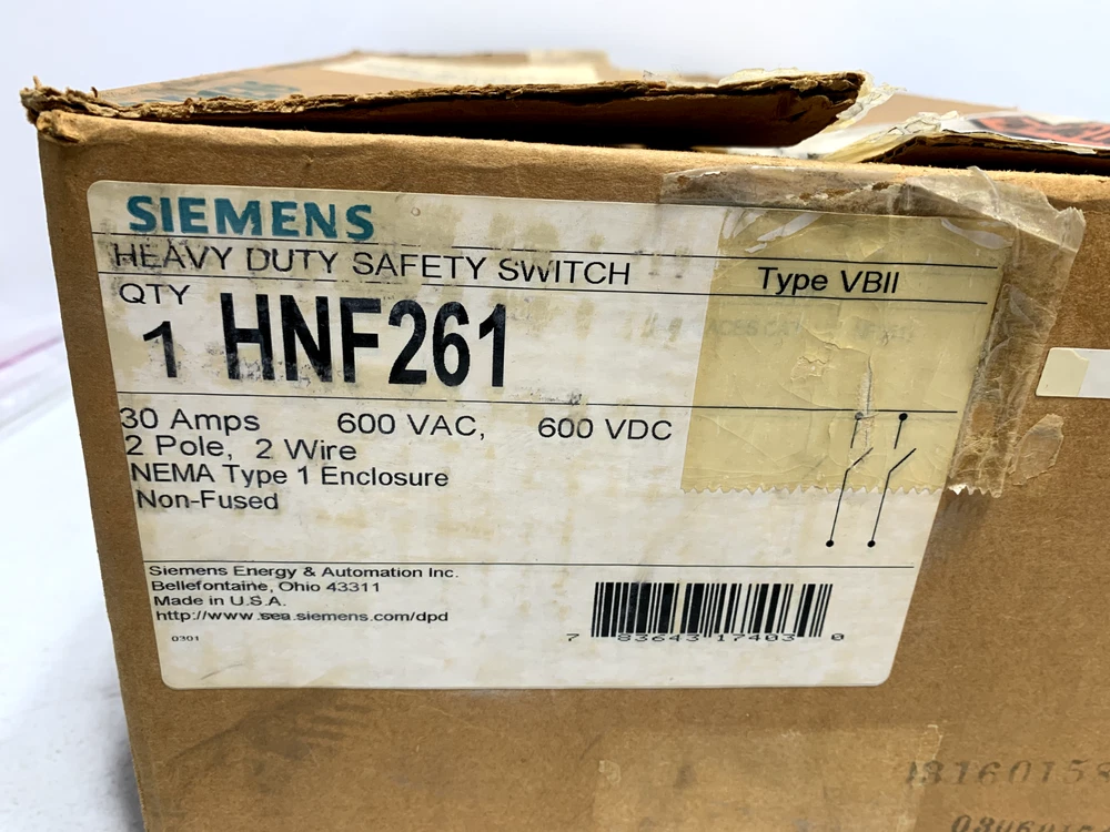 This is a NEW - unused Siemens HNF261 Heavy Duty Safety Switch 30 Amp 600V 2P 2W Buyers and Re-sellers, don't miss this opportunity to purchase quality surplus equipment at a great price! There are many more surplus parts on our store, check it out! Return Policy: Returns are accepted within 60 days of the delivery date. Rest assured we will cover all return shipping costs! All returns must be in "as shipped" original condition to qualify for a refund. Photos of packing and product is required for damaged items. Customer returns that satisfy all of the above requirements will be issued a refund including any applicable sales tax Product Article Number (Market Facing Number) HNF261 | US2:HNF261 Product Description Siemens Low Voltage Circuit Protection Heavy Duty Safety Switch. 2-Pole Non-Fused in a type 1 enclosure (indoor). Rated 600VAC (30A). Product family Not available Product Lifecycle (PLM) PM300:Active Product Price data Price Group N3H List Price Show prices Customer Price Show prices Metal Factor None Delivery information Export Control Regulations AL : N / ECCN : EAR99 Estimated dispatch time (Working Days) 24 Day/Days Net Weight (lb) 11.001 lb Packaging Dimension 7.72 x 11.45 x 9.15 Package size unit of measure Inch Quantity Unit 1 Piece Packaging Quantity 1 Additional Product Information EAN Not available UPC 783643174030 Commodity Code 8536509045 LKZ_FDB/ CatalogID LV10.1 Product Group 5203 Group Code P320 Country of origin Mexico Compliance with the substance restrictions according to RoHS directive not available