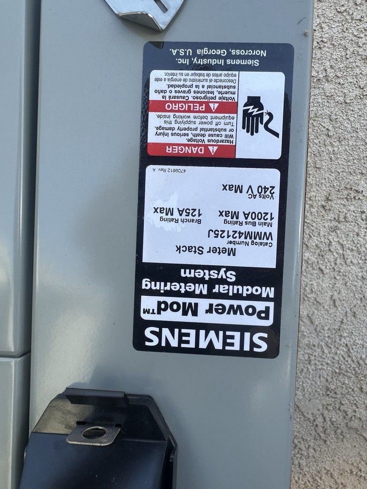 The Siemens WMM42125J Residential Meter Stack Power Mod is a gray metal vertical power mod designed for exterior use. It has a maximum amperage of 125A and is suitable for any room. With two poles and an analog/mechanical control style, this meter stack is compatible with Ring for smart home integration. The rectangular box shape and 120/240 volt voltage make it versatile for various electrical setups. The Siemens brand ensures quality and reliability in electrical equipment and supplies.