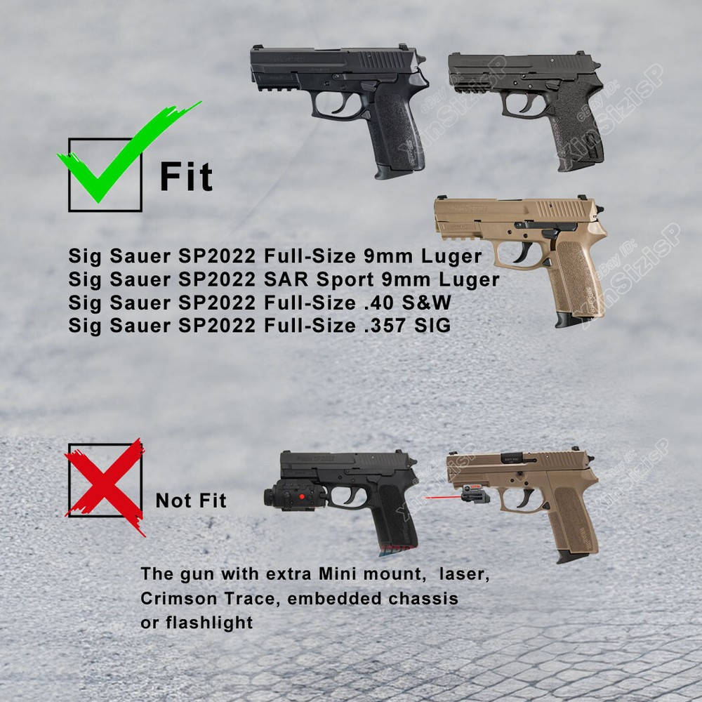 High Quality Military & Police Grade Polymer OWB Holster Specially Designed For Fast Draw During Duty Or Shooting Competition. This is a Combo Holster Comes With Paddle and Belt Clip Attachment ,which means you can swap paddle type to belt clip type with the Allen key by yourself. Item Description: Outside the Waistband Duty Holster with Paddle attachment Holster fit S ig Sauer SP2022 Full-Size 9mm Luger Sig Sauer SP2022 SAR Sport Full-Size 9mm Luger Sig Sauer SP2022 Full-Size .40 S&W Sig Sauer SP2022 Full-Size .357 SIG ( I t can not fit the gun with Optic Mount Mini Sight , laser , embedded chassis, or flashlight style ) Ease and Comfort Push side buttons to achieve the fast opening and closing, unique design allows for belt carrying or vest carrying, perfectly used by duty holsters, uniformed law enforcement officers, security personnel, military personnel, private persons, and shooting sports holsters. And it fits closer to the body which can achieve better concealment under clothes. High S afety Secure Level II Retention - Auto-locking system restrain pistol in the holster to ensure ultimate safety, activate the release by pressing the button with the index finger to achieve gun access . A djustable Easily set Holster 360 degrees to your desire position with Allen key, compatible belt width up to 2 inch . Tough & Durable Material Custom-molded body made of polymer stronger than leather that will wear out, adapt to every bad environment In the Package: · 1*Holster with Paddle Attachment · 1*Belt Clip Attachment · 1*Allen Key Shipping: Ships same day or next except Sundays and Holidays ! Free shipping! Ship by USPS First Class Package. 100% MONEY BACK GUARANTEE. Any question please be free to contact with us .Thanks!