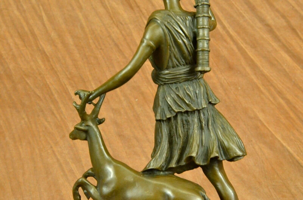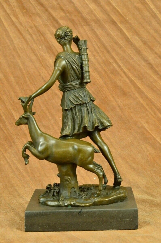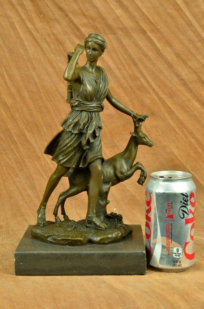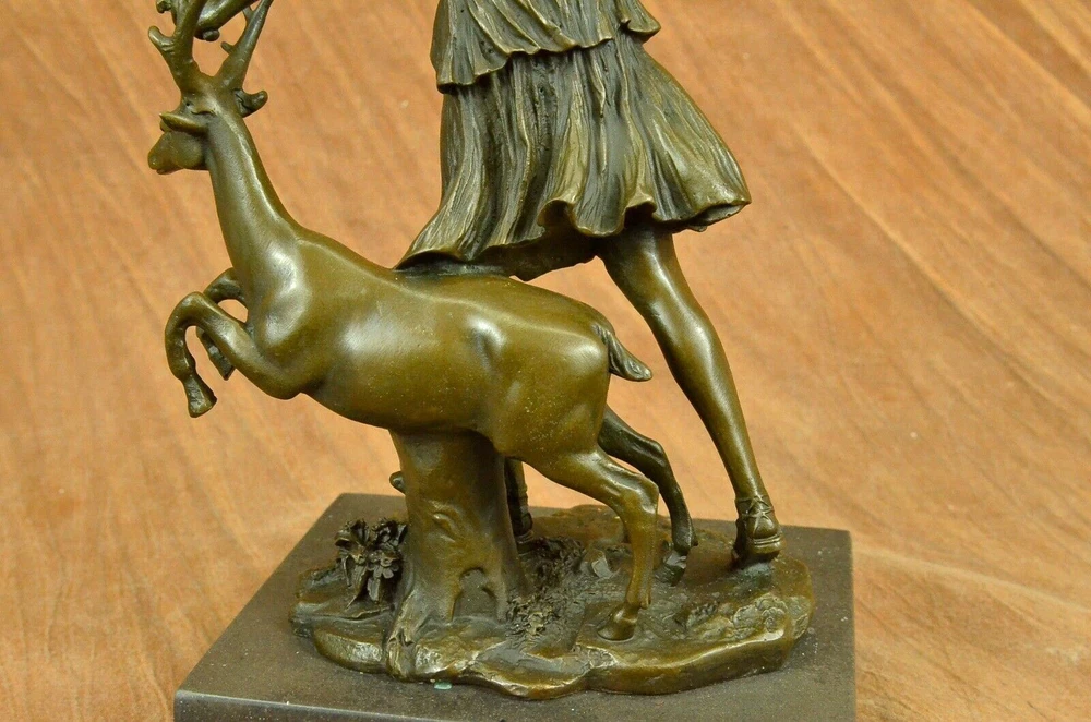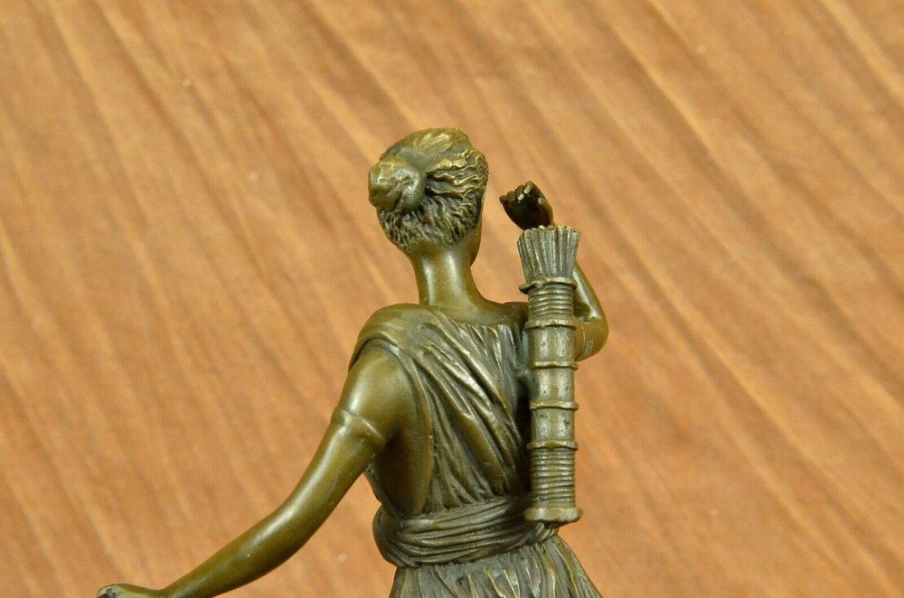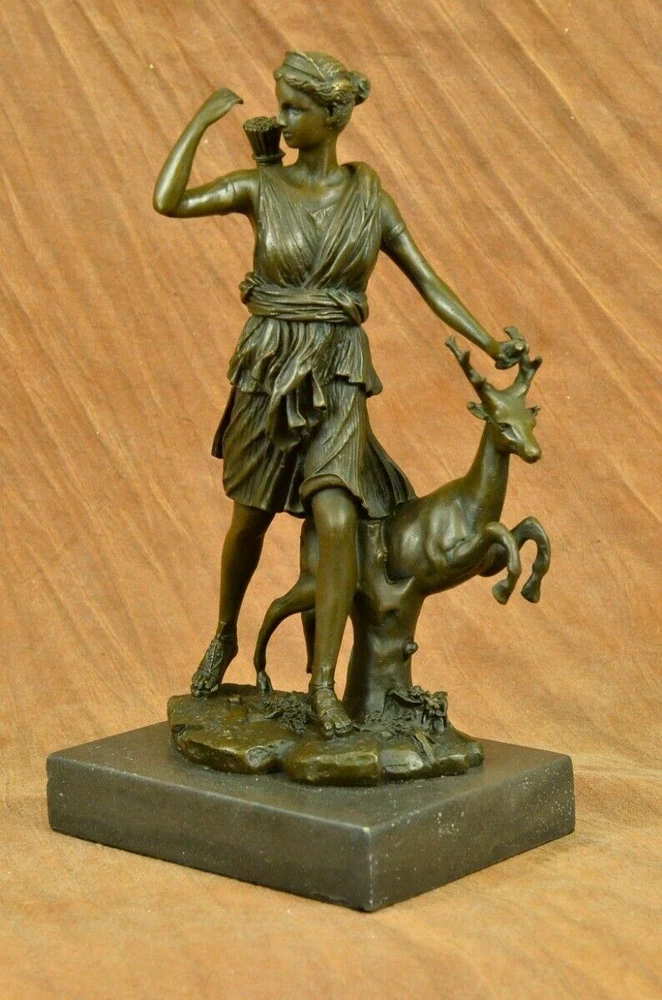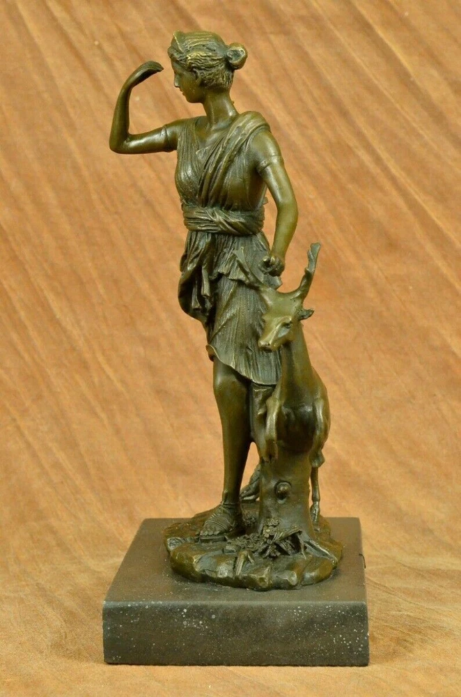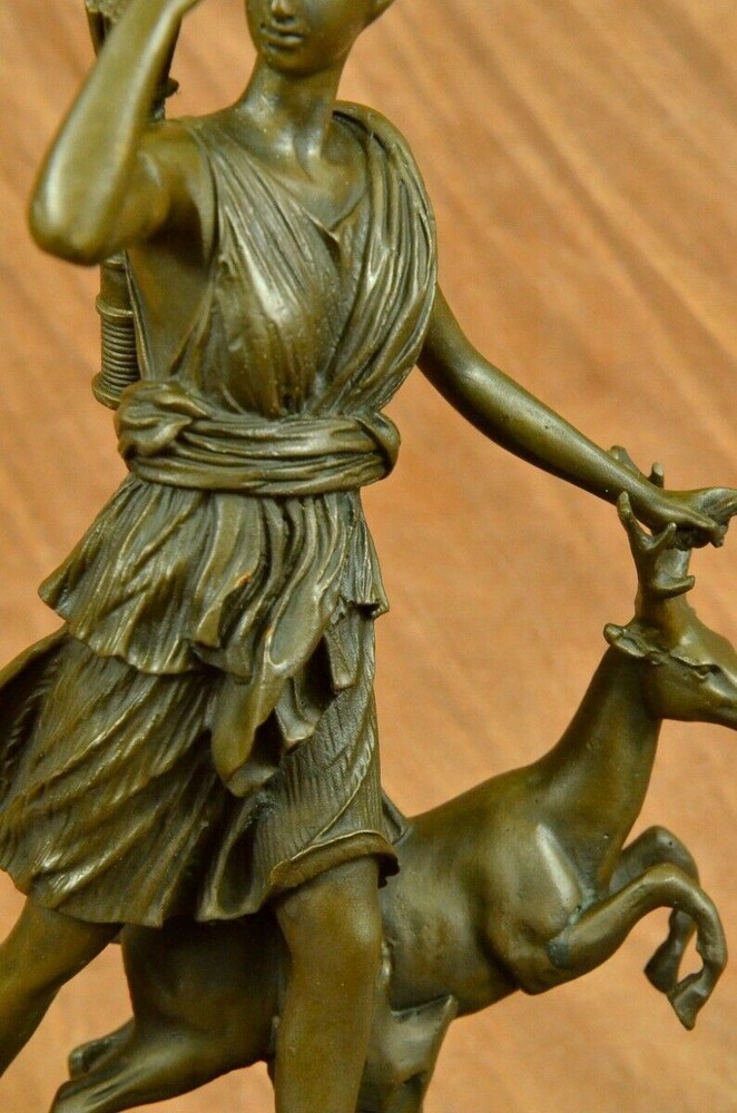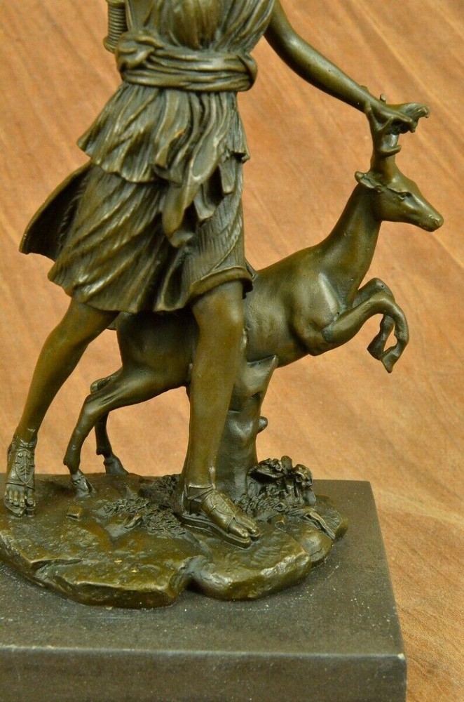 Signed Cast Bronze Diana The Huntress Art Deco Nude Sculpture Statue Mythical Signed Cast Bronze Diana The Huntress Art Deco Nude Sculpture Statue Mythical Condition : This sculpture is in perfect condition. Bronze Dimensions with Marble Base: Height 12" x Width 7 " Marble Dimensions: 7" X 5" Height without base: 11" Weight: 10 LBS Inventory: 90YRD9465709 Honoring the revered goddess of the hunt, woodland, and the moon, this sculpture pays homage to Diana, also known as Diana Nemorensis or Artemis. A goddess worshipped in various forms across ancient cultures, she held sway over the realms of animals and the wilderness. Shrines dedicated to Diana still stand in places like Capua and Aricia near Rome, with her sanctuary at Lake Nemi earning her the title Diana Nemorensis, emphasizing her connection to the woods. This bronze masterpiece captures the essence of the beloved goddess, depicting her wielding a mighty spear while standing atop a wild boar. Her flowing dress flutters in the wind, revealing her curvaceous and voluptuous form, her hair cascading wildly as she exudes both strength and femininity. Crafted with meticulous attention to detail, this 100% handmade bronze sculpture embodies the rich symbolism associated with Diana. The brown patina finish, achieved through the revered "Lost Wax Method," not only enhances the sculpture's aesthetic appeal but also serves as a testament to the precision and artistry involved in its creation. Mounted on a sleek black marble base, the sculpture becomes a striking centerpiece, inviting viewers to contemplate the timeless qualities of beauty, strength, and chastity that Diana represents. Bearing the signature of the esteemed artist Pierre le Faguays, this sculpture is more than a representation of a goddess; it is a celebration of feminine power and resilience throughout history. Diana has transcended the boundaries of mythology to become a symbol of empowerment and femininity. Over time, she has garnered recognition as a feminist figure, embodying beauty, strength, and chastity. This bronze portrayal, with its intricate details and expert craftsmanship, stands as a tribute to the enduring allure and significance of Diana, inviting observers to connect with the timeless qualities embodied by this revered goddess. Art Deco Artemis Diana the Hunter Huntress with Stag Deer Bronze Sculpture Statue YRD-946 Video will open in a new window Using the eBay App? Paste link into a browser window: [isdntekvideo] Shipping Terms : Most of our items are shipped via USPS (United States Postal Service) mail or UPS. Most orders are shipped within 24-48 hours of purchase. Please be aware that not all items are available for USPS shipping due to size and weight. We do ship to Hawaii, Alaska, Canada, Puerto Rico, APO/AE, and U.S. Virgin Islands, however, an additional charge may be required. Please contact us before making any purchases in these areas. For Non-USA customers, you may be responsible for all duty, tax, brokerage fees that may be due upon delivery (shipping costs cover freight charges only). We also ship internationally. Please refer to the "Shipping and Handling" chart for the rates for each area. Payment : We accept just about any form of payment. PayPal, Master Card, Visa or American Express credit cards. Money orders, cashiers checks, and even personal or business checks. For governmental institutions, we will also accept a purchase order. Please understand that for personal or business checks we have to wait for the check to clear (usually 7 days) before shipping. Condition : New Detailed Hand Crafted Hot Cast Bronze Satisfaction Guaranteed. This is Stock Photo, Slight Color Variation!! Listing and template services provided by inkFrog