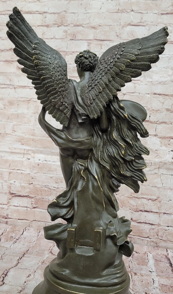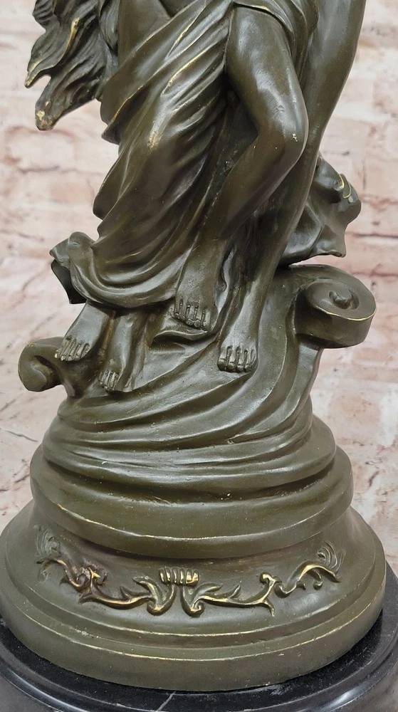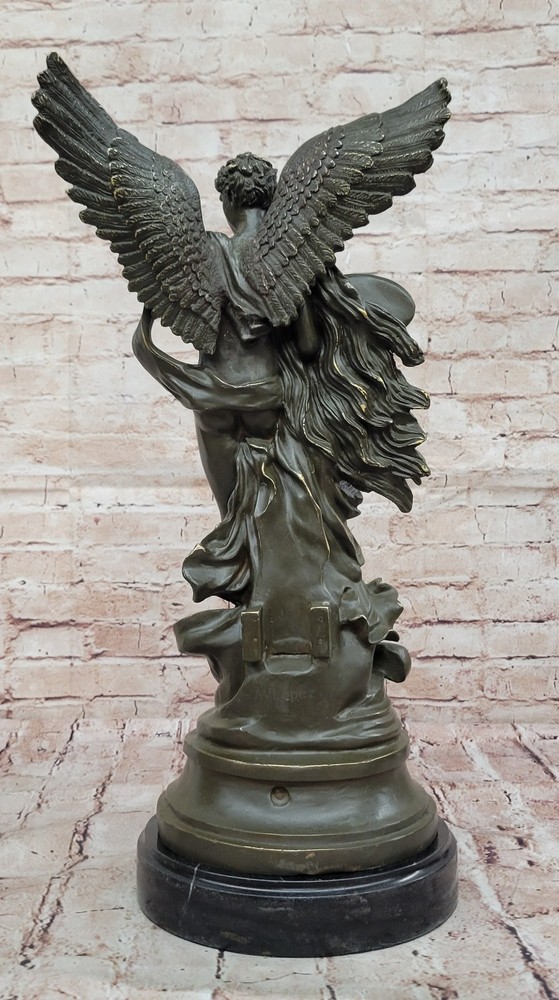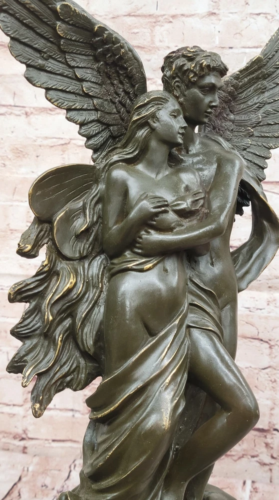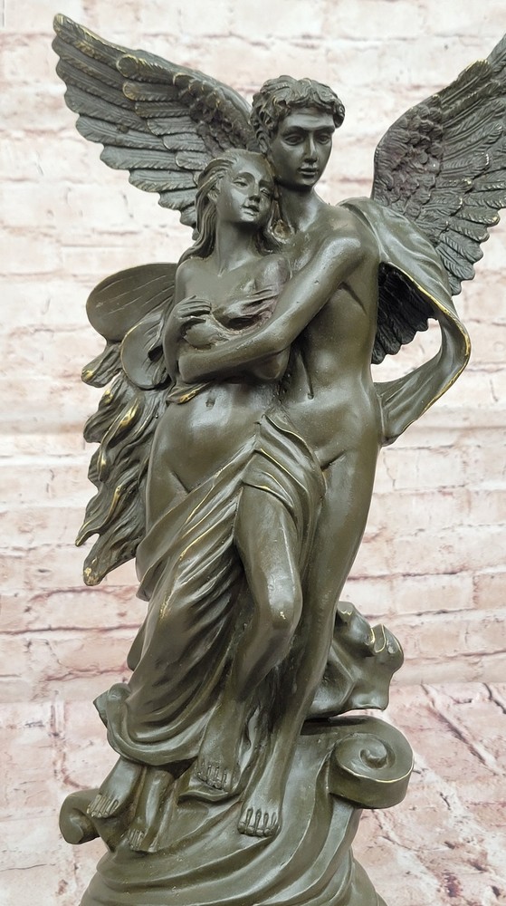 Signed Cupid and Psyche Statue Bronze Greek Mythology Sculpture by Milo Decor Signed Cupid and Psyche Statue Bronze Greek Mythology Sculpture by Milo Decor Condition : This sculpture is in perfect condition. Bronze Dimensions with Marble Base: Height 20.5" X Width 10" Marble Dimensions: Diameter 8" Height without base:19" Weight:21 LBS Inventory:35GTS85211753 This magnificent bronze statue of Eros and Psyche, designed by Miguel Lopez, also known as Milo, captures the timeless beauty and passion of Greek mythology’s most romantic tale. Eros, the god of love, embraces Psyche, the mortal woman who captured his heart, in a graceful and tender moment of divine affection. Handcrafted using the ancient lost wax method, this sculpture showcases extraordinary detail and flowing forms, from the delicate curvature of their bodies to the emotional expression conveyed in their faces. The piece is finished in a deep brown patina, enhancing its classical allure and timeless elegance. This large-scale artwork is mounted on a round black marble base, providing a sturdy foundation and contrasting beautifully with the warmth of the bronze. Signed by the artist, it makes a stunning statement in any fine art collection, classical décor, or romantic setting. Shipping Terms : Most of our items are shipped via USPS (United States Postal Service) mail or UPS. Most orders are shipped within 24-48 hours of purchase. Please be aware that not all items are available for USPS shipping due to size and weight. We do ship to Hawaii, Alaska, Canada, Puerto Rico, APO/AE, and U.S. Virgin Islands, however, an additional charge may be required. Please contact us before making any purchases in these areas. For Non-USA customers, you may be responsible for all duty, tax, brokerage fees that may be due upon delivery (shipping costs cover freight charges only). We also ship internationally. Please refer to the "Shipping and Handling" chart for the rates for each area. Payment : We accept just about any form of payment. PayPal, Master Card, Visa or American Express credit cards. Money orders, cashiers checks, and even personal or business checks. For governmental institutions, we will also accept a purchase order. Please understand that for personal or business checks we have to wait for the check to clear (usually 7 days) before shipping. Condition : New Detailed Hand Crafted Hot Cast Bronze Satisfaction Guaranteed. This is Stock Photo, Slight Color Variation!! Listing and template services provided by inkFrog