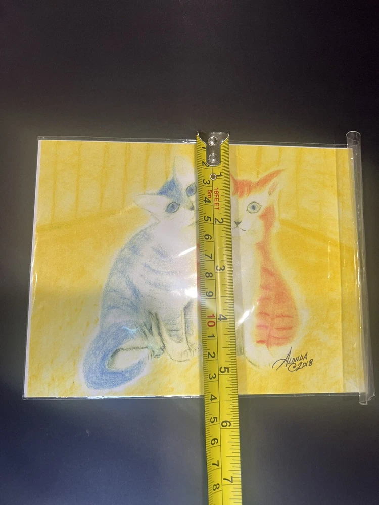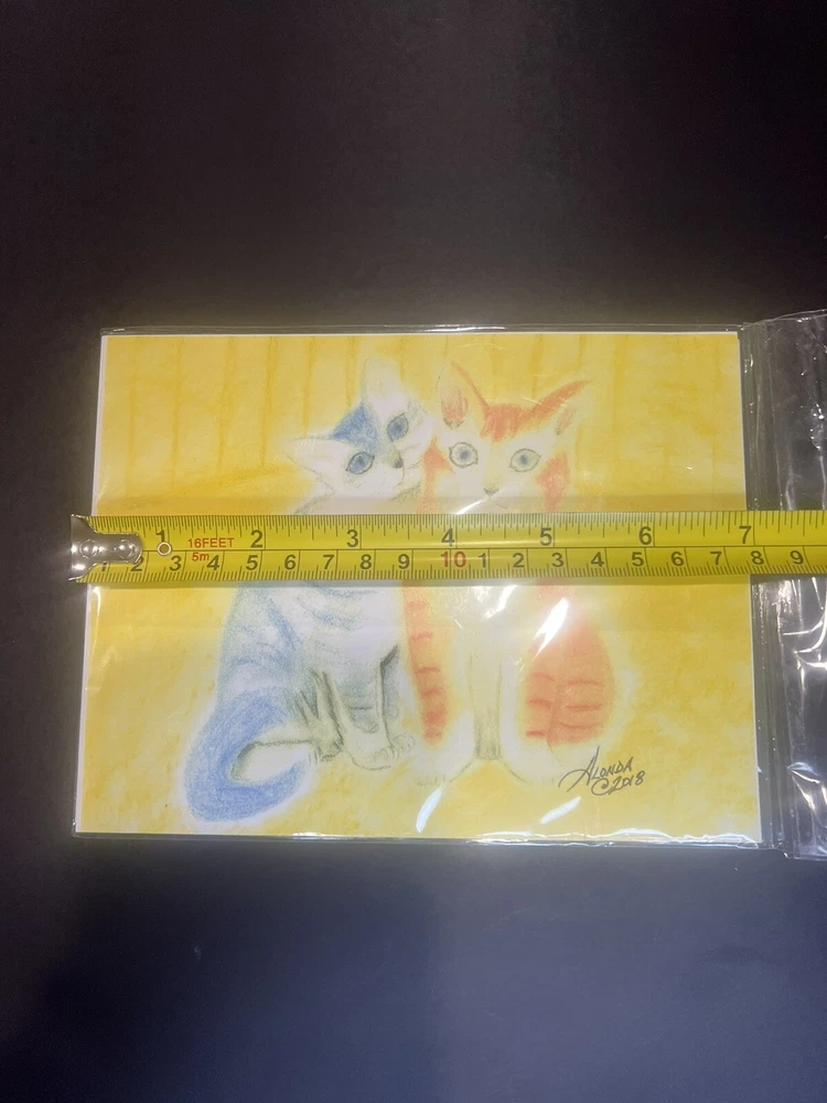 The product is a medium-sized print of a cat created by the artist Alonda in 2018. The artwork features a contemporary art style with a color palette of orange, blue, and yellow. It is a licensed reprint originating from Louisiana, USA, with a theme centered around art and animals, specifically cats. The print is signed by the artist and would make a vibrant addition to any art collection, especially for those who appreciate feline-themed artwork.