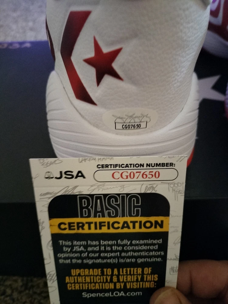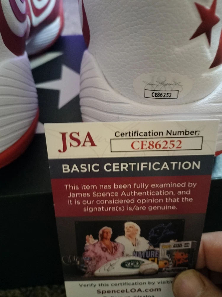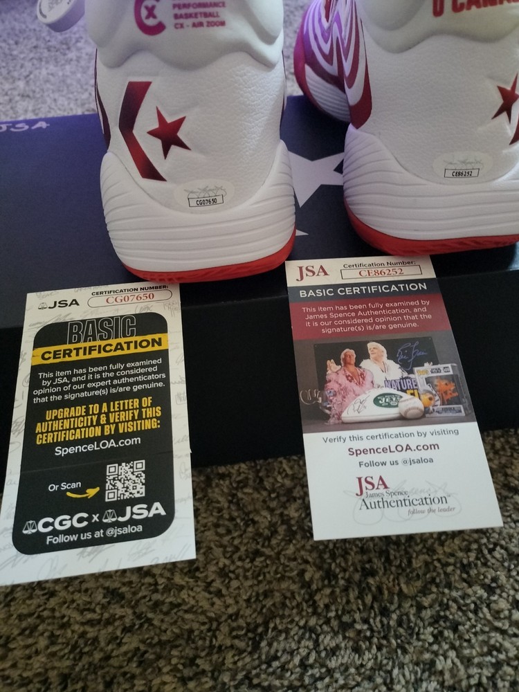 The DS Converse X SGA All Star BB Shift CX Mid ‘team Canada Olympics’ A11994C in size 13 is a highly collectible item signed by Shai Gilgeous Alexander. Authenticated by James Spence (JSA), this original pair of shoes bears the signature of the Canadian basketball player, making it a valuable addition to any sports memorabilia collection. With its association with the Olympics and unique design, this item appeals to fans and collectors who appreciate authentic sports autographs and limited edition sneakers.