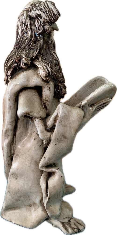 This exquisite sculpture by Dino Bencini depicts Moses holding the 10 Commandments in clay medium. The piece is signed by the artist and boasts an unknown style and production technique. The statue stands at 9.5 inches tall and 3.75 inches wide, making it a perfect addition to any collection. The sculpture is an original piece and is not a licensed reproduction. The item is located in Italy and is perfect for art collectors and enthusiasts alike. See pictures for condition of sculpture. There is cracking on the bottom of the right foot which does not affect the piece. This may have occurred during the sculpting process.