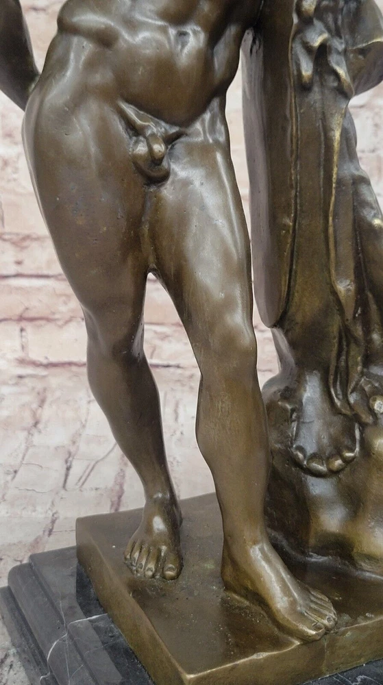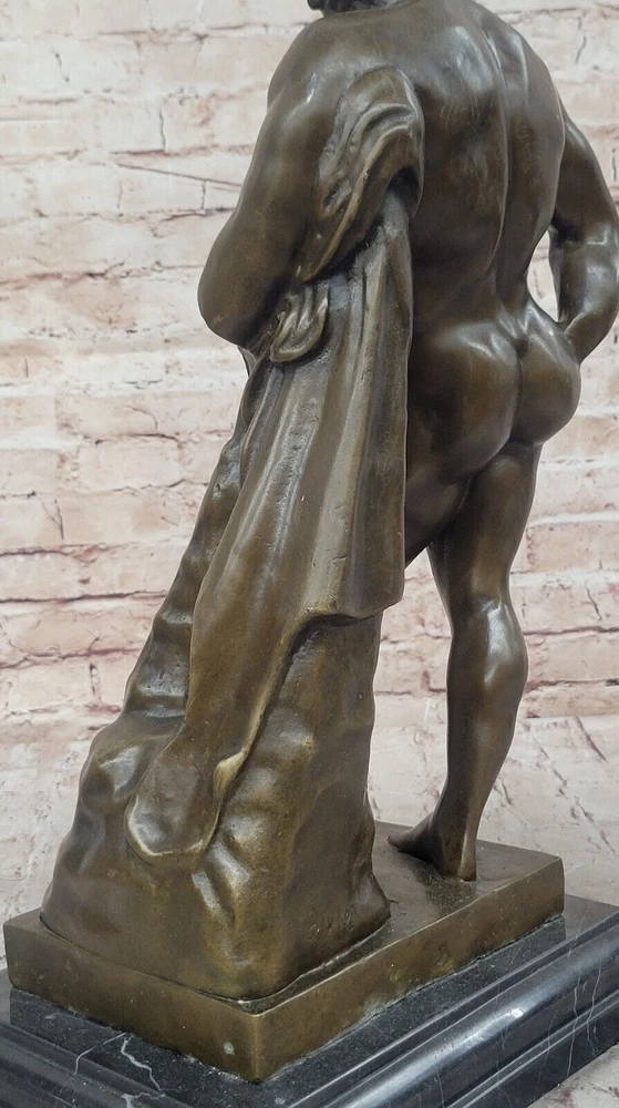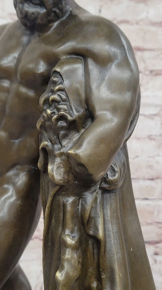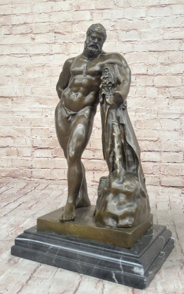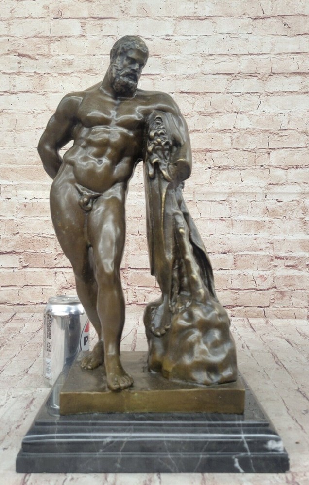 Condition : This sculpture is in perfect condition. Bronze Dimensions with Marble Base: Height 18.5" X Width 9 1/2" Marble Dimensions:10" X 8" Height without base:17.5" Weight:27 LBS Inventory:15YRD848S12651 The Farnese Hercules Bronze Sculpture – Signed by Glycon The Farnese Hercules is an iconic sculpture that captures the strength and endurance of the mythological hero. This massive and muscular figure, originally sculpted in marble, is recreated in 100% bronze using the ancient lost wax casting method, which perfectly mirrors the detail and grandeur of the original. Hercules is depicted in a moment of exhaustion, leaning on his club that is draped with the lion-skin from his earlier labor. Behind his back, he holds the apples of the Hesperides, symbolizing the nearing completion of his legendary Twelve Labors. This statue was highly favored by the Romans, with copies prominently displayed in Roman palaces and gymnasiums. A famous, though coarser, copy stood in the courtyard of Palazzo Farnese, while another, with a likely ancient inscription "Lykippos," has been located in the court of Palazzo Pitti, Florence, since the sixteenth century. The detailed and filigree craftsmanship of this sculpture offers a faithful homage to the original, capturing the immense physicality and psychological weight of Hercules at this moment of triumph and weariness. Mounted on a solid marble base, this exquisite bronze reproduction carries the signature of Glycon, the artist credited for the ancient marble masterpiece. The blend of mythology, art history, and craftsmanship makes this sculpture an extraordinary piece of collectible art, suitable for display in any space that appreciates both classical beauty and mythological significance. Signed Glycon Bronze Statue "Hercules" Greek Myth Hercules Nude Marble Base Sale Video will open in a new window Using the eBay App? Paste link into a browser window: [isdntekvideo]