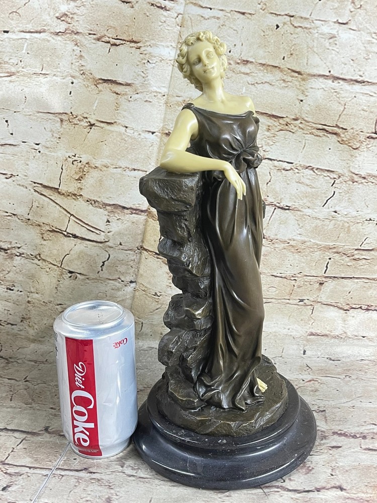 Condition : This sculpture is in perfect condition. Bronze Dimensions with Marble Base: Height 12.5" X Width 6" Marble Dimensions: Diameter 6" Height without base:11.5" Weight:9 LBS Inventory:63XQ06636 This striking sculpture portrays a captivating woman standing gracefully beside a unique and intriguing tree. She is adorned in a stunning gown that drapes elegantly over her figure, with one shoulder exposed for a touch of allure. Her gaze is turned towards her left side, as if lost in deep contemplation, adding an air of mystery to her demeanor. The woman's hair is meticulously styled, with soft curls cascading under a delicate headband, framing her face with effortless sophistication. The intricate details of her attire and hairdo are expertly captured, showcasing the skill and artistry of the sculptor. Crafted with precision using the ancient Lost-Wax Method, this sculpture boasts exceptional quality and craftsmanship. Mounted on a striking black and fire red marble base, it commands attention and makes a bold statement in any space. Signed by the artist Preiss, this piece is a testament to the beauty and timeless elegance of the female form, destined to be admired and cherished for generations to come. Additionally, the hand and arms of the sculpture are crafted from resin, enhancing its durability and lifelike appearance. 13" Western art deco bronze Roman god of wine and plants Girl Bacchus sculpture Video will open in a new window Using the eBay App? Paste link into a browser window: [isdntekvideo]