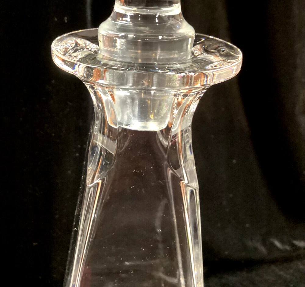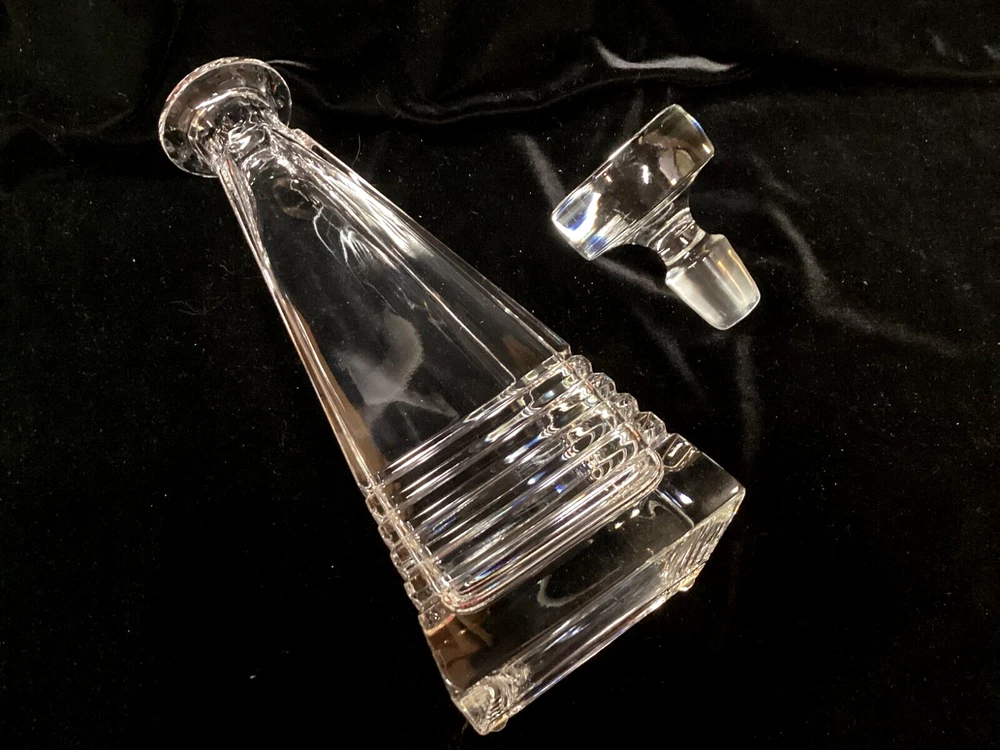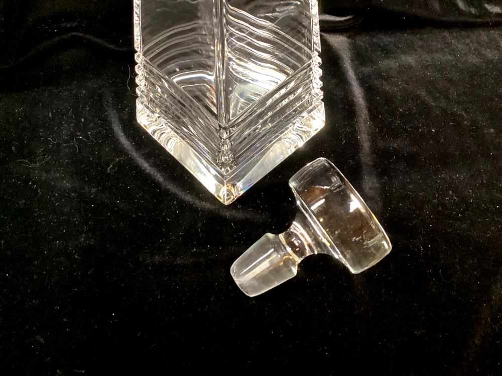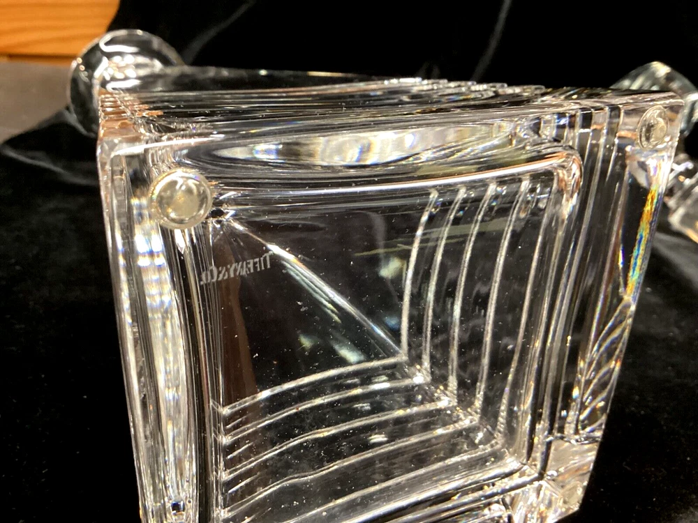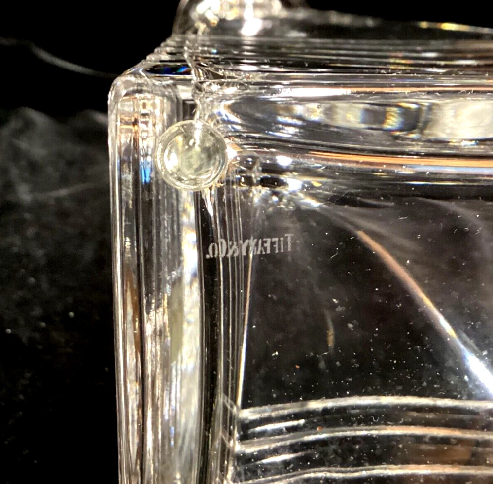 Overall excellent pre owned condition with no chips, cracks, cloudiness, or wear ~ appears unused. Measures 13 1/2" tall to top of stopper. Features square design decanter with deep "step" or horizontal cuts in graduated pattern. Signed on bottom as shown in photos. Had 4 tiny rubberized feet to protect your surfaces. WILL BE PACKAGED WITH GREAT CARE TO ENSURE SAFE ARRIVAL!! Add a touch of luxury to your bar collection with this stunning Tiffany & Co Crystal Decanter. This 13" square cut decanter features a beautiful horizontal cut pattern and is made of high-quality crystal material in a clear color. The decanter comes with a lid/stopper, ensuring a secure and stylish seal. This original art glass piece is perfect for collectors and enthusiasts alike, with its vintage design and excellent production style. Whether you're using it to store your favorite liquor or as a decorative piece, this Tiffany & Co decanter is sure to impress.