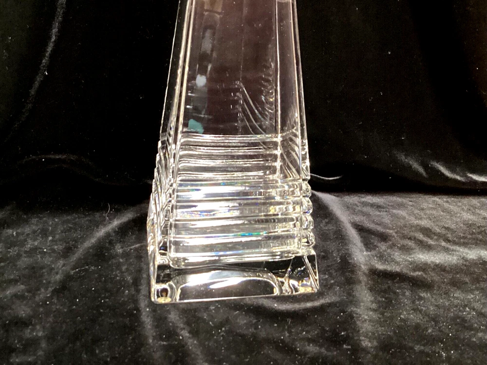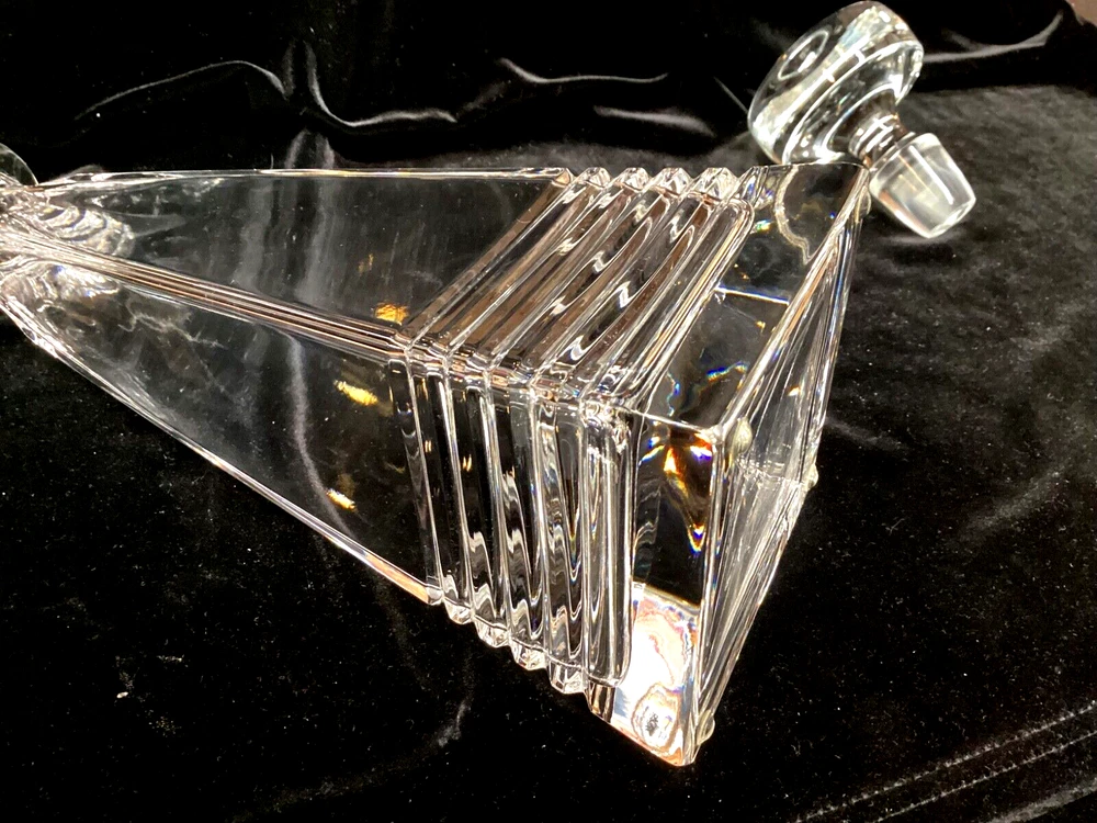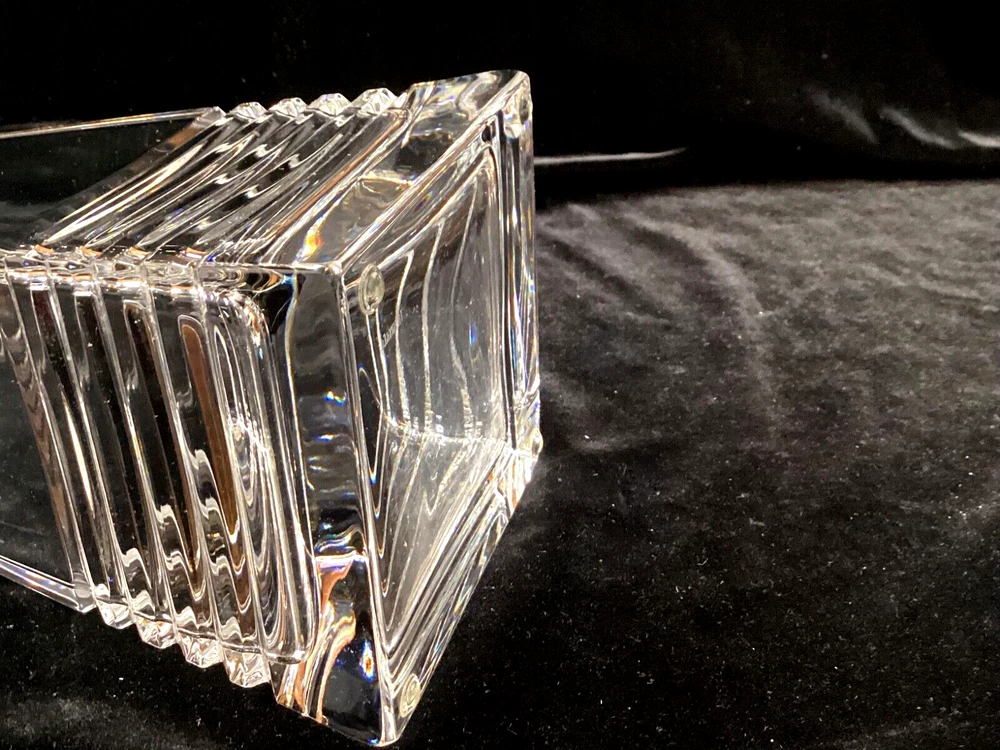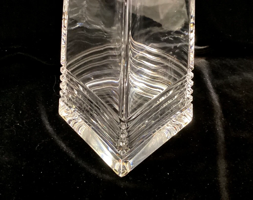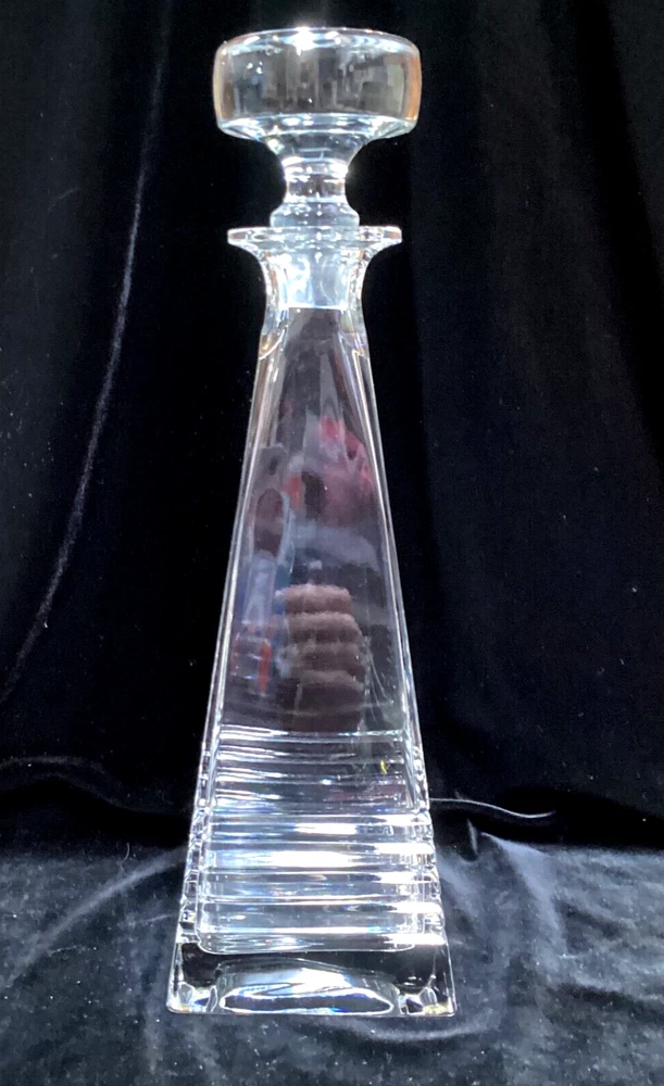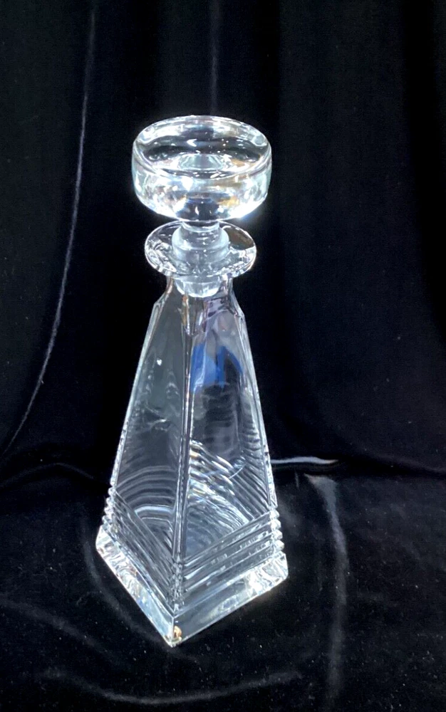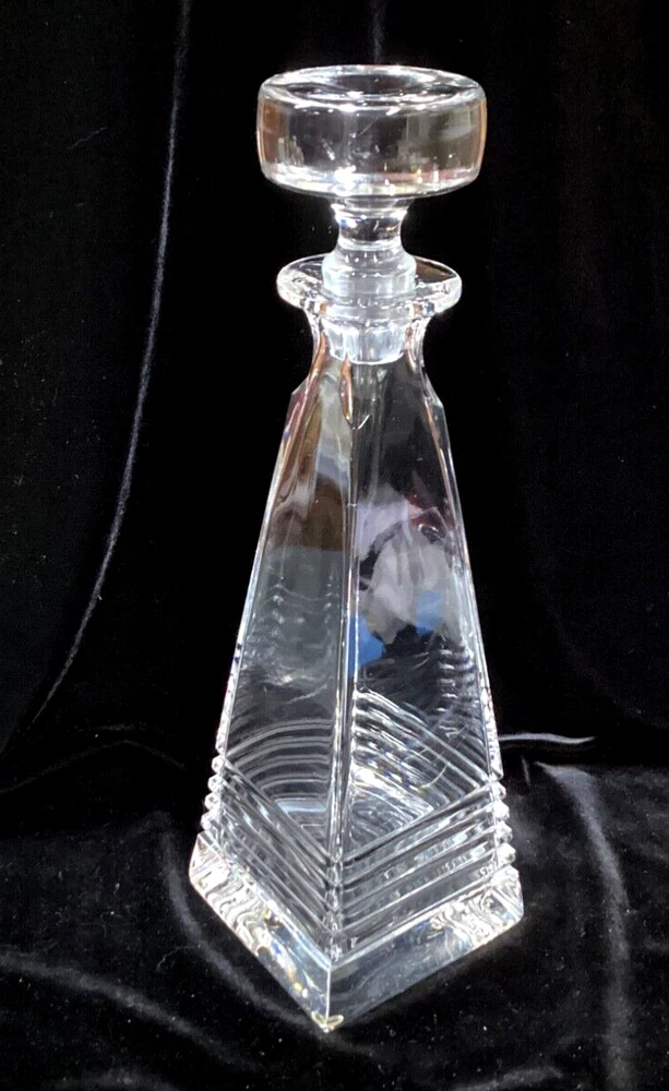 Overall excellent pre owned condition with no chips, cracks, cloudiness, or wear ~ appears unused. Measures 13 1/2" tall to top of stopper. Features square design decanter with deep "step" or horizontal cuts in graduated pattern. Signed on bottom as shown in photos. Had 4 tiny rubberized feet to protect your surfaces. WILL BE PACKAGED WITH GREAT CARE TO ENSURE SAFE ARRIVAL!! Add a touch of luxury to your bar collection with this stunning Tiffany & Co Crystal Decanter. This 13" square cut decanter features a beautiful horizontal cut pattern and is made of high-quality crystal material in a clear color. The decanter comes with a lid/stopper, ensuring a secure and stylish seal. This original art glass piece is perfect for collectors and enthusiasts alike, with its vintage design and excellent production style. Whether you're using it to store your favorite liquor or as a decorative piece, this Tiffany & Co decanter is sure to impress.