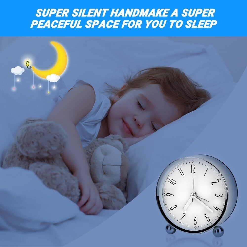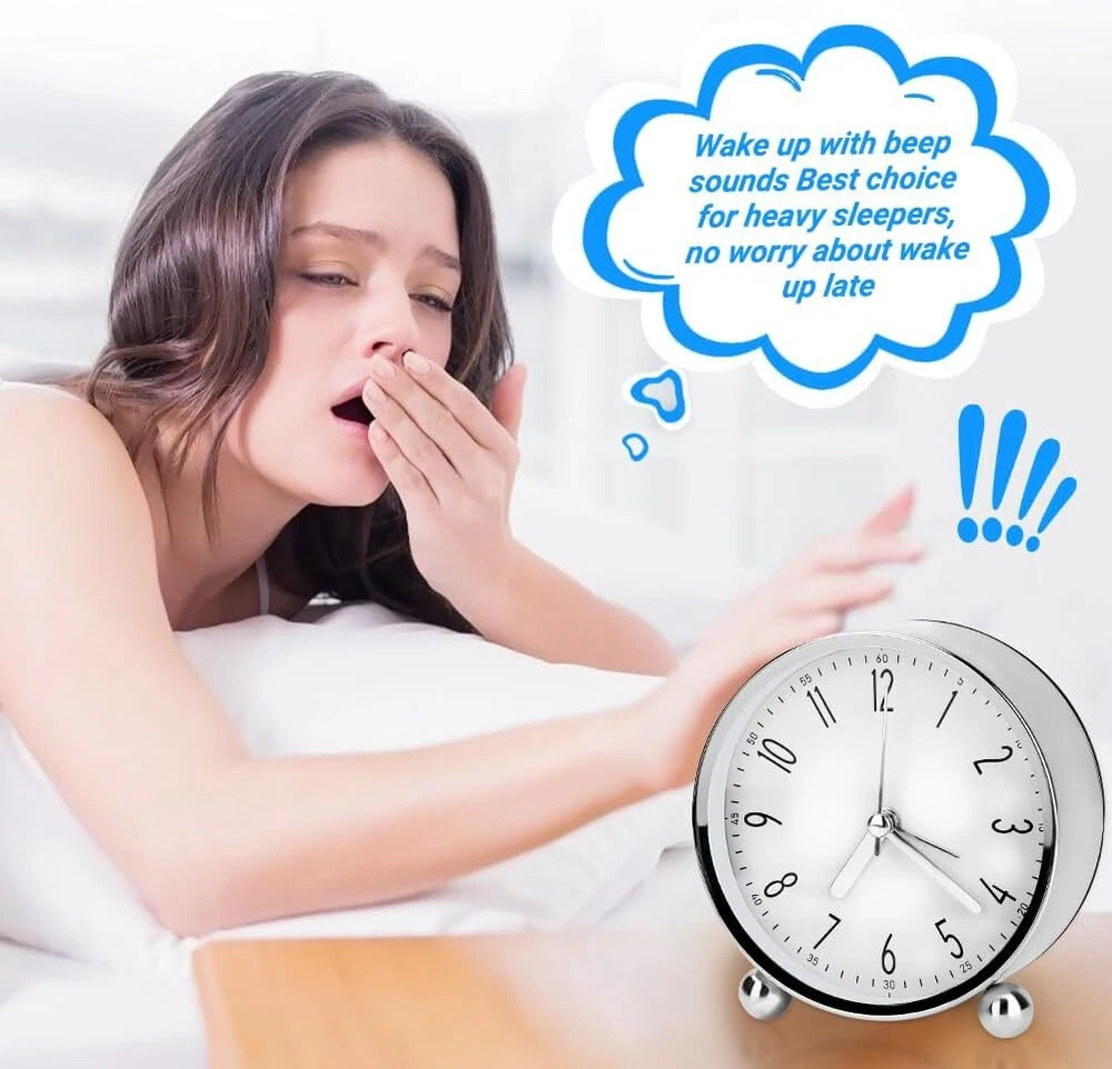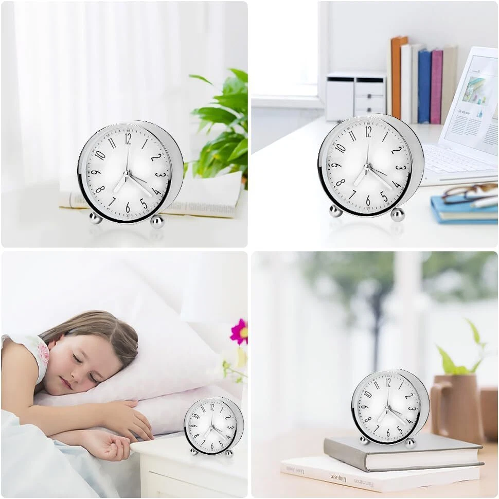 【High Quality & Simple Design】 --- Made of of high quality metal casing and glass mirror, small analog alarm clock is durable and smooth to touch, will not easy to break. Simple design makes your room looks soft and refreshing. 【Super Silent Non Ticking】 --- Uses silent non-ticking mechanism with sweeping movement, the round alarm clock can provide you with a peaceful environment to sleep, learn and work. Precise quartz movements guarantee accurate time. 【Easy to Read & Gentle Wake】 --- Clock diameter: 11.5cm/4.52in, Thickness: 5cm/1.97in. Clear large Arabic numerals make you easy to read, alarm clock designed with gentle wake volume but loud enough to wake you up, good beside wake up alarm clock for children, teens and seniors. 【Easy to Use】 --- The mini analog alarm clock is operated by 1 AA battery (not included). Turn knobs to set the clock time and alarm time, ON/OFF button can help you turn on/off the alarm easily. Pressing LIGHT/SNOOZE button, the light is on and alarm is off, after 4 minutes, it will alarm again. 【Perfect for Many Places】 --- The small clock is perfect for for living room, bedroom, bedside, desk, the exquisite appearance can decorate your bedroom, ideal gift for your family and friends.