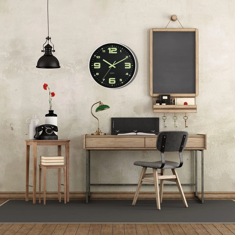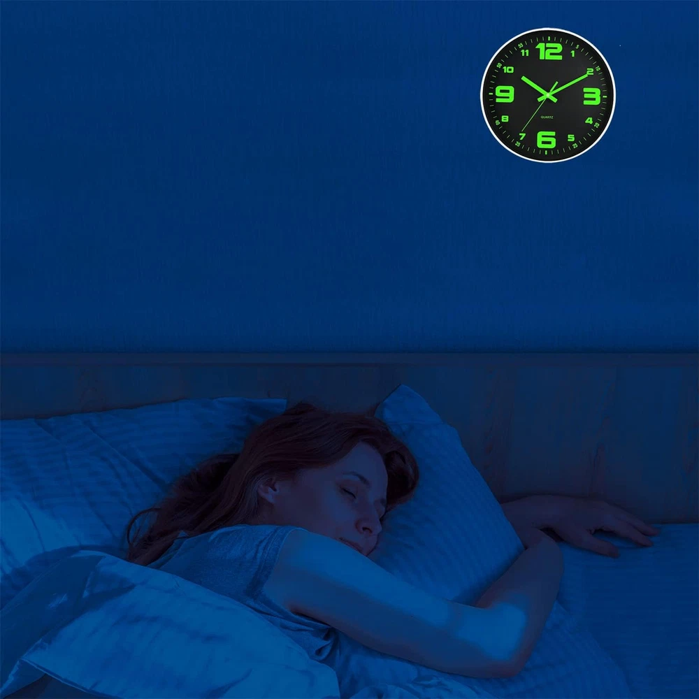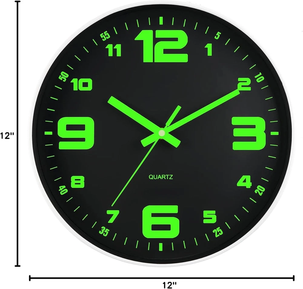 Luminous Wall Clock, Silent Non-Ticking 12'' Night Light Clocks White Product Details Brand: DIYZON Color: White Display Type: Analog Style: Minimalist Special Feature: Silent Clock, Illuminated, Luminous Product Dimensions: 12"W x 12"H Power Source: Battery Powered Age Range (Description): Adult Room Type: Kitchen, Bedroom, Living Room Shape: Round Indoor/Outdoor Usage: Indoor Material: Acrylonitrile Butadiene Styrene (ABS) Theme: Modern Frame Material: Wood Are Batteries Included: No Mounting Type: Wall Mount Item Weight: 1.5 Pounds Alarm Clock: No Watch Movement: Quartz Number of Items: 1 Operation Mode: Electrical Dial Color: White Manufacturer: HomzonDirect Item Weight: 1.54 pounds Country of Origin: China Item model number: DIY-BL-01 Simple Design: The wall clock can absorb light energy during the day, and the large luminous numbers can be easily read at night without turning on the lights. The surface is covered with glass to keep out dust and water vapor for long-lasting quality and durability. Quiet Environment: The high-quality quartz movement has no annoying ticking sound, providing a quiet environment for your sleep and work at any time. Easy to Hang: Come with a hook can be easily installed through the slot on the back of the clock. powered by 1 AA battery (not included). Modern Minimalist Wall Clock: The perfect wall clock for an office, living room, bedroom and any room in your home, also can be used as a gift for grandma, girlfriend or Thanksgiving, Christmas. Customer Service: If you have any problems or questions about this product, please feel free to contact us. Providing high-quality products is our belief that we always adhere to.