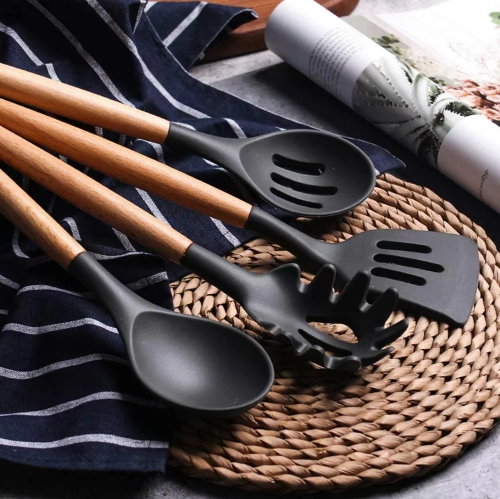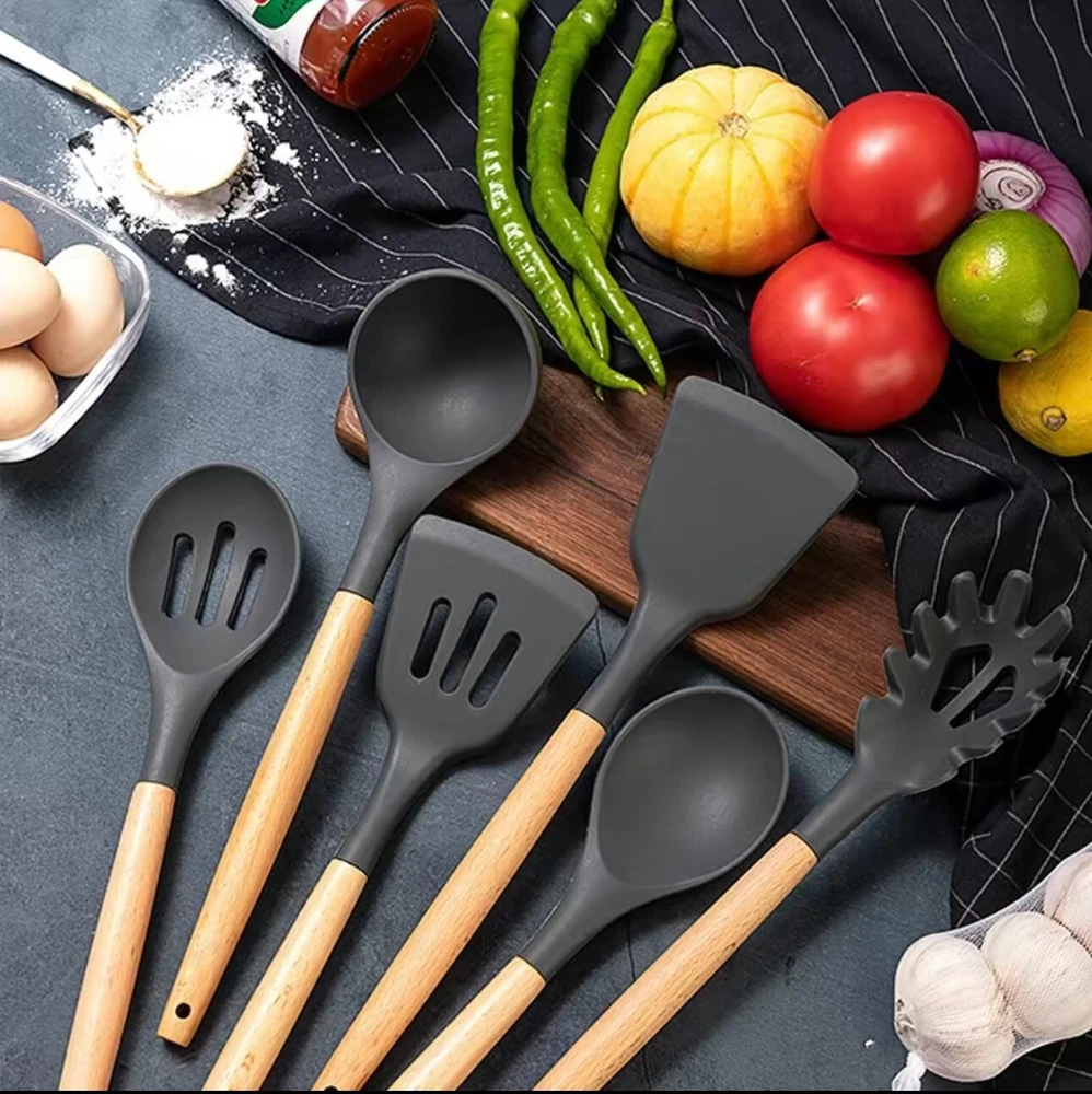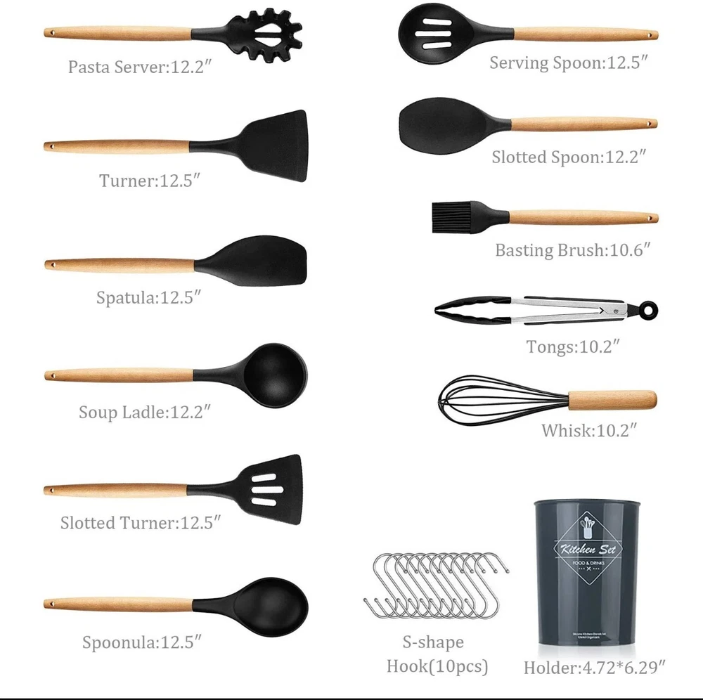 -Brand New - Never Used - Questions: Feel free to ask any Questions - BOX: Never Opened - DESCRIPTION: Protective Design Our kitchen utensils feature anti-scalding wooden handles, ensuring your hands stay safe. The professional silicone set includes all essentials: Pasta Server, Serving Spoon, Turner, and more. Avoid prolonged soaking and dishwashing for longevity. * Safe & Non-ToxicMade from BPA-free, food-grade silicone, these utensils are odorless and safe for high-temperature cooking. Soak for 30 minutes before first use to eliminate any initial smell. * Heat-Resistant & DurableWithstand heat up to 446°F without melting or warping. The soft silicone heads protect your non-stick cookware from scratches. * Sturdy Wooden HandlesDesigned for strength and durability, our wooden handles resist bending and breaking. Contact our customer service for any issues. * * Perfect GiftThis complete set is ideal for cooking enthusiasts and makes a great housewarming or wedding gift, keeping kitchens organized and stylish! - OFFERS: Reasonable offers are considered, LOWBALLERS, Best price and Lowest askers will be ignored - all sales final/no refunds/ no exchanges/ no returns - Disclaimer: I do not own the brand's trademarks, logos, pictures, or products posted. I do not intend to infringe on copyright. I find such content available on the internet. Contents are considered fair use. - Silicone Cooking Utensils 22pcs Kitchen Utensil Set, Wooden Handle Nontoxic BPA Free Silicone Spoon Spatula Turner Tongs Kitchen Gadgets Utensil Set for Nonstick Cookware with Holder and 10 S Hooks Best Christmas Gifts for Your Mom, Friends, or Lover