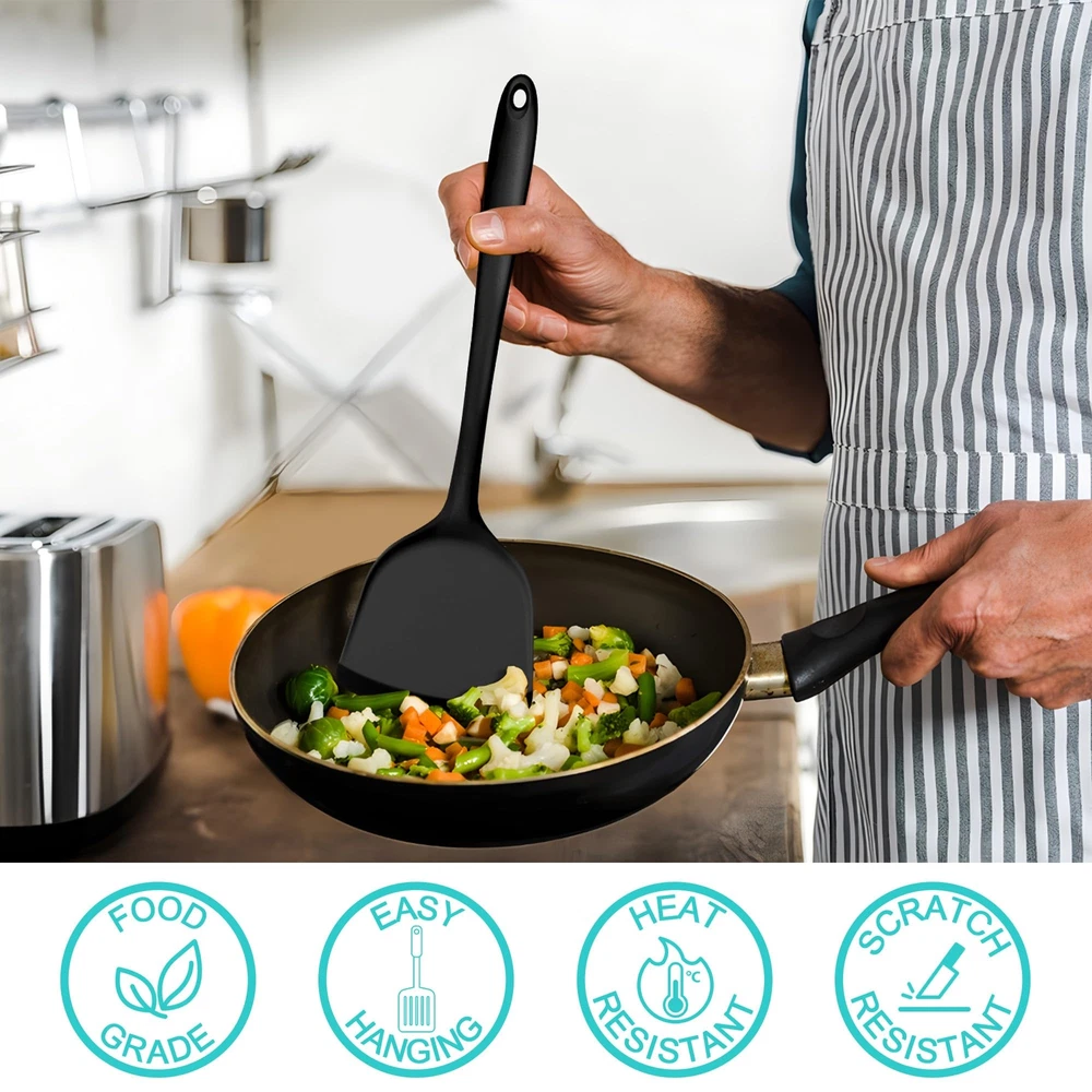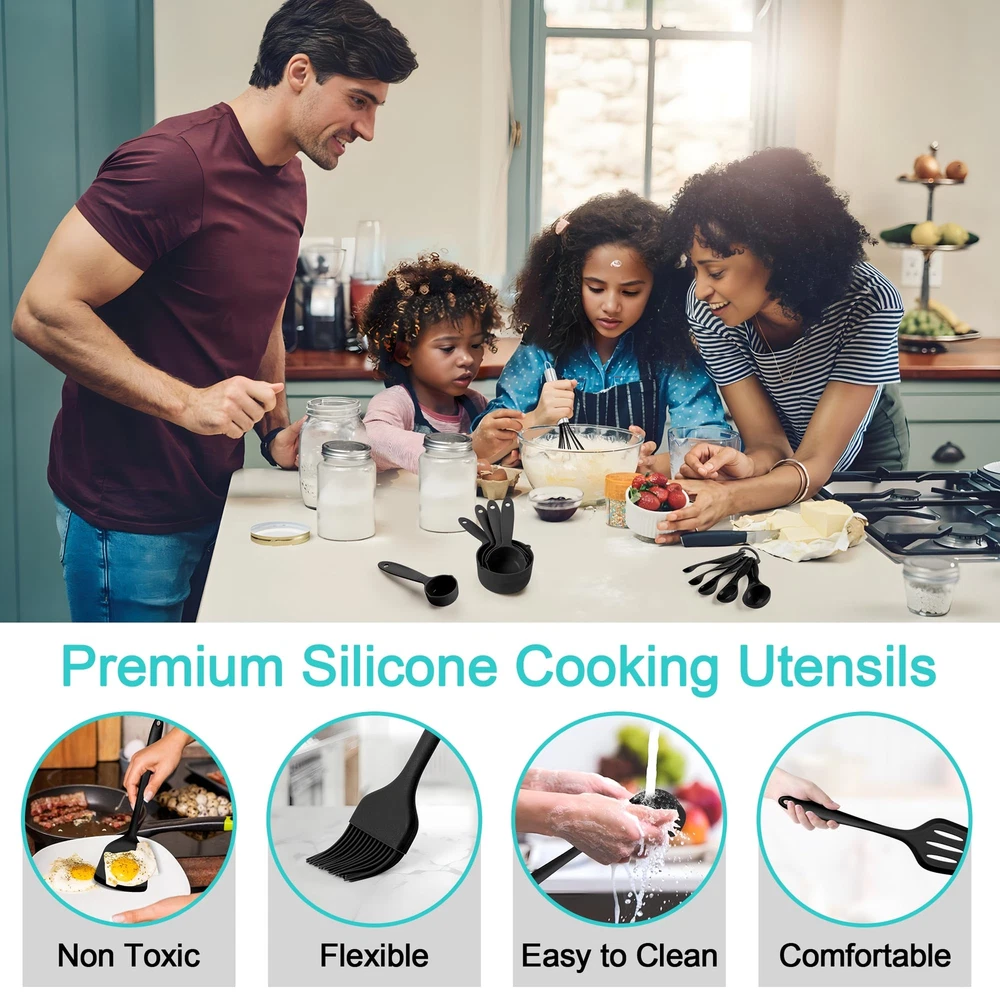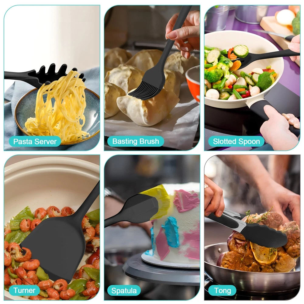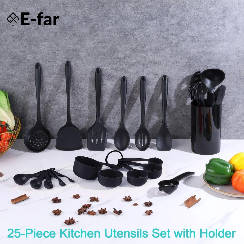 cooking utensils set is made of food grade silicone, which is heat resistant and nonstick, withstand a maximum temperature of 446°F. Flexible silicone material, no need to worry about scratching the bottom of your cookware. Equipped with Spatula Turner, Slotted Turner, Soup Ladle, Pasta Server, Slotted Spoon, Solid Spoon, Spoon Spatula, Skimmer, Brush, Tong, Whisk, Small Spatula, Jar Spatula, Egg Separator, Measuring Cups and Measuring Spoons, fully satisfy your cooking needs, making it a perfect companion for kitchen. SPECIFICATION: Quantity: 25 Piece Material: Silicone Color: Black Features: Food Grade, Heat Resistant, Nonstick, Non Toxic, Scratch Resistant, Flexible, Durable TIPS AND MAINTENANCE: 1. When used for the first time, kitchen utensils can be washed with dish soap for dust and production residue. 2. After using, use sponge cloth to remove the stain. Recommend washing by hand to extend the service life. 3. After drying, store them in the holder or hang them on the shelf in the kitchen. FOOD GRADE & SCRATCH RESISTANT: Made of food-grade silicone free from harmful chemicals, No worry about toxic materials into your food, Flexible silicone head won’t scratch your nonstick cookware unlike metal kitchen utensils, Ensuring your pots and pans stay in tip-top shape while you create culinary masterpieces HEAT RESISTANT & DURABLE: Premium quality silicone are heat resistant up to 446°F, Won't melt or release flavors at high temperatures, Sturdy metal cores provide stability and durability for long-term use while retaining a handy flexibility at the edges, Easy to use for a wide range of cooking tasks, Mix, serve, stir, flip, blend, scramble, and more ANTI-SLIP & ONE-PIECE DESIGN: Ergonomically designed handles feature smooth, blemish-free texture, Anti-slip and comfortable to grip, One-piece molding without any gaps to capture food, Easier to clean than other put-together handles, Non-stick silicone surface makes food less likely to stick, Easy to clean by hand and dishwasher safe EASY TO STORE: Each piece has a hanging loop attached to the handle for easy hanging and convenient storage, Equipped with a plastic holder with drainage holes at the bottom to help dry tools quickly, You have the option to hang them on the wall or put them in the holder when not use, Save space and make kitchen countertop clean and tidy ALL-IN-ONE VALUE SET: Contains Spatula Turner, Slotted Turner, Soup Ladle, Pasta Server, Slotted Spoon, Solid Spoon, Spoon Spatula, Skimmer, Brush, Tong, Whisk, Small Spatula, Jar Spatula, Egg Separator, Measuring Cups and Measuring Spoons, A variety of kitchen tools satisfy all your cooking and baking needs, Will be great companions in your kitchen