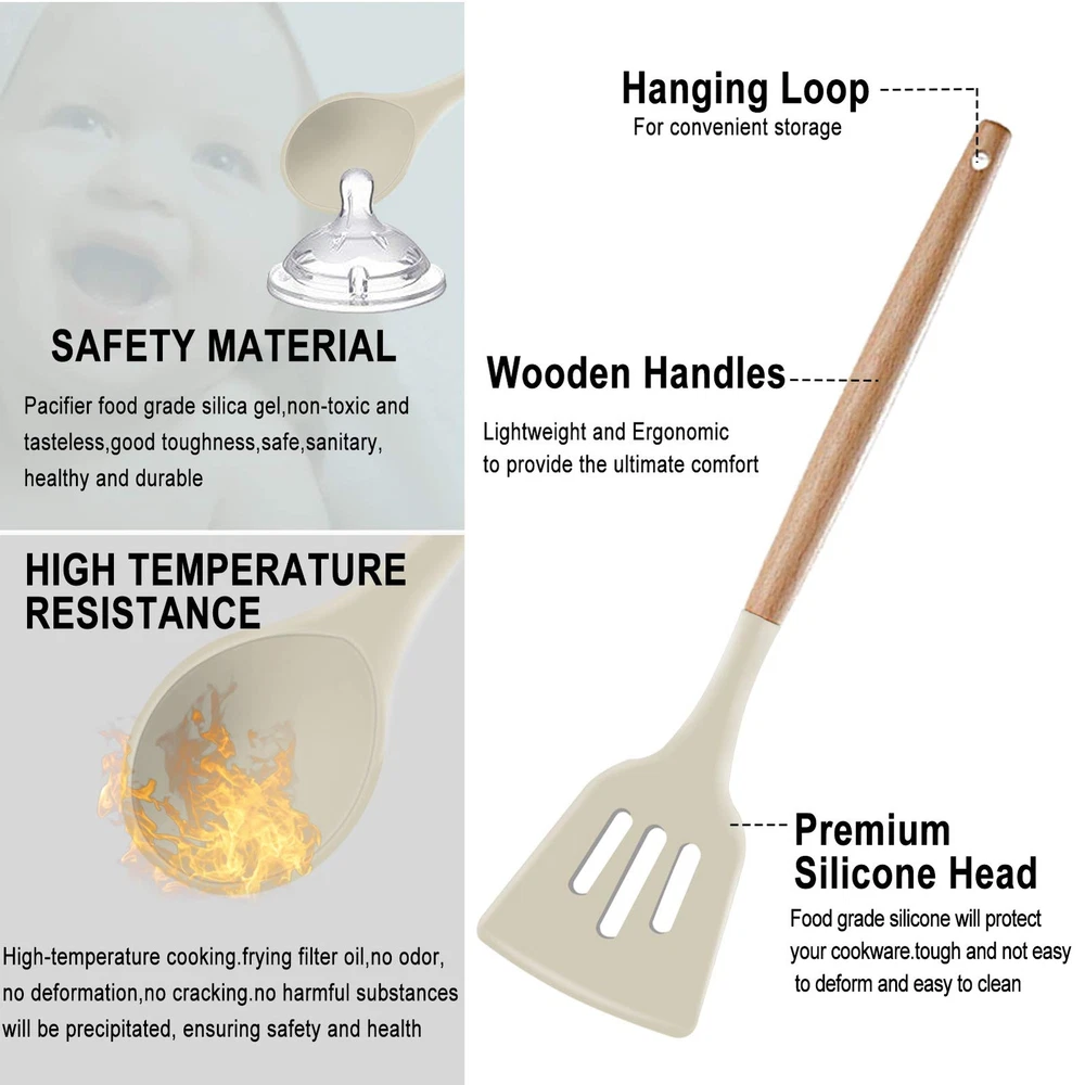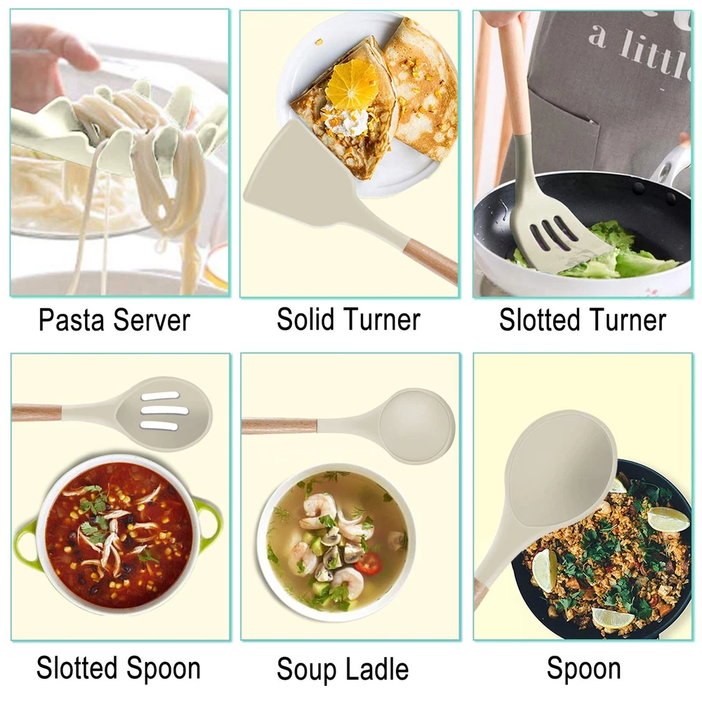 【19pcs Premium Kitchen Utensils Set】Silicone kitchen utensils set includes 12pcs cooking tools that will suit all your cooking and baking needs. Our silicone kitchen utensil set includes: Tong, Whisk, Basting Brush, Slotted Spoon, Slotted Turner, Pasta Server, Spoon, Spatula, Round Spatula, Solid Turner, Soup Ladle.Also come with the gift of 5pcs small Measuring Spoons of different sizes and 2pcs Silicone Mini Gloves all are in gold color. 【Heat-resistant & Non-stick & Non-Toxic】Our silicone kitchen utensils set use food grade silicone which are super heat resistant up to 464°F/240°C.The high heat tolerance of the silicone heads prevents the utensil from melting when exposed to heat. Kitchen utensils are also non-stick and non-toxic,easy to use and store. Only the basting brush silicone head and wooden handle are designed to be detachable, it can be put back at any time without affecting the use and easy to clean. 【Safe Cooking Utensils for Kitchen】Our kitchen tools are made of high quality thermoplastic silicone heads designed to protect the surface of precious non-stick cookware. silicone is safe to use for any type of food .The kitchen utensil set does not react with food or beverages, or produce any hazardous fumes. 【Solid Wooden Handle to Prevent Burns】This cooking utensils set combination of silicone head and wooden handle, the wooden cookware handle is ergonomically designed for comfortable grip, does not transfer heat to protect your hands and provide protection against rust. 【Easy Storage with Holder】Our silicone kitchen utensils set comes with a plastic holder for convenient storage organization. Each wooden handle has a practical hanging hole for wall hanging using hooks.