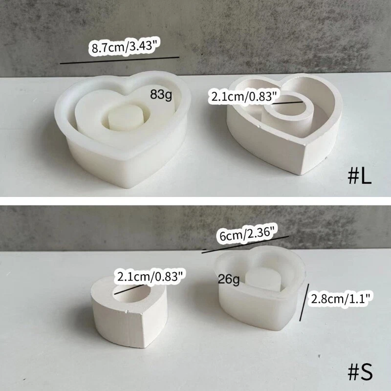 Silicone Mold for DIY Love Heart Holder Candleholder Resin Molds Decors Features: silicone material, environmental protections, flexible, reusable and easy to shape and demold. Non-stick, easy separation, high temperature resistance, easy and recyclable. Simply pour resin, concrete, or other materials into the mold, after curing, simply loosen the ends around the mold and rotate the silicone mold to release it from the silicone mold. You can also add your favorite sequins or decorations to the resin mold to create unique Finished resin candlesticks are for placement in living rooms, table decorations, kitchen counters, and other corners of living and office spaces, creating a warm and unique Specifications: Silicone Size: S, L(optional) Size S: Approx. 2.8x6cm/1.10X2.36inch Size L: Approx. 8.7cm/3.43inch Package Includes: 1x Love Heart Candleholder Silicone Mold note: Please allow 1-2cm errors due to manual measurement. Please allow for slight color differences due to different display resolution.