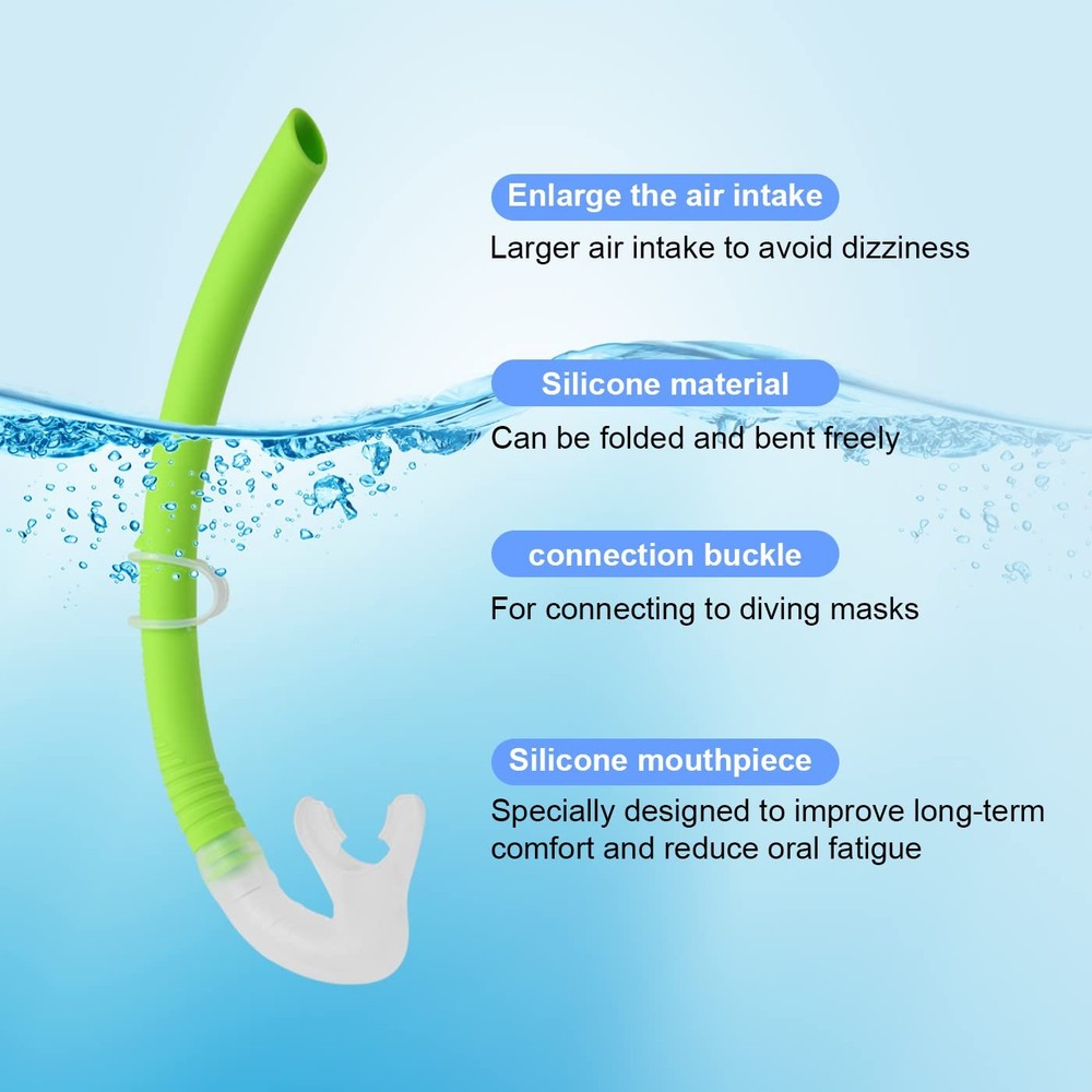 Oversized vent This breathing tube has a large vent hole, which is 2-3 times that of an ordinary breathing tube, ensuring sufficient air intake Soft tube The silicone mouthpiece can be rotated to different angles to better fit your face. The bendability can be easily adjusted to best meet your needs. Silicone mouthpiece Silicone mouthpieces are softer and more flexible than PVC mouthpieces. The snorkel with a silicone mouthpiece is more comfortable, especially for prolonged use. This snorkel is designed for divers, fishing and hunting enthusiasts, underwater hockey players, and scuba divers Compared with ordinary breathing tubes, this enlarged-diameter breathing tube can provide smoother breathing The snorkel made of silicone can be folded and bent very flexibly, and we have slightly strengthened its hardness to avoid the wave from bending it We provide two height-adjustable mask holders, which can be replaced according to your preferences The silicone mouthpiece adopts a special design, which can improve the comfort of long-term use and reduce mouth fatigue