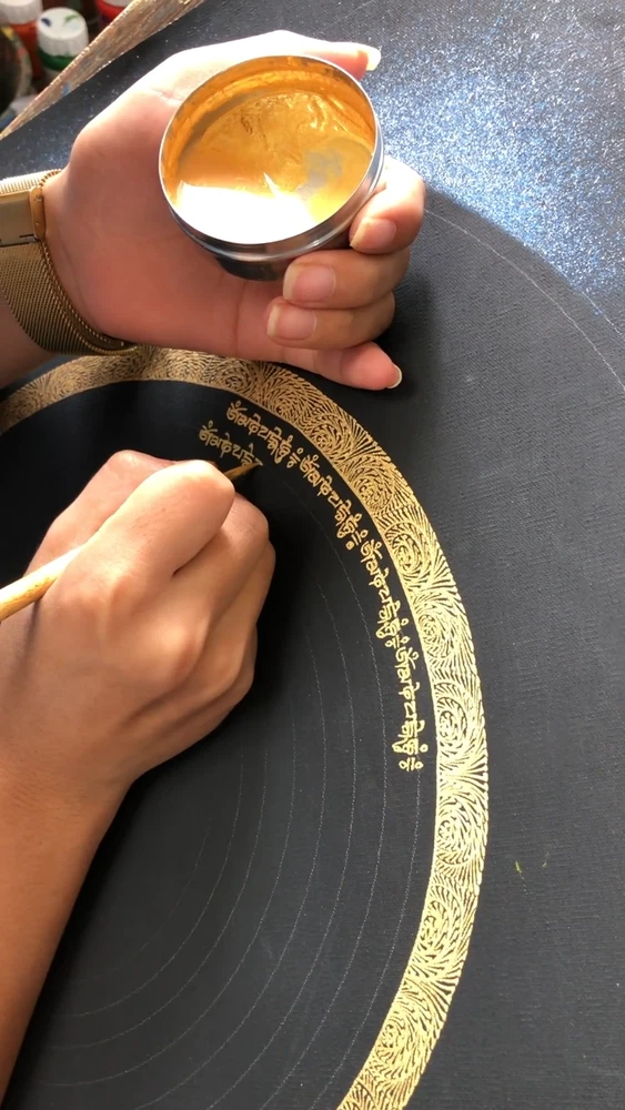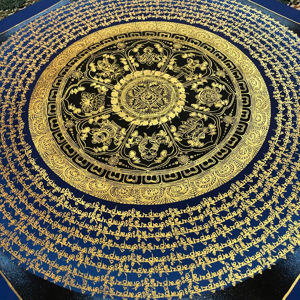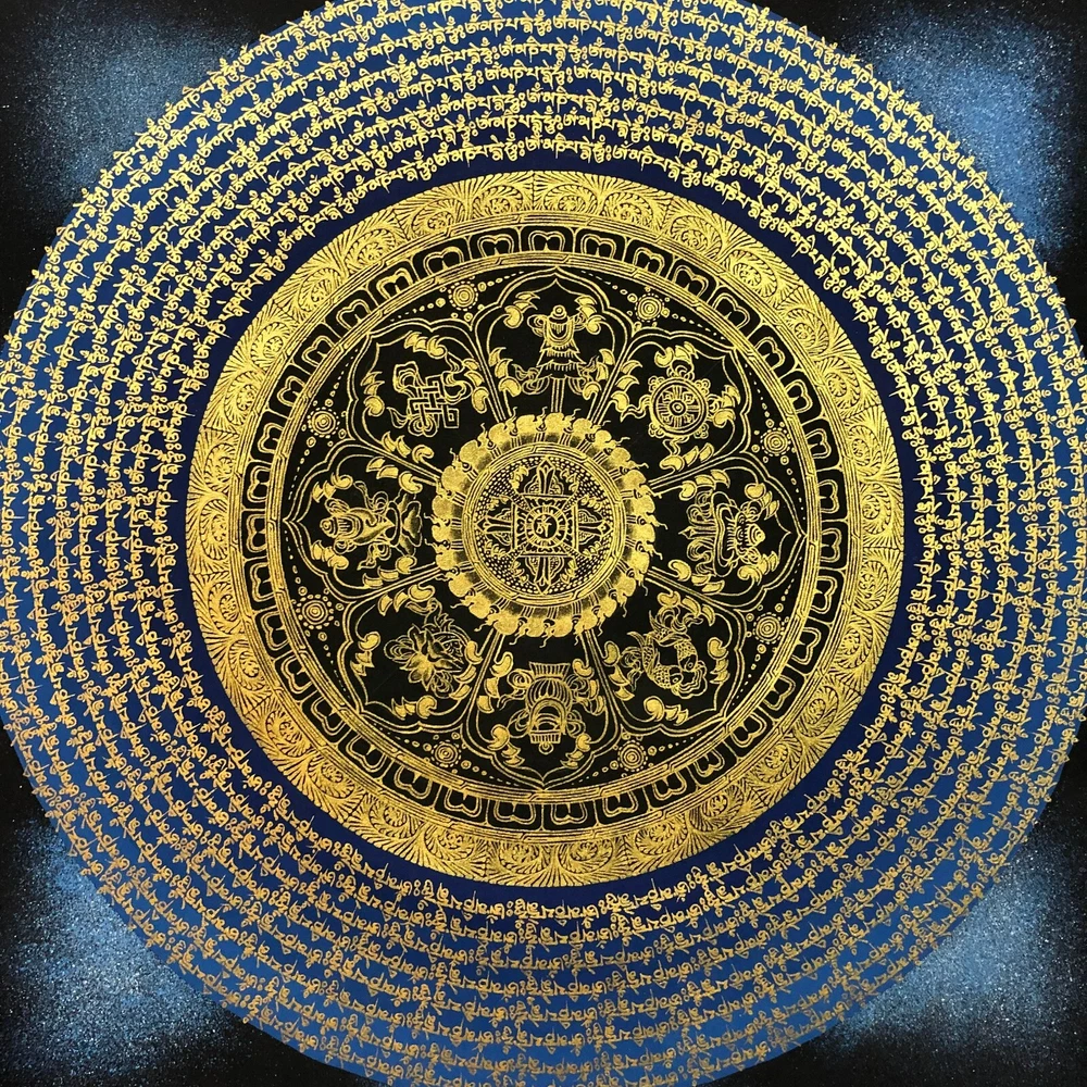 ~~Mantra Mandala Thangka Art~~ Mantra here refers to the recitation of the quintessence words of the specific ceremonies of divinities. When the word mantra is isolated into two fragments, it uncovers the inward menning of rescuing one's intellect from conceptualization, concept and fear. "Man" in Sanskrit implies intellect, and "tra" in Sanskrit implies to ensure. [Size: 115 cm x 90 cm] Material Used: • Cotton Canvas • Natural Pigments and colors • Gold leaf ~Excellent for meditation or home/office décor, ~Tibetan Yoga Wall Art ~Genuine 100% hand-painted from Himalayas