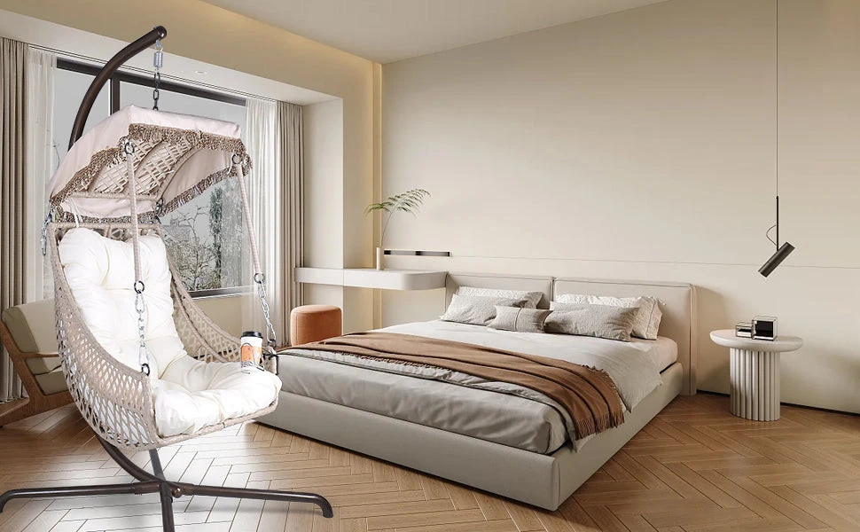 Specifications Place of Origin China Main Color Beige leaf Main Material Rattan+Metal Dangerous Goods #dangerFlag# Dimensions & Weights Assembled Length (in.) 38.00 Assembled Width (in.) 38.00 Assembled Height (in.) 78.00 Weight (lbs) 30.00 Product Features [ ]Sturdy and Durable: The whole frame of this hammock swing chair is made of powder-coated metal to avoid rust problems, the frame and seat surface of the outdoor swing egg chair are wrapped by rattan resin wicker, the rattan has anti-aging effect for outdoor up to 3 years, with 304 stainless steel hook and hardware accessories, 4-point support stand, safe and reliable, very durable, the maximum load is 350lbs. [ ]Comfortable and Novel Exterior Design: The ergonomically curved mid-back perfectly supports your entire body, the comfortable angled design of the backrest with soft UV-resistant thick cushions can reduce the pressure and fatigue of the head and spine, providing you with a comfortable experience;Novel exterior design is essential for embellishing your home,combining the advantages of leisure and aesthetics. [ ]Easy To Assemble & Easy to Move: This lounging chair stand frame is simple to assemble together with the included installation tools and accessories; Everything you need is in the box, including the chair, seat cushion, safety strap and stand. Easy and quick installation: The installation can be completed in several minutes for one person. Good looking patio swing egg chair is easy to move. [ ]Dimensions & Specifications: Perfect size: overall size 38x38x78inch,seating size 31*28*67inch,the height of the seat above the ground can be adjusted according to the user's height. The adjustable seat height can reach up to 87 inches, and even tall individuals will not be unable to sit due to the seat being too short. It can be wiped clean with a damp cloth which is easy and convenient. [ ]Indoor/Outdoor: Suitable for bedrooms, halls, balconies, backyard patios, decks, solariums, gardens, near swimming pools, or outdoor bars, etc., ideal for reading, relaxing, sunbathing or working. The perfect addition to any space, it is the best gift for birthday, New Year, Thanksgiving, Christmas and other holidays Description