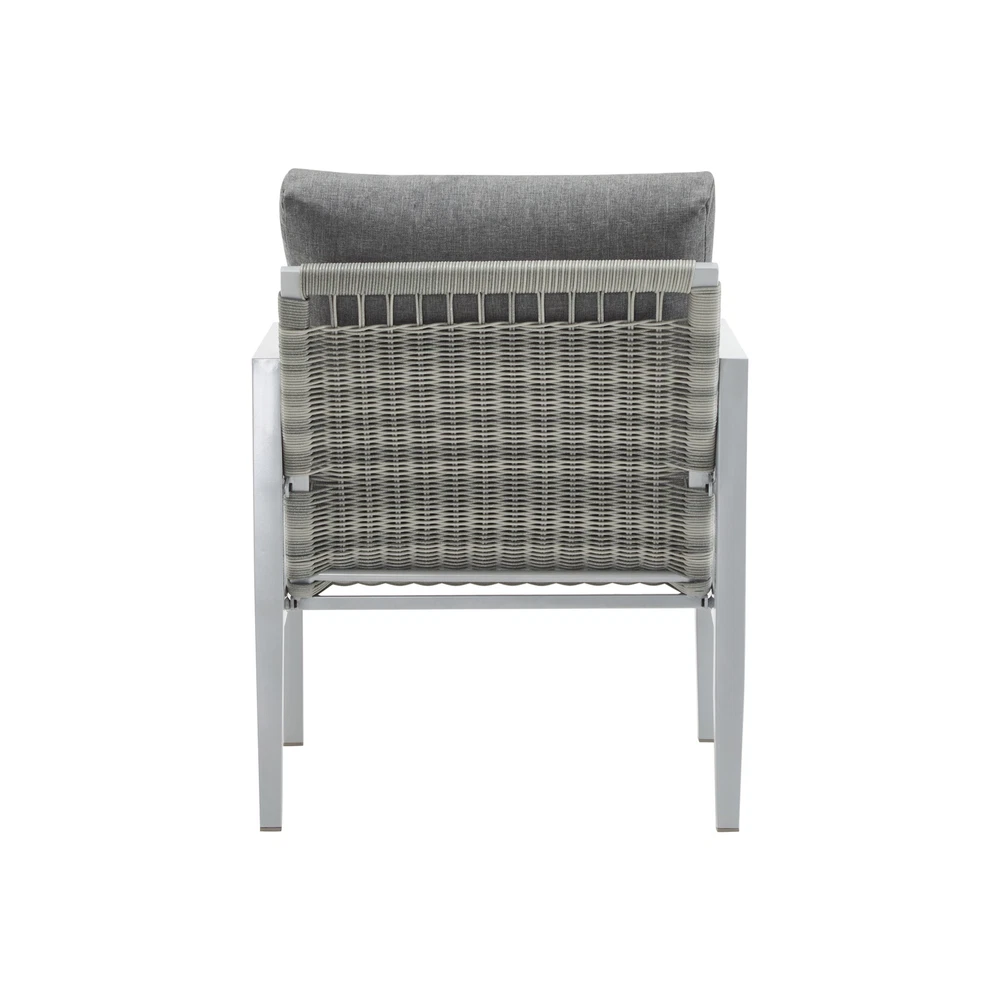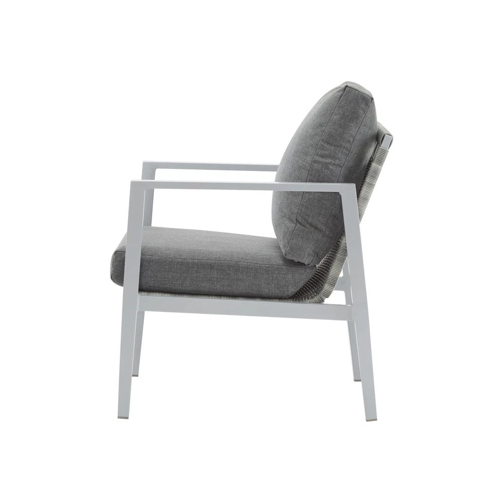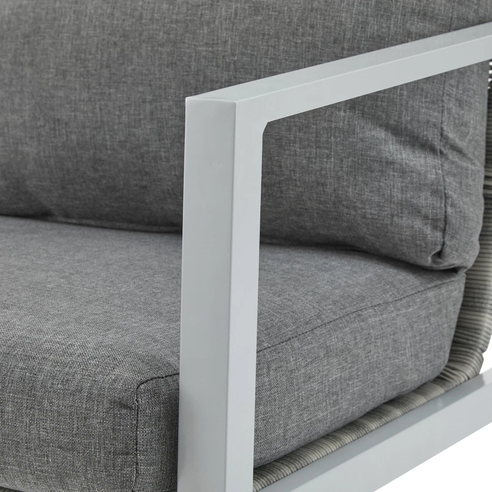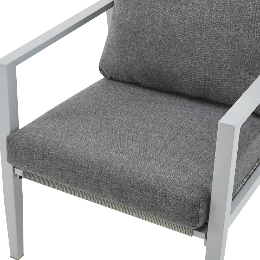Product Features Sleek Modern Design: With clean lines and a minimalist aesthetic, this lounge chair features a bold aluminum frame complemented by elegant rope accents. Its sophisticated design enhances any contemporary outdoor or indoor space, from patios to living rooms Durable and Weather-Resistant Construction: Built with a powder-coated aluminum frame and tightly woven synthetic rope, this chair is designed to resist rust, fading, and wear, ensuring it withstands outdoor elements while maintaining its stylish appearance Exceptional Comfort: The thick, high-density seat and back cushions offer outstanding support and relaxation. The ergonomic design, including angled back support and armrests, makes it an ideal choice for lounging, reading, or entertaining Versatile and Functional: Lightweight yet robust, this chair is easy to move and perfectly suited for a variety of settings. Its modern design and durable construction make it a timeless piece for gardens, balconies, or indoor spaces, seamlessly blending style with functionality
