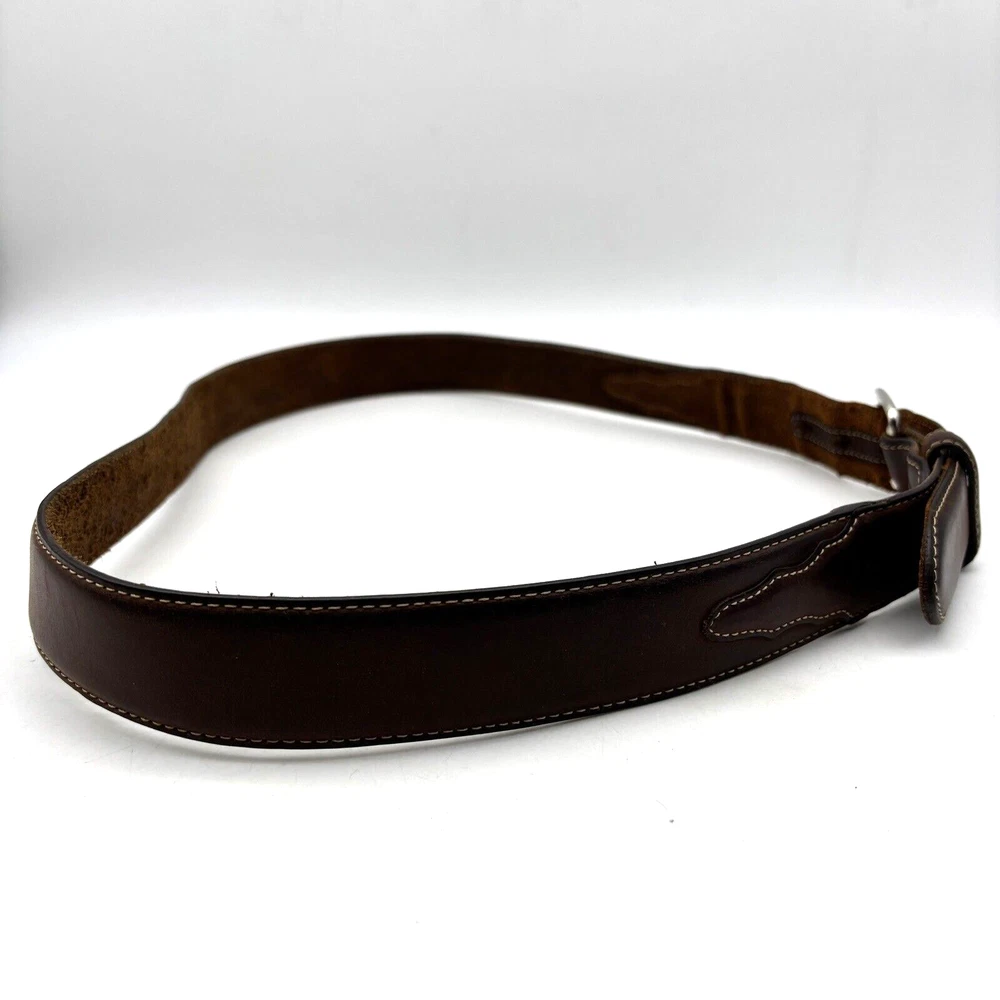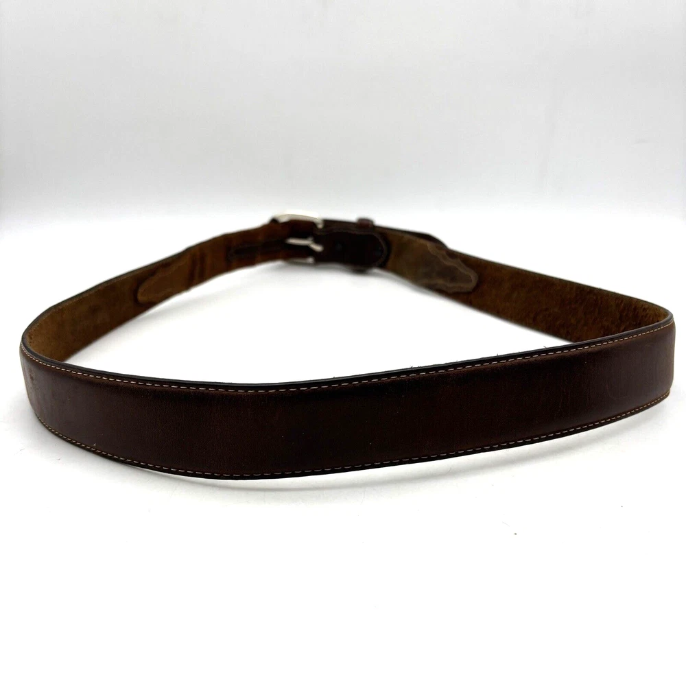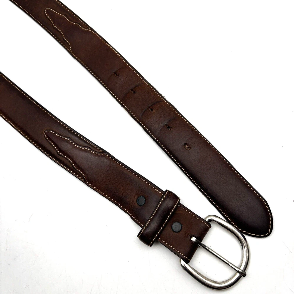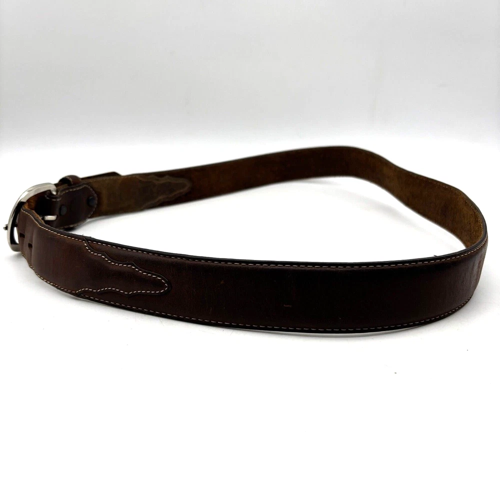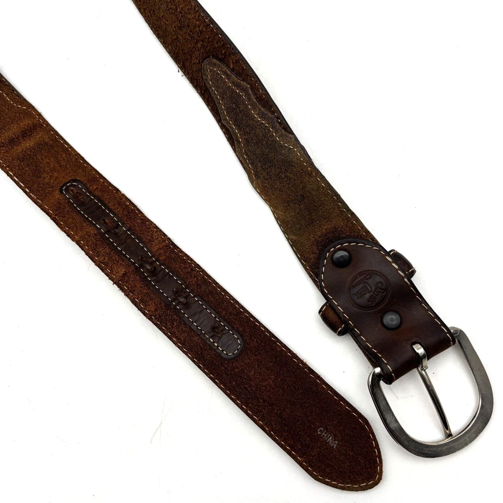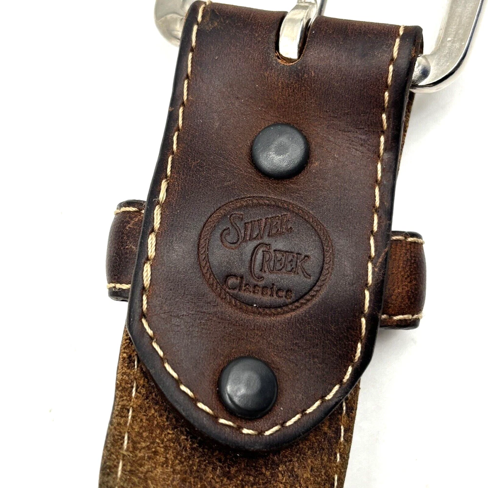 Silver Creek Belt Style Code: 5709 Brown Genuine Leather Southwestern Embroidered Overlay Design Silver-tone Interchangeable Buckle Very thick, high quality leather! Size 42 Refer to measurements below to ensure accurate fit before purchase! Buckle: 3.5" long 2 3/4" wide Belt Measurements: 1.5" wide 49" full length from buckle prong to belt end 41" smallest hole 45" largest hole 5 holes total Great pre owned condition. Gently owned. Mild wear near belt holes - shown in photos. Clean and from a smoke free home.