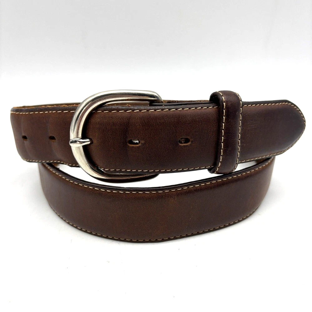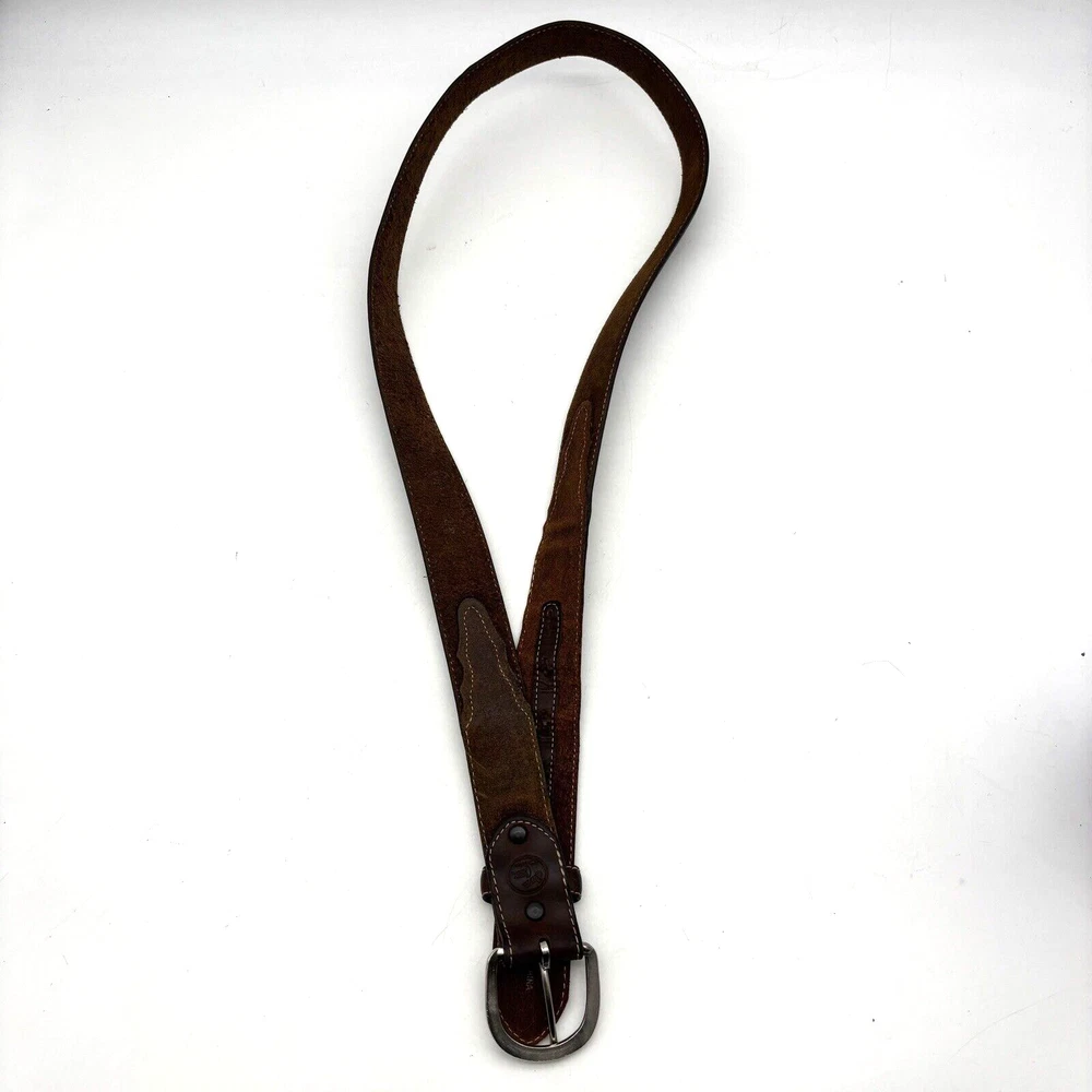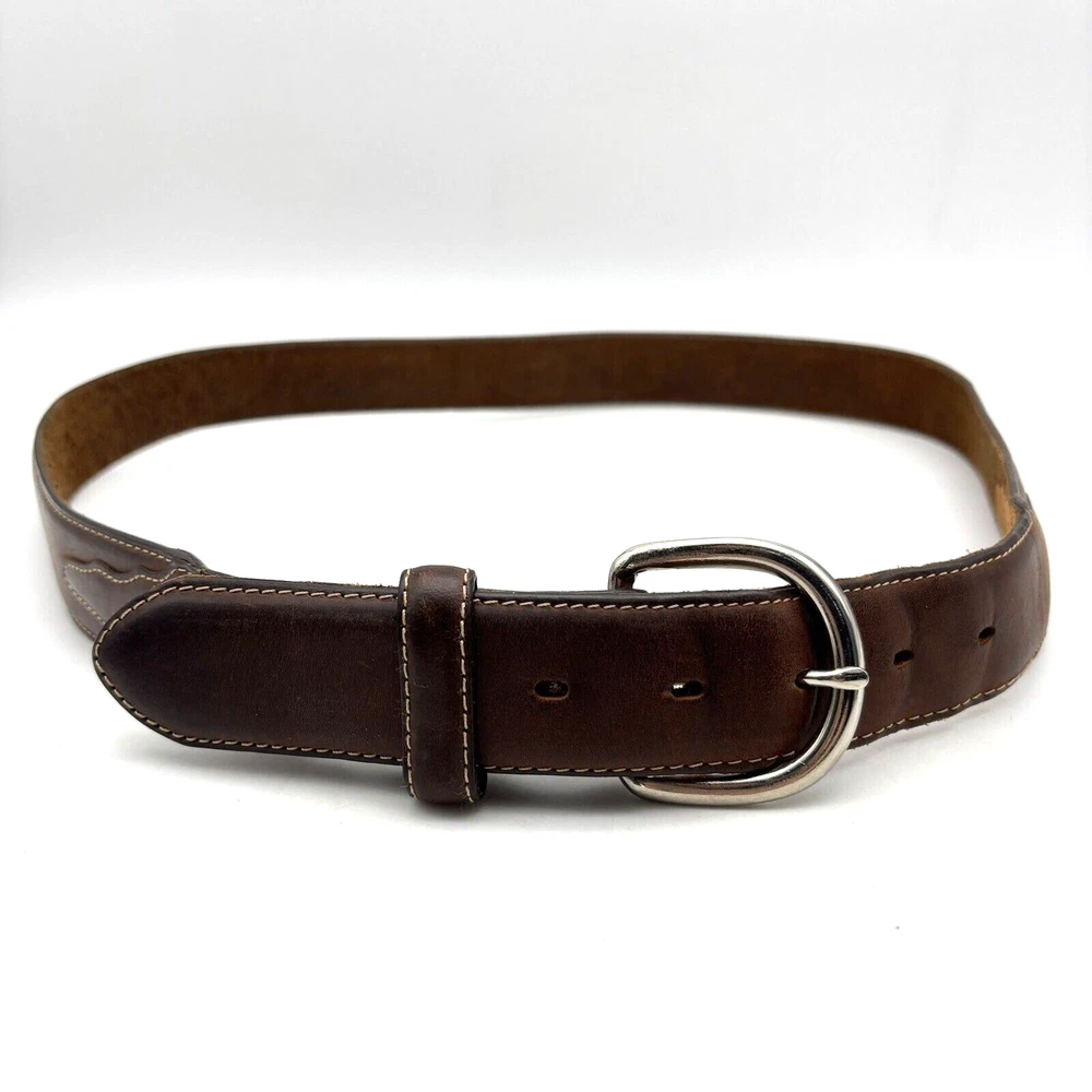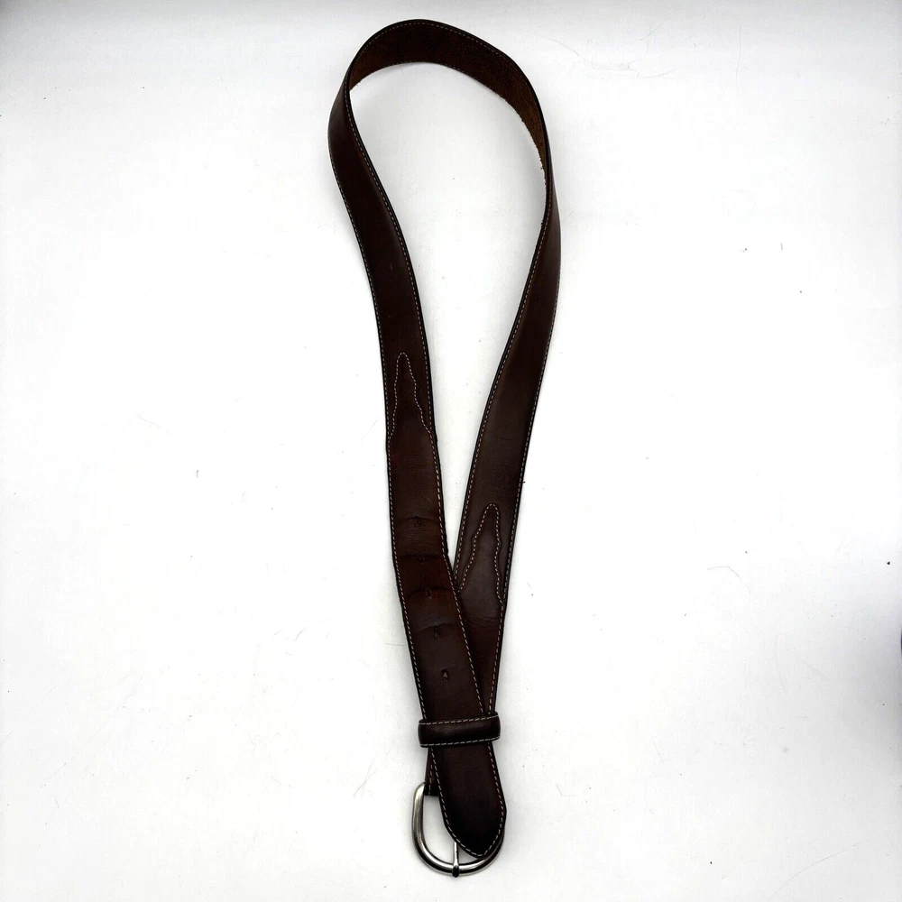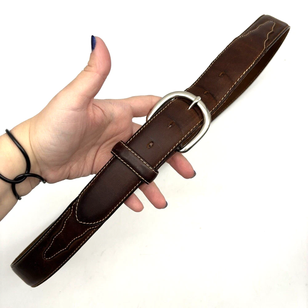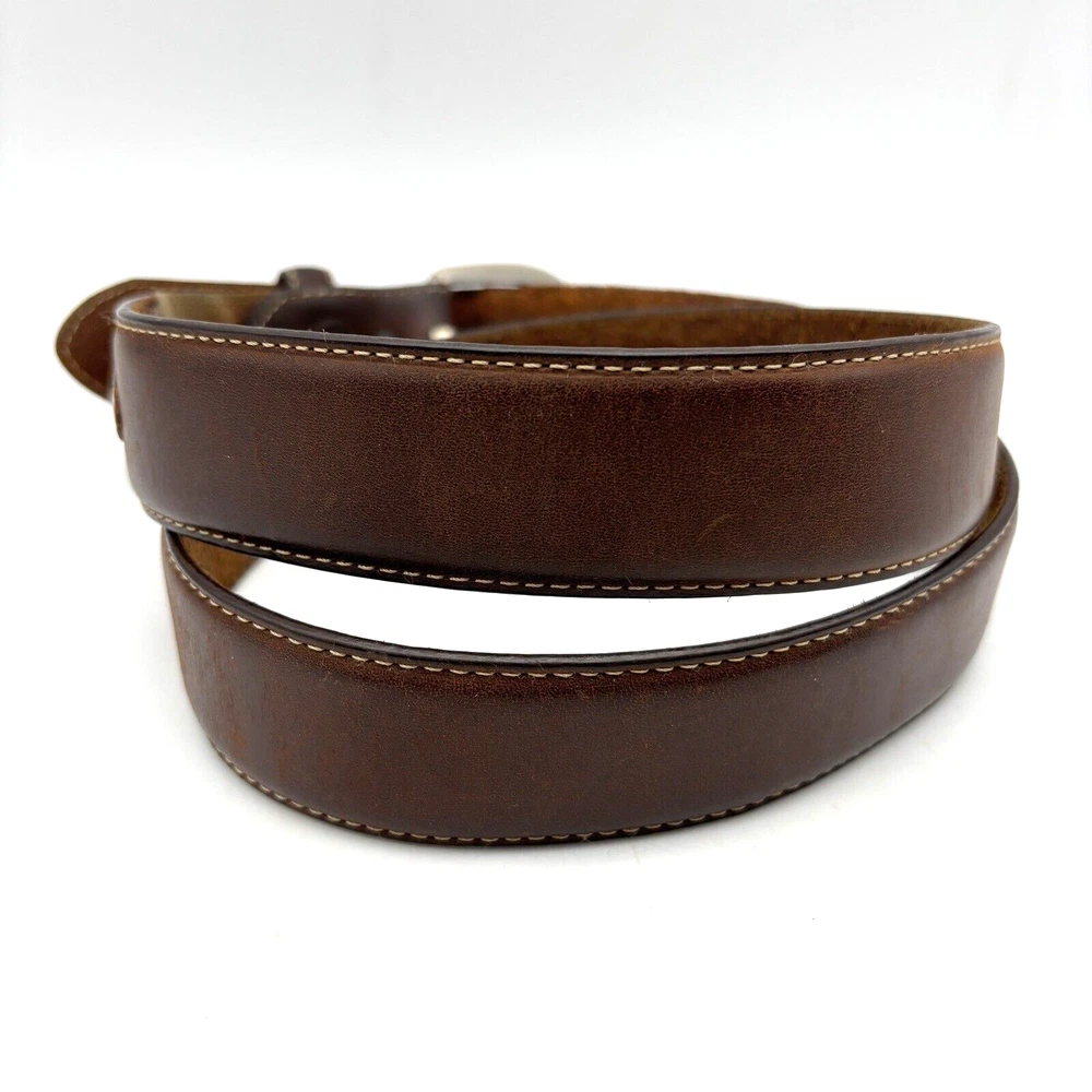 Silver Creek Belt Style Code: 5709 Brown Genuine Leather Southwestern Embroidered Overlay Design Silver-tone Interchangeable Buckle Very thick, high quality leather! Size 42 Refer to measurements below to ensure accurate fit before purchase! Buckle: 3.5" long 2 3/4" wide Belt Measurements: 1.5" wide 49" full length from buckle prong to belt end 41" smallest hole 45" largest hole 5 holes total Great pre owned condition. Gently owned. Mild wear near belt holes - shown in photos. Clean and from a smoke free home.