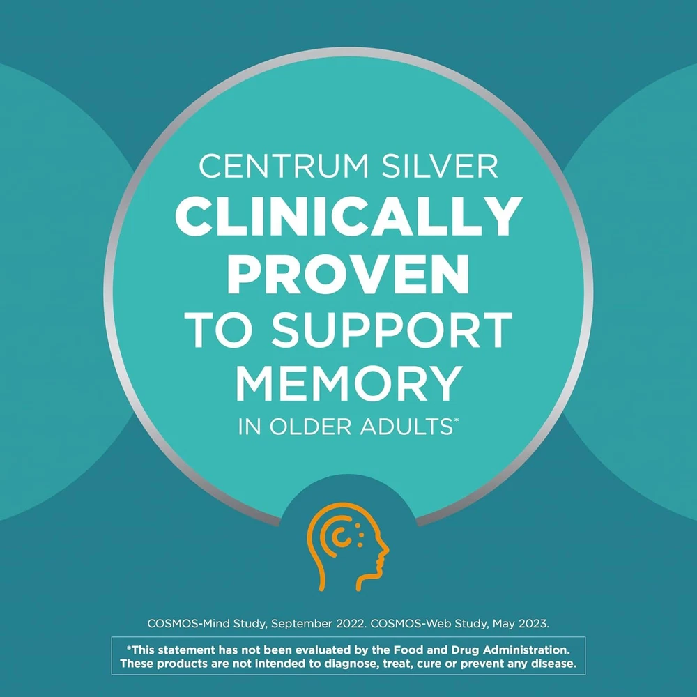One 200 count bottle of Centrum Silver Multivitamin for Men 50 Plus, Multivitamin/Multimineral Supplement with Vitamin D3, B-Vitamins and Zinc Centrum Silver is the number 1 Doctor recommended multivitamin brand now shown to support memory and cognition in older adults (1) Supports memory and cognition as you age (1) Senior multivitamins for men 50 and over that help support immune health, and has Vitamin D to help support bone health and muscle function (1) Vitamins for eye health and zinc supplements that are Non-GMO and are gluten free (1, 3, 4) A multivitamin for men over 50 that is an ideal supplement for eye health, heart health, and brain health (1, 2) Take one of these vitamins for men over 50 every day to provide nutrients to help support a healthy body (1) Centrum Silver Multivitamin for Men 50 Plus is a multivitamin/multimineral supplement with micronutrients to help support wellness complete from A to zinc (1). The daily multivitamin for men over 50 contains Vitamin D and magnesium to help maintain muscle health, B Vitamins to help promote heart health, zinc to help support brain function, lutein and Vitamins A, C, and E to support healthy eyes (1, 2, 3). The senior multivitamin for men is a verified Non-GMO (4) and gluten free multivitamin supplement for men. The men's multivitamin has a coating that makes the multivitamins for seniors easy to swallow. Take one of the senior men's vitamins to provide your body with vitamins and minerals. Centrum Silver is the number 1 Doctor recommended multivitamin brand now shown to support memory and cognition in older adults (1).* * IQVIA: Claim substantiation Validation Statement. July 2023. IQVIA, using the ProVoice Survey, recorded the product recommended most often within the Adult Multivitamins category by physicians and pharmacists in the United States. A statistically significant majority of the panel of physicians and pharmacists responded that Centrum is the product they endorse most.(1) These statements have not been evaluated by the Food and Drug Administration. This product is not intended to diagnose, treat, cure or prevent any disease.(2) Not a replacement for cholesterol-lowering drugs (1) (3) Read more about our Non-GMO standard on Centrum's official website.