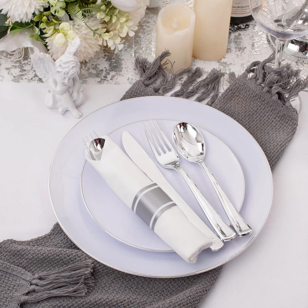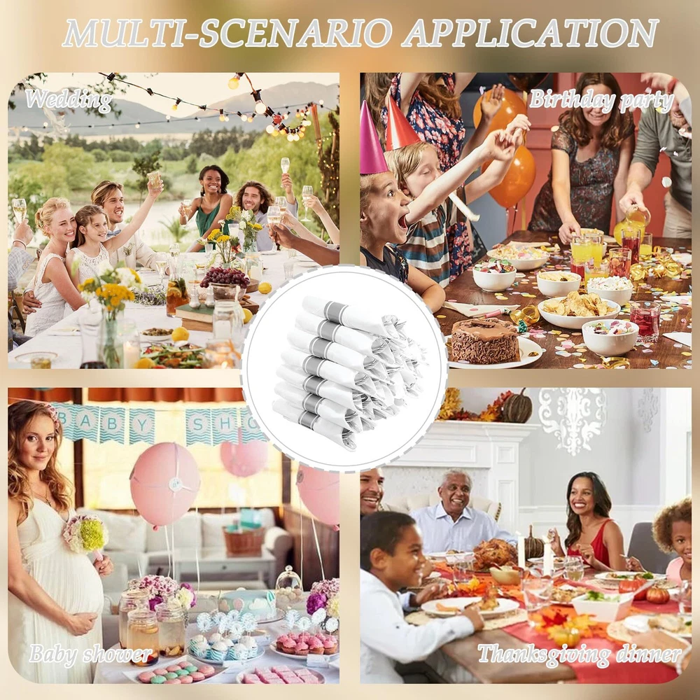 Description 120Pack Silver Plastic Silverware 【Super Pack】These silver plastic silverware includes 120 silver plastic forks, 120 silver plastic spoons, and 120 silver plastic knives, 120 white napkins. Whether it's a birthday party or a wedding, the wrapped plastic cutlery set with napkin is everything you need for a perfect mealtime experience. The silver silverware disposable will totally make your guests happy at the party! 【Strong and Durable】This rolled plastic silverware is crafted of food grade materials. The silver plastic forks and spoons are not easy to break or bend during use, allowing you and your guests to cut through even tough and dense food with confidence. Pre rolled napkins with plastic cutlery set can make it easy to clean the corners of your mouth during and after meals. 【Reasons for Popularity】Our silver disposable dinnerware set can be used for wedding / Birthday party, rehearsal dinners, graduation ceremonies, anniversaries, birthday parties, Christmas, Thanksgiving and other parties. This silver disposable cutlery is exquisitely designed and will definitely make your party more colorful. 【Food Safe】The pre wrapped silverware and napkin is made of food-safe plastic that is non-toxic and BPA-free, are safe to come in with any food. The smooth edges and high quality texture provide a comfortable dining experience. The silver plastic silverware is safe. 【Diversity of Choices】Our pre rolled napkins with plastic cutlery set are available in a wide range of quantities at the store. We've got everything you need to satisfy your cravings for convenience. Pro tip: The rolled silverware disposable, making cleanup a breeze after throwing a big party. Lighting - brightening up your life!