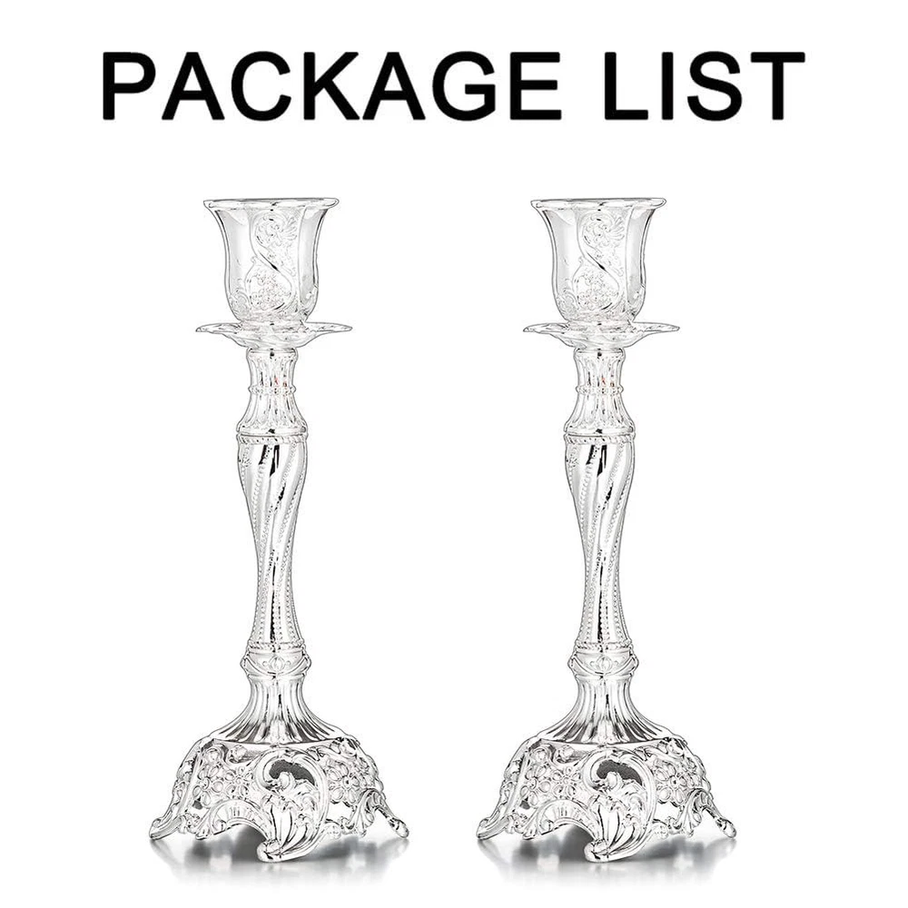 Are you looking for a intricate engravings candlestick for you special events? Our silver plated candlesticks Holders suits the color scheme of nearly any setting. They are perfect for the Shabbat or holiday table when you do not want to use your ornate antiques. Material: metal Color: silver Size: Height: Small: 10cm/3.9” Large: 18.8cm/7.4” Base wide: 7.6cm/3” Package List: 2 × Size L metal candlesticks holder NOTE: If the holders are much wider than the candles you bought, you can melt the bottom of the candles in order for them to stand up straight, or you can wrapped the candle base in a little aluminum foil and they will be fine. has a wide selection of wedding/party and home decorative items, especially focusing on decorative candle holders, hanging glass bulbs, toasting champagne glass for wedding ceremony or anniversary keepsake, and metal vase for flower arrangement for wedding/party centerpiece. Here you can find various decorative styles of candle holders, such as farmhouse, organic, casual, rustic, Scandinavian, modern styles and so on. ELEGANTLY DESIGN: These sterling silver plated candle sticks feature flowers, swirls, and textured designs carved with discerning detail. The top opening and base piece are shaped like flowers. Plain candles will appear elegant in these ornate holders. STABLE & DURABLE: Our taper candle holders is very durable, with a low center of gravity and a nice wide base, so it is can be confident they will remain standing securely. CONSIDERATE DESIGN: The candle holders made of metal, don't worry about the hot tears of burning candles, in addition, the hot tears will dripped onto the holders and not onto your table when you used it. APPLICATION: Our silver plated candlesticks holders fit seamlessly into any occasion, whether a wedding, party, celebration, a candlelit romantic dinner at home or a restaurant. And the ornate design of these candlesticks is also suitable for religious rituals and ceremonies, such as lighting Shabbat candles, as well as for party and special occasion decoration.