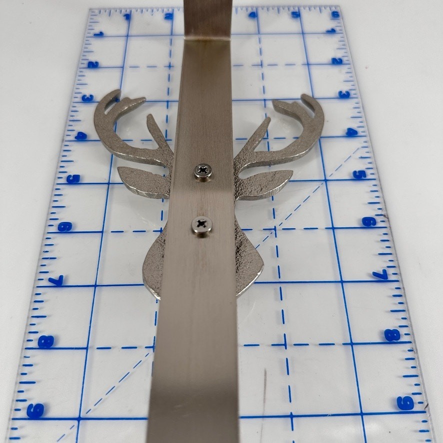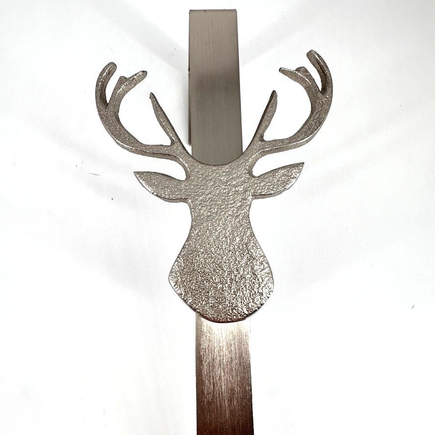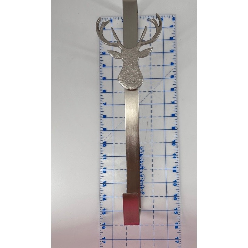 Bring festive flair to your holiday entryway with this silver-tone reindeer head wreath hanger. This stylish metal hook fits over most standard doors and provides a sturdy hanging solution for wreaths, garlands, or seasonal décor. Textured antler design and brushed silver finish give it a modern yet rustic look, perfect for any Christmas theme from farmhouse to glam. I will wrap in bubble wrap and ship in a poly mailer to save on shipping Please review pictures for details.