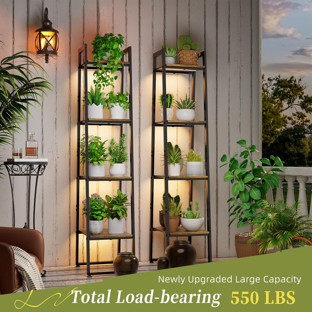 【Professional 3-in-1 Plant Grow Light System】Equipped with 3 sets of independent dual-head grow lights, each featuring three spectrum modes (warm light/white light/red-blue light) and 3/9/12-hour timers. This system ensures optimal photosynthesis for all plants—from succulents to herbs—across the four tiers of the indoor rack, eliminating the need to move plants to chase light. 【Spacious Artistic Trapezoidal Design】The four-tier structure accommodates 8-10 plant pots, providing ample space for light penetration. Its unique trapezoidal “step” configuration saves floor space while creating a stunning visual effect, transforming your plant collection into living artwork for your living room, patio, or balcony. 【Industrial-Grade Heavy-Duty Construction】Constructed with 30mm thickened metal tubing and premium flame-patterned wood panels, it delivers exceptional load-bearing stability. The high-temperature baked enamel finish ensures long-lasting durability, effectively resisting rust, corrosion, and fading for enduring use indoors or outdoors. 【Beyond Plant Stand: Stylish Storage Solution】Beyond greenery, it flexibly displays books, decor, toys, or art supplies. Its elegant design makes it the perfect thoughtful gift for plant enthusiasts, homeowners, or creative friends, instantly elevating any space's aesthetic. 【Tool-Free Assembly · Worry-Free Warranty】All components are clearly labeled for quick, tool-free assembly (includes manual and video tutorial). We offer comprehensive 1-year warranty coverage and dedicated customer support for a completely worry-free purchasing experience. Product description